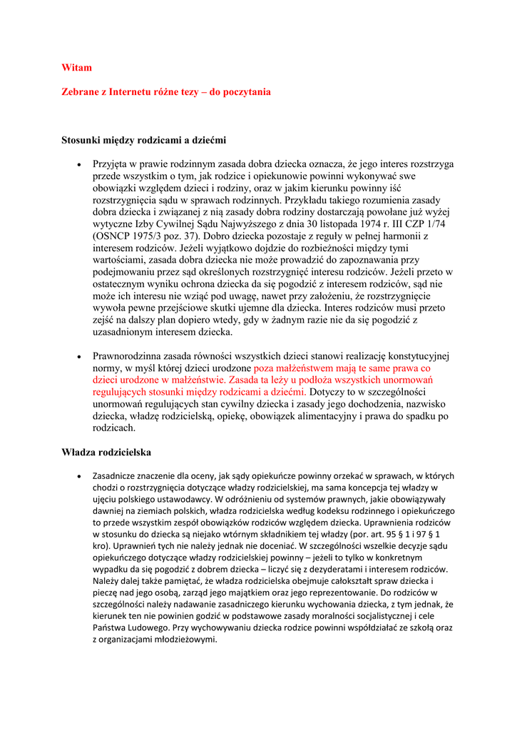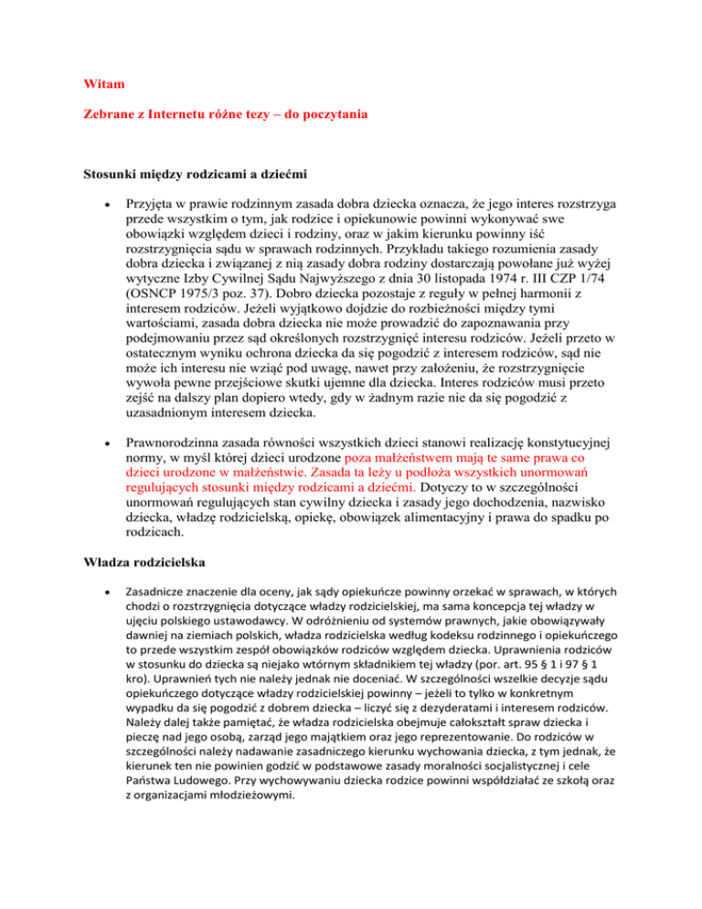 Witam Zebrane z Internetu różne tezy – do poczytania Stosunki między rodzicami a dziećmi Przyjęta w prawie rodzinnym zasada dobra dziecka oznacza, że jego interes rozstrzyga przede wszystkim o tym, jak rodzice i opiekunowie powinni wykonywać swe obowiązki względem dzieci i rodziny, oraz w jakim kierunku powinny iść rozstrzygnięcia sądu w sprawach rodzinnych. Przykładu takiego rozumienia zasady dobra dziecka i związanej z nią zasady dobra rodziny dostarczają powołane już wyżej wytyczne Izby Cywilnej Sądu Najwyższego z dnia 30 listopada 1974 r. III CZP 1/74 (OSNCP 1975/3 poz. 37). Dobro dziecka pozostaje z reguły w pełnej harmonii z interesem rodziców. Jeżeli wyjątkowo dojdzie do rozbieżności między tymi wartościami, zasada dobra dziecka nie może prowadzić do zapoznawania przy podejmowaniu przez sąd określonych rozstrzygnięć interesu rodziców. Jeżeli przeto w ostatecznym wyniku ochrona dziecka da się pogodzić z interesem rodziców, sąd nie może ich interesu nie wziąć pod uwagę, nawet przy założeniu, że rozstrzygnięcie wywoła pewne przejściowe skutki ujemne dla dziecka. Interes rodziców musi przeto zejść na dalszy plan dopiero wtedy, gdy w żadnym razie nie da się pogodzić z uzasadnionym interesem dziecka. Prawnorodzinna zasada równości wszystkich dzieci stanowi realizację konstytucyjnej normy, w myśl której dzieci urodzone poza małżeństwem mają te same prawa co dzieci urodzone w małżeństwie. Zasada ta leży u podłoża wszystkich unormowań regulujących stosunki między rodzicami a dziećmi. Dotyczy to w szczególności unormowań regulujących stan cywilny dziecka i zasady jego dochodzenia, nazwisko dziecka, władzę rodzicielską, opiekę, obowiązek alimentacyjny i prawa do spadku po rodzicach. Władza rodzicielska Zasadnicze znaczenie dla oceny, jak sądy opiekuńcze powinny orzekać w sprawach, w których chodzi o rozstrzygnięcia dotyczące władzy rodzicielskiej, ma sama koncepcja tej władzy w ujęciu polskiego ustawodawcy. W odróżnieniu od systemów prawnych, jakie obowiązywały dawniej na ziemiach polskich, władza rodzicielska według kodeksu rodzinnego i opiekuńczego to przede wszystkim zespół obowiązków rodziców względem dziecka. Uprawnienia rodziców w stosunku do dziecka są niejako wtórnym składnikiem tej władzy (por. art. 95 § 1 i 97 § 1 kro). Uprawnień tych nie należy jednak nie doceniać. W szczególności wszelkie decyzje sądu opiekuńczego dotyczące władzy rodzicielskiej powinny – jeżeli to tylko w konkretnym wypadku da się pogodzić z dobrem dziecka – liczyć się z dezyderatami i interesem rodziców. Należy dalej także pamiętać, że władza rodzicielska obejmuje całokształt spraw dziecka i pieczę nad jego osobą, zarząd jego majątkiem oraz jego reprezentowanie. Do rodziców w szczególności należy nadawanie zasadniczego kierunku wychowania dziecka, z tym jednak, że kierunek ten nie powinien godzić w podstawowe zasady moralności socjalistycznej i cele Państwa Ludowego. Przy wychowywaniu dziecka rodzice powinni współdziałać ze szkołą oraz z organizacjami młodzieżowymi. W wypadku nieprawidłowego wykonywania władzy rodzicielskiej – zarówno z przyczyn nie zawinionych, jak i zawinionych (co się zdarza znacznie częściej) przez rodziców – sąd opiekuńczy może skorzystać z szerokiego wachlarza środków zaradczych, zasadą bowiem jest, że sąd ten może wydać każde zarządzenie, jakie w danych okolicznościach jest ze względu na dobro dziecka konieczne lub celowe. W szczególności – poza środkami najbardziej drastycznymi w postaci pozbawienia władzy rodzicielskiej i jej zawieszenia oraz pozbawienia rodziców osobistej styczności z dzieckiem – sąd opiekuńczy może wydawać różnorodne zarządzenia należące do kategorii tzw. ograniczeń władzy rodzicielskiej w rozumieniu art. 109 kro. Do tych zarządzeń należą zwłaszcza te, które zostały wymienione w nowych, wprowadzonych przez nowelę z 19 grudnia 1975 r. przepisach art. 109 § 2 i 3 oraz 113 § 2 kro. Do szczególnie głęboko sięgających w sferę uprawnień rodziców należy ograniczenie ich władzy przez umieszczenie dziecka w rodzinie zastępczej lub w placówce opiekuńczowychowawczej. Dlatego środek ten powinien być stosowany dopiero wtedy, gdy inne zarządzenia nie dały pożądanego wyniku lub gdy ze względu na szczególne okoliczności sprawy można uznać, że takiego wyniku nie dadzą. Wydanie przeto takiej decyzji jest niezbędne, gdy środowisko rodzinne wywiera ujemny wpływ na wychowanie dziecka albo gdy rodzice nie są w stanie poradzić sobie z codziennymi problemami wychowawczymi. Decydując się na takie rozstrzygnięcie, sąd opiekuńczy powinien mieć na uwadze, że z reguły bardziej celowe jest umieszczenie dziecka w rodzinie zastępczej aniżeli w placówce opiekuńczo-wychowawczej, jak bowiem stwierdzają specjaliści, pobyt w takim zakładzie wywiera nieraz ujemny wpływ na psychikę dziecka; natomiast rodzina zastępcza stwarza dziecku – jeżeli tylko jest należycie dobrana – naturalne warunki rozwoju. Oddając dziecko rodzinie zastępczej, sąd opiekuńczy powinien pouczyć jej reprezentantów, że od tej chwili do nich należy obowiązek i prawo wykonywania bieżącej pieczy nad osobą małoletniego, jego wychowania, jego reprezentowania w dochodzeniu świadczeń przeznaczonych na zaspokajanie potrzeb związanych z utrzymaniem oraz że dotyczy to także dochodzenia alimentów od rodziców małoletniego (art. 1121 kro). Z praktycznego punktu widzenia istotne znaczenie mają także środki ingerencji w sferę władzy rodzicielskiej w postaci roztoczenia nadzoru nad wykonywaniem tej władzy przez rodziców. Oceniając celowość zastosowania tych środków, należy mieć na uwadze, że sąd opiekuńczy nie wykonuje opisanego nadzoru – tak jak w wypadku opieki – ex lege, lecz dopiero na podstawie swojej decyzji. Normując w ten spos