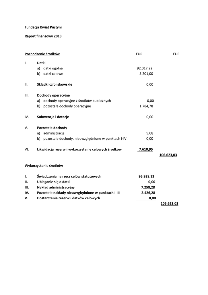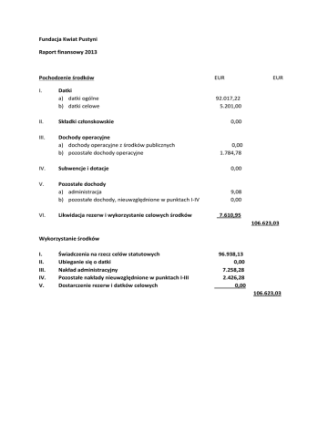 Fundacja Kwiat Pustyni Raport finansowy 2013 Pochodzenie środków I. Datki a) datki ogólne b) datki celowe II. Składki członskowskie III. Dochody operacyjne a) dochody operacyjne z środków publicznych b) pozostałe dochody operacyjne EUR EUR 92.017,22 5.201,00 0,00 0,00 1.784,78 IV. Subwencje i dotacje 0,00 V. Pozostałe dochody a) administracja b) pozostałe dochody, nieuwzględnione w punktach I-IV 9,08 0,00 VI. Likwidacja rezerw i wykorzystanie celowych środków 7.610,95 106.623,03 Wykorzystanie środków I. II. III. IV. V. Świadczenia na rzecz celów statutowych Ubieganie się o datki Nakład administracyjny Pozostałe nakłady nieuwzględnione w punktach I-III Dostarczenie rezerw i datków celowych 96.938,13 0,00 7.258,28 2.426,28 0,00 106.623,03