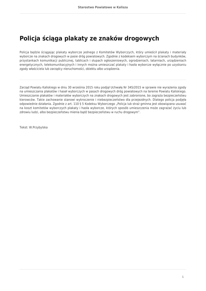 Starostwo Powiatowe w Kaliszu Policja ściąga plakaty ze znaków drogowych Policja będzie ściągając plakaty wyborcze jednego z Komitetów Wyborczych, który umieścił plakaty i materiały wyborcze na znakach drogowych w pasie dróg powiatowych. Zgodnie z kodeksem wyborczym na ścianach budynków, przystankach komunikacji publicznej, tablicach i słupach ogłoszeniowych, ogrodzeniach, latarniach, urządzeniach energetycznych, telekomunikacyjnych i innych można umieszczać plakaty i hasła wyborcze wyłącznie po uzyskaniu zgody właściciela lub zarządcy nieruchomości, obiektu albo urządzenia. Zarząd Powiatu Kaliskiego w dniu 30 września 2015 roku podjął Uchwałę Nr 345/2015 w sprawie nie wyrażenia zgody na umieszczania plakatów i haseł wyborczych w pasach drogowych dróg powiatowych na terenie Powiatu Kaliskiego. Umieszczanie plakatów i materiałów wyborczych na znakach drogowych jest zabronione, bo zagraża bezpieczeństwu kierowców. Takie zachowanie stanowi wykroczenie i niebezpieczeństwo dla przejezdnych. Dlatego policja podjęła odpowiednie działania. Zgodnie z art. 110 § 5 Kodeksu Wyborczego „Policja lub straż gminna jest obowiązana usuwać na koszt komitetów wyborczych plakaty i hasła wyborcze, których sposób umieszczenia może zagrażać życiu lub zdrowiu ludzi, albo bezpieczeństwu mienia bądź bezpieczeństwu w ruchu drogowym”. Tekst: W.Przybylska 1 Starostwo Powiatowe w Kaliszu 2