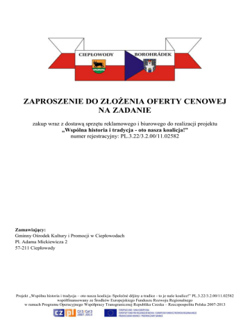 ZAPROSZENIE DO ZŁOŻENIA OFERTY CENOWEJ NA ZADANIE zakup wraz z dostawą sprzętu reklamowego i biurowego do realizacji projektu „Wspólna historia i tradycja - oto nasza koalicja!” numer rejestracyjny: PL.3.22/3.2.00/11.02582 Zamawiający: Gminny Ośrodek Kultury i Promocji w Ciepłowodach Pl. Adama Mickiewicza 2 57-211 Ciepłowody Projekt „Wspólna historia i tradycja – oto nasza koalicja /Společné dějiny a tradice - to je naše koalice!” PL.3.22/3.2.00/11.02582 współfinansowany ze Środków Europejskiego Funduszu Rozwoju Regionalnego w ramach Programu Operacyjnego Współpracy Transgranicznej Republika Czeska – Rzeczpospolita Polska 2007-2013 1. Zamawiający Gminny Ośrodek Kultury i Promocji w Ciepłowodach, Pl. Adama Mickiewicza 2, 57-211 Ciepłowody. Osobą upoważnioną do kontaktów z oferentami jest: Edyta Zielonka, tel. 74 80 03 274, mobile: 509 791 690, e-mail: [email protected] 2. Opis przedmiotu zamówienia: Przedmiotem zamówienia jest zakup wraz z dostawą do siedziby zamawiającego sprzętu reklamowego i biurowego niezbędnego do realizacji projektu „Wspólna historia i tradycja – oto nasza koalicja/Společné dějiny a tradice - to je naše koalice!” PL.3.22/3.2.00/11.02582, współfinansowanego ze Środków Europejskiego Funduszu Rozwoju Regionalnego w ramach Programu Operacyjnego Współpracy Transgranicznej Republika Czeska – Rzeczpospolita Polska 2007-2013. Szczegółowa charakterystyka: PRZENOŚNA TABLICA OBROTOWA szt.1 Rozmiar powierzchni użytkowej (szerokość x wysokość): 120 x 90 cm Rodzaj powierzchni: suchościeralno-magnetyczna lakierowana Rama: aluminium, podstawa jezdna aluminiowa, kółka z systemem blokującym wyposażona w plastikowe uchwyty do zawieszania bloku oraz holder na markery Maksymalna wysokość ze stojakiem: 190 cm, możliwość obrotu tablicy w poziomie o 360 stopni i zablokowania w dowolnej pozycji PRZENOŚNY STOJAK NA PLAKATY I ULOTKI REKLAMOWE szt.1 Konstrukcja: profil aluminiowy o szer. 32mm, blacha malowana proszkowo Wymiary: 1750mm x 510 x 550mm (wys x szer x gł) Wyposażony w tablicę przymykową (OWZ) do prezentacji plakatu z narożnikiem typu (T) lub (S) z plexi bezbarwnej zabezpieczonej folią antyrefleksyjną (maksymalny format plakatu A2) oraz 4 kieszenie na ulotki (format ulotek A4) SKŁADANY PRZENOŚNY STOJAK ZEWNĘTRZNY DWUSTRONNY OWZ (POTYKACZ) szt.1 Konstrukcja: profil aluminiowy o szer. 32mm, narożniki zaokrąglone, plecy - wysokoudarowe tworzywo sztuczne, powierzchnia ekspozycyjna - elastyczna płyta antyrefleksyjna, format plakatu: maksymalnie A2 3. Termin realizacji: do 13.04.2012r. Płatność: w terminie 14 dni od daty dostawy sprzętu i faktury VAT. 4. Warunki dopuszczające W postępowaniu mogą wziąć udział (złożyć ofertę) oferenci nie wykluczeni na podstawie art. 24 ustawy Prawo zamówień publicznych oraz spełniający warunki zawarte w art. 22 ust. 1 tejże ustawy. Potwierdzeniem spełnienia tych warunków jest złożenie pisemnego oświadczenia stanowiącego załącznik do formularza ofertowego. 5. Informacje dotyczące składania ofert 5.1 Postać oferty Oferta musi być napisana w języku polskim i zawierać szczegółowy kosztorys zawierający wyszczególnione wszystkie pozycje wymienione w opisie przedmiotu zamówienia, wszystkie podpisy muszą być czytelne i złożone przez osobę uprawnioną do występowania w imieniu wykonawcy. Wykonawca ma prawo złożyć tylko jedną ofertę. Do oferty należy załączyć rysunki techniczne sprzętów z opisami technicznymi. 5.2. Termin i miejsce składania ofert Oferty w zamkniętych kopertach ze wskazaniem jakiego zadania oferta dotyczy oraz podanym adresem zwrotnym należy dostarczyć do dnia 30.03.2012 r., do godz. 12:00 do siedziby Gminnego Ośrodka Kultury i Promocji w Ciepłowodach, Pl. A. Mickiewicza 2, 57-211 Ciepłowody, lub przesłać faksem na numer 74 81 03 274. Oferty wniesione po terminie nie będą rozpatrywane. Dla ofert przesłanych pocztą, przesyłką kurierską lub faksem liczy się data i godzina ich fizycznego dostarczenia do siedziby zamawiającego. 5.3. Kryteria oceny złożonych ofert: Oferty będą oceniane na podstawie następujących kryteriów: 80 % - cena, 20% - gwarancja i termin realizacji. 5.4. Ogłoszenie wyników Ogłoszenie o wyborze oferty zostanie zamieszczone na tablicy ogłoszeń w siedzibie zamawiającego. Niezależnie od tego wszyscy oferenci zostaną powiadomieni drogą elektroniczną lub telefonicznie. Zamawiający zastrzega sobie prawo do anulowania ogłoszenia bez podania przyczyny Zatwierdzam: Projekt „Wspólna historia i tradycja – oto nasza koalicja /Společné dějiny a tradice - to je naše koalice!” PL.3.22/3.2.00/11.02582 współfinansowany ze Środków Europejskiego Funduszu Rozwoju Regionalnego w ramach Programu Operacyjnego Współpracy Transgranicznej Republika Czeska – Rzeczpospolita Polska 2007-2013 OFERTA W ODPOWIEDZI NA OGŁOSZENIE O NABORZE OFERT na wykonanie zadania: „Zakup wraz z dostawą sprzętu reklamowego i biurowego do realizacji projektu Wspólna historia i tradycja - oto nasza koalicja! numer rejestracyjny: PL.3.22/3.2.00/11.02582 w ramach Programu Operacyjnego Współpracy Transgranicznej Republika Czeska - Rzeczpospolita Polska 2007 – 2013” ..........................., ....................................... miejscowość, data ........................................................ dane oferenta Zamawiający Gminny Ośrodek Kultury i Promocji w Ciepłowodach Pl. Adama Mickiewicza 2 57-211 Ciepłowody W odpowiedzi na ogłoszenie opublikowane przez Gminny Ośrodek Kultury i Promocji w Ciepłowodach na wykonania zadania „Zakup wraz z dostawą sprzętu reklamowego i biurowego do realizacji projektu Wspólna historia i tradycja - oto nasza koalicja! Numer rejestracyjny: PL.3.22/3.2.00/11.02582 w ramach Programu Operacyjnego Współpracy Transgranicznej Republika Czeska - Rzeczpospolita Polska 2007 – 2013”, przedkładam niniejszą ofertę, ośw