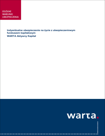 Indywidualne ubezpieczenie na życie z ubezpieczeniowym funduszem kapitałowym WARTA Aktywny Kapitał Indywidualne ubezpieczenie na życie z ubezpieczeniowym funduszem kapitałowym WARTA Aktywny Kapitał 1 Informacja do Ogólnych Warunków Ubezpieczenia Indywidualne ubezpieczenie na życie z ubezpieczeniowym funduszem kapitałowym WARTA Aktywny Kapitał, zatwierdzonych Uchwałą nr 305/2016 Zarządu TUnŻ „WARTA” S.A. i wprowadzonych w życie z dniem 23 listopada 2016 r., sporządzona zgodnie z art. 17 Ustawy o działalności ubezpieczeniowej i reasekuracyjnej. RODZAJ INFORMACJI 1. Przesłanki wypłaty odszkodowania NUMER JEDNOSTKI REDAKCYJNEJ Z WZORCA UMOWNEGO § 2 ust. 2 OWU i innych świadczeń lub wartości wykupu § 4 OWU ubezpieczenia § 16 OWU 2. Ograniczenia oraz wyłączenia odpowiedzialności zakładu ubezpieczeń uprawniające do odmowy § 11 OWU wypłaty odszkodowania i innych świadczeń lub ich obniżenia 3. Koszty oraz inne obciążenia potrącane ze składek ubezpieczeniowych, z aktywów ubezpieczeniowych § 14 OWU funduszy kapitałowych lub poprzez Załącznik nr 2 do OWU umorzenie jednostek uczestnictwa (Zestawienie opłat, limitów i funduszy) ubezpieczeniowych funduszy kapitałowych 4. Wartość wykupu ubezpieczenia w poszczególnych okresach trwania ochrony ubezpieczeniowej oraz okres, § 16 OWU w którym roszczenie o wypłatę wartości wykupu nie przysługuje Indywidualne ubezpieczenie na życie z ubezpieczeniowym funduszem kapitałowym WARTA Aktywny Kapitał 2 Ogólne Warunki Ubezpieczenia Indywidualne ubezpieczenie na życie z ubezpieczeniowym funduszem kapitałowym WARTA Aktywny Kapitał Kod: IUSCITI1/11/2016 POSTANOWIENIA OGÓLNE §1 1. Niniejsze Ogólne Warunki Ubezpieczenia Indywidualne ubezpieczenie na życie z ubezpieczeniowym funduszem kapitałowym WARTA Aktywny Kapitał (zwane dalej OWU) stosuje się w umowach ubezpieczenia zawieranych przez Towarzystwo Ubezpieczeń na Życie „WARTA” S.A., z ubezpieczającymi, za pośrednictwem agenta. 2. W niniejszych OWU mają zastosowanie następujące definicje: 1) agent – agent ubezpieczeniowy w rozumieniu przepisów Ustawy o pośrednictwie ubezpieczeniowym z dnia 22 maja 2003 roku, którym jest Bank Handlowy w Warszawie Spółka Akcyjna z siedzibą w Warszawie, działający w imieniu i na rzecz ubezpieczyciela; 2) dzień roboczy – dzień tygodnia od poniedziałku do piątku, z wyłączeniem dni ustawowo wolnych od pracy w rozumieniu prawa polskiego oraz z wyłączeniem dni wolnych od pracy określonych przez Zarząd Spółki TUnŻ „WARTA” S.A. Informację o dniach wolnych od pracy ubezpieczyciel przekazuje ubezpieczającemu na jego żądanie; 3) fundusz – wydzielona część aktywów ubezpieczyciela; fundusz, o którym mowa w niniejszych OWU, jest ubezpieczeniowym funduszem kapitałowym w rozumieniu ustawy o działalności ubezpieczeniowej i reasekuracyjnej (Dz.U. z 2015, poz. 1844); 4) indywidualne konto inwestycyjne – indywidualne konto inwestycyjne składki jednorazowej i indywidualne konto inwestycyjne składek dodatkowych; 5) indywidualne konto inwestycyjne składki jednorazowej – część indywidualnego konta inwestycyjnego, na którym ewidencjonowane są jednostki uczestnictwa zakupione za składkę jednorazową; 6) indywidualne konto inwestycyjne składek dodatkowych – część indywidualnego konta inwestycyjnego, na którym ewidencjonowane są jednostki uczestnictwa zakupione za składki dodatkowe; 7) miesiąc ubezpieczeniowy – pierwszy miesiąc ubezpieczeniowy to miesiąc rozpoczynający się w dniu zawarcia umowy ubezpieczenia; kolejne miesiące ubezpieczeniowe to miesiące rozpoczynające się w takim samym dniu każdego następnego miesiąca kalendarzowego; jeśli w danym miesiącu taki dzień nie istnieje – wtedy w ostatnim dniu miesiąca kalendarzowego; 8) nabywanie jednostek uczestnictwa – przeliczanie środków pieniężnych pochodzących ze składek na jednostki uczestnictwa funduszu; 9) polisa – dokument ubezpieczenia, w rozumieniu art. 809 kodeksu cywilnego, który jest dowodem zawarcia umowy ubezpieczenia i objęcia ochroną ubezpieczeniową na zasadach określonych w OWU; 10) rocznica ubezpieczenia – rocznica zawarcia umowy ubezpieczenia, tj. dzień, który datą odpowiada dniowi zawarcia umowy ubezpieczenia. Jeśli umowa ubezpieczenia jest zawierana 29 lutego, przyjmuje się, iż każdy rok obowiązywania umowy ubezpieczenia kończy się z upływem przedostatniego dnia lutego; 11) rok ubezpieczeniowy – okres pomiędzy kolejnymi rocznicami ubezpieczenia; 12) składka dodatkowa – składka, którą ubezpieczający opłaca w dowolnych terminach w czasie obowiązywania umowy ubezpieczenia, z zastrzeżeniem, iż wysokość składki dodatkowej nie może być niższa niż minimalna kwota składki dodatkowej określona w zestawieniu opłat, limitów i funduszy; 13) składka jednorazowa – składka, w wysokości wskazanej we wniosku o zawarcie umowy ubezpieczenia płatna przez ubezpieczającego z zastrzeżeniem, iż wysokość wpłaty nie może być niższa niż minimalna kwota składki jednorazowej określona w zestawieniu opłat, limitów i funduszy; 14) statek powietrzny – urządzenie zdefiniowane jako statek powietrzny zgodnie z ustawą prawo lotnicze, należący do przewoźnika lotniczego (działającego zgodnie z przepisami prawa lotniczego), posiadający aktualne dokumenty potwierdzające zdatność statku powietrznego do przewozów lotniczych; 15) statek wodny – urządzenie pływające o napędzie mechanicznym lub bez napędu mechanicznego (w tym prom, wodolot, poduszkowiec) przeznaczone lub używane w żegludze Indywidualne ubezpieczenie na życie z ubezpieczeniowym funduszem kapitałowym WARTA Aktywny Kapitał 3 16) 17) 18) 19) 20) 21) 22) 23) 24) 25) 26) 27) 28) 29) 30) 31) 32) śródlądowej lub morskiej, w rozumieniu przepisów ustawy o żegludze śródlądowej lub kodeksu morskiego, posiadające dokumenty rejestracyjne w myśl obowiązujących prz