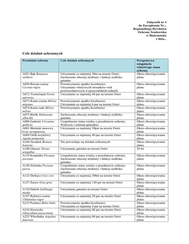 Załącznik nr 4 do Zarządzenia Nr... Regionalnego Dyrektora Ochrony Środowiska w Białymstoku z dnia... Cele działań ochronnych Przedmiot ochrony Cele działań ochronnych A021 Bąk Botaurus stellaris Utrzymanie co najmniej 30m na terenie Ostoi; Zachowanie obecnej struktury i funkcji siedliska gatunku Powstrzymanie spadku liczebności; Utrzymanie właściwych stosunków wód powierzchniowych w puszczańskich ciekach; Utrzymanie co najmniej 60 par na terenie Ostoi A030 Bocian czarny Ciconia nigra A072 Trzmielojad Pernis apivorus A073 Kania czarna Milvus migrans A074 Kania ruda Milvus milvus A075 Bielik Haliaeetus albicilla A080 Gadożer Circaetus gallicus A081 Błotniak stawowy Circus aeruginosus A089 Orlik krzykliwy Aquila pomarina A104 Jarząbek Bonasa bonasia A108 Głuszec Tetrao urogallus A119 Kropiatka Porzana porzana Powstrzymanie spadku liczebności; Utrzymanie co najmniej 6 par na terenie Ostoi Powstrzymanie spadku liczebności Zachowanie obecnej struktury i funkcji siedliska gatunku Uzupełnienie stanu wiedzy o przedmiocie ochrony; Wykrycie i ochrona gniazd(a) Utrzymanie co najmniej 50par na terenie Ostoi Utrzymanie co najmniej 40 par na terenie Ostoi Nie przewiduje się działań ochronnych Utrzymanie gatunku na terenie Ostoi A122 Derkacz Crex crex Uzupełnienie stanu wiedzy o przedmiocie ochrony; Zachowanie obecnej struktury i funkcji siedliska gatunku Uzupełnienie stanu wiedzy o przedmiocie ochrony; Zachowanie obecnej struktury i funkcji siedliska gatunku Utrzymanie co najmniej 300m na terenie Ostoi A127 Żuraw Grus grus Utrzymanie co najmniej 120 par na terenie Ostoi A154 Dubelt Gallinago media A197 Rybitwa czarna Chlidonias niger A215 Puchacz Bubo bubo Utrzymanie gatunku na terenie Ostoi A120 Zielonka Porzana parva A216 Sóweczka Glaucidium passerinum A223 Włochatka Aegolius funereus Utrzymanie co najmniej 20 par na terenie Ostoi Powstrzymanie spadku liczebności; Utrzymanie co najmniej 4 par na terenie Ostoi Utrzymanie co najmniej 40 par na terenie Ostoi Utrzymanie co najmniej 60 par na terenie Ostoi Perspektywa osiągnięcia właściwego stanu ochrony Okres obowiązywania planu Okres obowiązywania planu Okres obowiązywania planu Okres obowiązywania planu Okres obowiązywania planu Okres obowiązywania planu Okres obowiązywania planu Okres obowiązywania planu Okres obowiązywania planu Okres obowiązywania planu 20 lat Okres obowiązywania planu Okres obowiązywania planu Okres obowiązywania planu Okres obowiązywania planu Okres obowiązywania planu Okres obowiązywania planu Okres obowiązywania planu Okres obowiązywania planu Okres obowiązywania planu A224 Lelek Caprimulgus europaeus A229 Zimorodek Alcedo atthis A234 Dzięcioł zielonosiwy Picus canus A236 Dzięcioł czarny Dryocopus martius A238 Dzięcioł średni Dendrocopos medius A239 Dzięcioł białogrzbiety Dendrocopos leucotos A241 Dzięcioł trójpalczasty Picoides tridactylus A246 Lerka Lullula arborea A338 Gąsiorek Lanius collurio A409 Cietrzew Tetrao tetrix A005 Perkoz dwuczuby Podiceps cristatus A067 Gągoł Bucephala clangula A070 Nurogęś Mergus merganser A125 Łyska Fulica atra A153 Kszyk Gallinago gallinago A165 Samotnik Tringa ochropus A207 Siniak Columba oenas A232 Dudek Upupa epops A298 Trzciniak Acrocephalus arundinaceus A369 Krzyżodziób świerkowy Loxia curvirostra A371 Dziwonia Carpodacus erythrinus Nie przewiduje się działań ochronnych Nie przewiduje się działań ochronnych Utrzymanie co najmniej 30 par na terenie Ostoi Utrzymanie co najmniej 250 par na terenie Ostoi Utrzymanie co najmniej 80 par na terenie Ostoi Utrzymanie co najmniej 20 par na terenie Ostoi Okres obowiązywania planu Okres obowiązywania planu Okres obowiązywania planu Okres obowiązywania planu Okres obowiązywania planu Okres obowiązywania planu Utrzymanie co najmniej 25 par na terenie Ostoi Okres obowiązywania planu Nie przewiduje się działań ochronnych Okres obowiązywania planu Okres obowiązywania planu 20 lat Nie przewiduje się działań ochronnych Uzupełnienie stanu wiedzy o przedmiocie ochrony; Monitorowanie siedlisk pod kątem powrotu gatunku; Odtworzenie siedlisk gatunku Nie przewiduje się działań ochronnych Utrzymanie co najmniej 150 par na terenie Ostoi Utrzymanie co najmniej 60 par na terenie Ostoi Nie przewiduje się działań ochronnych Utrzymanie co najmniej 200m na terenie Ostoi Nie przewiduje się działań ochronnych Utrzymanie co najmniej 150 par na terenie Ostoi Nie przewiduje się działań ochronnych Nie przewiduje się działań ochronnych Okres obowiązywania planu Okres obowiązywania planu Okres obowiązywania planu Okres obowiązywania planu Okres obowiązywania planu Okres obowiązywania planu Okres obowiązywania planu Okres obowiązywania planu Okres obowiązywania planu Nie przewiduje się działań ochronnych Okres obowiązywania planu Nie przewiduje się działań ochronnych Okres obowiązywania planu