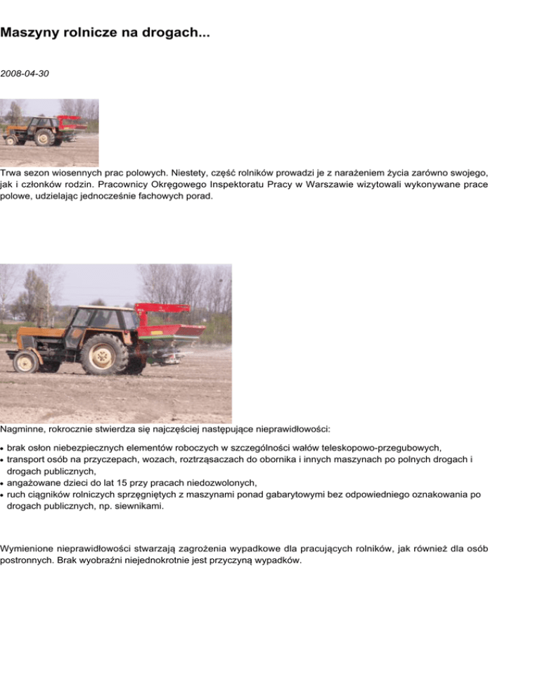Maszyny rolnicze na drogach... 2008-04-30 Trwa sezon wiosennych prac polowych. Niestety, część rolników prowadzi je z narażeniem życia zarówno swojego, jak i członków rodzin. Pracownicy Okręgowego Inspektoratu Pracy w Warszawie wizytowali wykonywane prace polowe, udzielając jednocześnie fachowych porad. Nagminne, rokrocznie stwierdza się najczęściej następujące nieprawidłowości: ● ● ● ● brak osłon niebezpiecznych elementów roboczych w szczególności wałów teleskopowo-przegubowych, transport osób na przyczepach, wozach, roztrząsaczach do obornika i innych maszynach po polnych drogach i drogach publicznych, angażowane dzieci do lat 15 przy pracach niedozwolonych, ruch ciągników rolniczych sprzęgniętych z maszynami ponad gabarytowymi bez odpowiedniego oznakowania po drogach publicznych, np. siewnikami. Wymienione nieprawidłowości stwarzają zagrożenia wypadkowe dla pracujących rolników, jak również dla osób postronnych. Brak wyobraźni niejednokrotnie jest przyczyną wypadków.