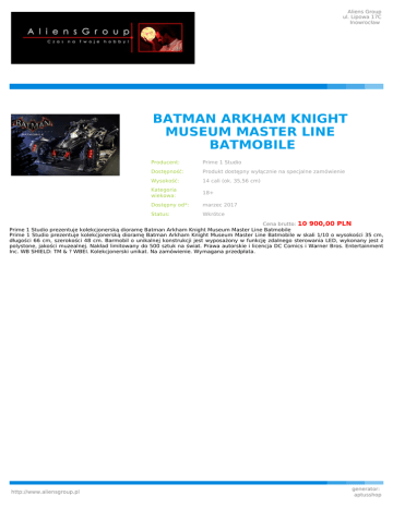 Aliens Group ul. Lipowa 17C Inowrocław BATMAN ARKHAM KNIGHT MUSEUM MASTER LINE BATMOBILE Producent: Prime 1 Studio Dostępność: Produkt dostępny wyłącznie na specjalne zamówienie Wysokość: 14 cali (ok. 35,56 cm) Kategoria wiekowa: 18+ Dostępny od*: marzec 2017 Status: Wkrótce Cena brutto: 10 900,00 PLN Prime 1 Studio prezentuje kolekcjonerską dioramę Batman Arkham Knight Museum Master Line Batmobile Prime 1 Studio prezentuje kolekcjonerską dioramę Batman Arkham Knight Museum Master Line Batmobile w skali 1/10 o wysokości 35 cm, długości 66 cm, szerokości 48 cm. Barmobil o unikalnej konstrukcji jest wyposażony w funkcję zdalnego sterowania LED, wykonany jest z polystone, jakości muzealnej. Nakład limitowany do 500 sztuk na świat. Prawa autorskie i licencja DC Comics i Warner Bros. Entertainment Inc. WB SHIELD: TM & ? WBEI. Kolekcjonerski unikat. Na zamówienie. Wymagana przedpłata. http://www.aliensgroup.pl generator: aptusshop