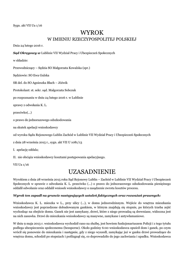 Sygn. akt VII Ua 1/16 WYROK W IMIENIU RZECZYPOSPOLITEJ POLSKIEJ Dnia 24 lutego 2016 r. Sąd Okręgowy w Lublinie VII Wydział Pracy i Ubezpieczeń Społecznych w składzie: Przewodniczący – Sędzia SO Małgorzata Kowalska (spr.) Sędziowie: SO Ewa Gulska SR del. do SO Agnieszka Błach – Jóźwik Protokolant: st. sekr. sąd. Małgorzata Sobczuk po rozpoznaniu w dniu 24 lutego 2016 r. w Lublinie sprawy z odwołania K. L. przeciwko(...) o prawo do jednorazowego odszkodowania na skutek apelacji wnioskodawcy od wyroku Sądu Rejonowego Lublin Zachód w Lublinie VII Wydział Pracy i Ubezpieczeń Społecznych z dnia 28 września 2015 r., sygn. akt VII U 1081/13 I. apelację oddala; II. nie obciąża wnioskodawcy kosztami postępowania apelacyjnego. VII Ua 1/16 UZASADNIENIE Wyrokiem z dnia 28 września 2015 roku Sąd Rejonowy Lublin – Zachód w Lublinie VII Wydział Pracy i Ubezpieczeń Społecznych w sprawie z odwołania K. L. przeciwko (...) o prawo do jednorazowego odszkodowania pieniężnego oddalił odwołanie oraz oddalił wniosek wnioskodawcy o zasądzenie zwrotu kosztów procesu. Wyrok ten zapadł na gruncie następujących ustaleń faktycznych oraz rozważań prawnych: Wnioskodawca K. L. mieszka w L., przy ulicy (...), w domu jednorodzinnym. Wejście do wnętrza mieszkania wnioskodawcy jest poprzedzone dobudowanym gankiem, w którym znajdują się stopnie, po których trzeba zejść wychodząc na obejście domu. Ganek nie jest zamykany, drzwi, które z niego prowadzą są drewniane, widoczna jest na nich zasuwka. Drzwi do mieszkania wnioskodawcy są masywne, zamykane i antywłamaniowe. W dniu 9 maja 2013 r. wnioskodawca wychodził rano na służbę, jest bowiem funkcjonariuszem Policji i z tego tytułu podlega ubezpieczeniu społecznemu (bezsporne). Około godziny 6:00 wnioskodawca opuścił dom i ganek, po czym wrócił się ponownie do mieszkania i następnie, gdy z niego wyszedł, zamykając już w ganku drzwi prowadzące do wnętrza domu, schodził po stopniach i poślizgnął się, co doprowadziło do jego zachwiania i upadku. Wnioskodawca „przeleciał” przez drzwi drewniane ganku, uderzając się we framugę drzwi i upadł na utwardzone podłoże przed domem, gdzie znalazła go żona. Na skutek upadku wnioskodawca doznał urazu w postaci skręcenia lewego kolana i złamania fragmentu podstawy paliczka bliższego prawego palucha, co spowodowało u wnioskodawcy 5% długotrwały uszczerbek na zdrowiu. Powyższy stan faktyczny Sąd pierwszej instancji ustalił na podstawie wie wskazanych wyżej dowodów oraz opinii biegłego. Żadna ze stron nie kwestionowała przywołanej opinii biegłego. Również Sąd Rejonowy uznał ją za miarodajną do rozstrzygnięcia. Opinia została sporządzona przez doświadczonego biegłego-specjalistę i brak podstaw do stwierdzenia, że wnioski z niej płynące nie zasługują na ich przyjęcie. Biegły wyraźnie określił stan zdrowia wnioskodawcy oraz stosowanie do posiadanej wiedzy i doświadczenia ustalił, że uszczerbek na zdrowiu doznany przez wnioskodawcę należy określić na 5%. Biegły wskazał także wyraźnie, że jest to uszczerbek długotrwały. Jak wskazał Sąd pierwszej instancji, przeprowadzone postępowanie dowodowe wykazało bezsprzecznie, że wnioskodawca poślizgnął się wewnątrz ganku, który prowadzi dopiero do wnętrza jego domu (mieszkania), bowiem aby się do niego dostać należy pokonać drzwi antywłamaniowe. Tymczasem ganek, z którego wchodzi się do mieszkania, to jakby „wiatrołap”, zaś drzwi go zamykające, to drzwi drewniane (na zdjęciu widać zasuwkę). Wnioskodawca po poślizgnięciu się na stopniach „przeleciał” niejako przez otwór w tym ganku i upadł już poza nim na zewnątrz uderzając w trakcie przemieszczania się poza ganek na skutek siły, która powstała, we framugę drzwi ganku. W tym kontekście, zdaniem Sądu Rejonowego brak jest podstaw do przyjęcia, że wnioskodawca stworzył sobie wersję wydarzeń w taki sposób, by przybliżyć się do przyjęcia wersji o wypadku w drodze na służbę. Wnioskodawca wyjaśnił, że mówiąc o uderzeniu miał na myśli framugę drzwi, jednak poślizgnięcie się nastąpiło na stopniu w ganku i temu wnioskodawca nie przeczył. Wizja lokalna na miejscu zdarzenia, którą przeprowadził pozwany także wskazała miejsce, w którym doszło do poślizgnięcia się (zob. zdjęcia – k.12-13 - w aktach postępowania wyjaśniającego prowadzonego przez pozwanego). Dodatkowo, nie może w tym zakresie być miarodajną dokumentacja medyczna, bowiem, jak wskazał Sąd Rejonowy doświadczenie życiowe wskazuje jednoznacznie, że na skutek bolesnych zdarzeń, przy zbieraniu wywiadu od pacjenta następuje przede wszystkim podanie skróconej wersji zdarzenia, a ponadto żaden pacjent nie zwraca uwagi na to, jakich wpisów dokładnie dokonuje lekarz, niejednokrotnie także zmieniając wypowiadany sens opisu przez pacjenta. W niniejszej sprawie wnioskodawca również nie zawracał uwagi na to, co w kartę wpisuje przyjmujący go lekarz. Dodatkowo, Sąd pierwszej instancji podkreślił, że we wnętrzu domu wnioskodawcy nie ma żadnych innych schodów, poza tymi, które znajdują się w ganku. Jednocześnie, jak zeznała żona wnioskodawcy, znalazła męża po upadku na zewnątrz ganku, co potwierdza fakt upadku wnioskodawcy i składa się na logiczną całość, jeśli chodzi o miejsce, w którym zdarzenie zostało zainicjowane na skutek niefortunnego stąpnięcia. Sąd Rejonowy obdarzył wiarą zeznania przesłuchanych w sprawie świadków:A. Ł., A. T., G. K.,, A. L., wskazując iż były one szczere i spójne, brak było podstaw by odmówić tym dowodom wiarygodności. Sąd dał wiarę także wnioskodawcy, który w ocenie tego Sądu szczerze opisał, co zaszło i co znalazło potwierdzenie w zgromadzonym materiale dowodowym. Sporna była jednak ocena, czy ganek – przybudówka, w którym przewrócił się wnioskodawca, to wnętrze domu, czy też nie