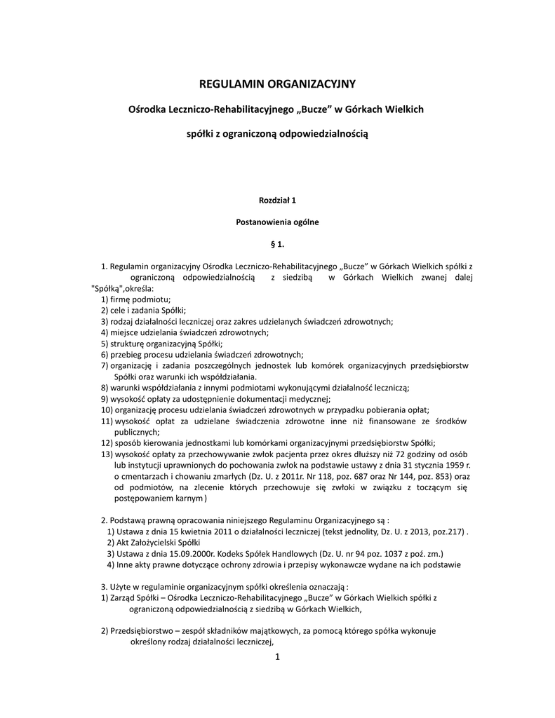 REGULAMIN ORGANIZACYJNY Ośrodka Leczniczo-Rehabilitacyjnego „Bucze” w Górkach Wielkich spółki z ograniczoną odpowiedzialnością Rozdział 1 Postanowienia ogólne § 1. 1. Regulamin organizacyjny Ośrodka Leczniczo-Rehabilitacyjnego „Bucze” w Górkach Wielkich spółki z ograniczoną odpowiedzialnością z siedzibą w Górkach Wielkich zwanej dalej "Spółką",określa: 1) firmę podmiotu; 2) cele i zadania Spółki; 3) rodzaj działalności leczniczej oraz zakres udzielanych świadczeń zdrowotnych; 4) miejsce udzielania świadczeń zdrowotnych; 5) strukturę organizacyjną Spółki; 6) przebieg procesu udzielania świadczeń zdrowotnych; 7) organizację i zadania poszczególnych jednostek lub komórek organizacyjnych przedsiębiorstw Spółki oraz warunki ich współdziałania. 8) warunki współdziałania z innymi podmiotami wykonującymi działalność leczniczą; 9) wysokość opłaty za udostępnienie dokumentacji medycznej; 10) organizację procesu udzielania świadczeń zdrowotnych w przypadku pobierania opłat; 11) wysokość opłat za udzielane świadczenia zdrowotne inne niż finansowane ze środków publicznych; 12) sposób kierowania jednostkami lub komórkami organizacyjnymi przedsiębiorstw Spółki; 13) wysokość opłaty za przechowywanie zwłok pacjenta przez okres dłuższy niż 72 godziny od osób lub instytucji uprawnionych do pochowania zwłok na podstawie ustawy z dnia 31 stycznia 1959 r. o cmentarzach i chowaniu zmarłych (Dz. U. z 2011r. Nr 118, poz. 687 oraz Nr 144, poz. 853) oraz od podmiotów, na zlecenie których przechowuje się zwłoki w związku z toczącym się postępowaniem karnym ) 2. Podstawą prawną opracowania niniejszego Regulaminu Organizacyjnego są : 1) Ustawa z dnia 15 kwietnia 2011 o działalności leczniczej (tekst jednolity, Dz. U. z 2013, poz.217) . 2) Akt Założycielski Spółki 3) Ustawa z dnia 15.09.2000r. Kodeks Spółek Handlowych (Dz. U. nr 94 poz. 1037 z poź. zm.) 4) Inne akty prawne dotyczące ochrony zdrowia i przepisy wykonawcze wydane na ich podstawie 3. Użyte w regulaminie organizacyjnym spółki określenia oznaczają : 1) Zarząd Spółki – Ośrodka Leczniczo-Rehabilitacyjnego „Bucze” w Górkach Wielkich spółki z ograniczoną odpowiedzialnością z siedzibą w Górkach Wielkich, 2) Przedsiębiorstwo – zespół składników majątkowych, za pomocą którego spółka wykonuje określony rodzaj działalności leczniczej, 1 3) Medyczna komórka organizacyjna – komórka organizacyjna pionu działalności podstawowej (leczniczej Spółki, której zadaniem jest udzielanie świadczeń zdrowotnych) Rozdział 2 Firma podmiotu § 2. 1) Spółka działa pod firmą: Ośrodek Leczniczo-Rehabilitacyjny „Bucze” w Górkach Wielkich spółka z ograniczoną odpowiedzialnością 2) Spółka może używać nazwy skróconej: OLR „Bucze” sp. z o.o. Cel działania i zadania Spółki § 3. Celem Spółki jest udzielanie świadczeń zdrowotnych oraz promocja zdrowia . § 4. 1. Do zadań Spółki należy: 1) udzielanie świadczeń zdrowotnych w rodzajach określonych w paragrafie 5 i zakresach określonych w paragrafie 6 niniejszego Regulaminu Organizacyjnego, 2) zapewnienie całodobowej opieki pielęgniarskiej w oddziałach, 3) zapewnienie całodobowej opieki lekarskiej w oddziałach, 4) zapewnienie wykonywania niezbędnych procedur rehabilitacyjnych i fizjoterapeutycznych, 5) upowszechnianie edukacji zdrowotnej promocji zdrowia ukierunkowanej zgodnie z zakresem udzielanych świadczeń zdrowotnych, 6) udzielanie pacjentom i ich rodzinom (opiekunom) wskazówek, co do dalszego postępowania leczniczego, po zakończeniu leczenia w medycznych komórkach organizacyjnych Spółki. 2. Spółka może prowadzić wydzieloną działalność gospodarczą, która nie może być uciążliwa dla pacjenta lub przebiegu leczenia. 3. Spółka realizuje zadania obronne zgodnie z obowiązującą regulacją prawną - zawarte one są w Planie przygotowań Ośrodka Leczniczo-Rehabilitacyjnego „Bucze“ w Górkach Wielkich sp. z o.o. na potrzeby obronne Państwa. Rozdział 3 Rodzaj działalności leczniczej oraz zakres i miejsce udzielanych świadczeń zdrowotnych § 5. Spółka prowadzi działalność leczniczą w rodzaju: 1) stacjonarne i całodobowe świadczenia zdrowotne szpitalne 2) ambulatoryjne świadczenia zdrowotne § 6. Ośrodek udziela świadczeń zdrowotnych w zakresach: 1) stacjonarnej rehabilitacji chorób płuc dla dzieci, 2 2) stacjonarnej rehabilitacji ogólnoustrojowej dla dzieci, 3) poradni rehabilitacyjnej; 4) ambulatoryjnych świadczeń rehabilitacyjnych; 5) niezbędnej diagnostyki medycznej (spirometria, ergospirometria, testy uczuleniowe), 6) niezbędnej analityki medycznej - wykonywanej przez podmiot zewnętrzny, na podstawie odrębnej umowy, 7) profilaktyki i promocji zdrowia. § 7. Miejscem udzielania świadczeń zdrowotnych o których mowa w paragrafie 5 są Górki Wielkie (43- 436), ul. Harcerska 31. Rozdział 4 Struktura organizacyjna Spółki § 8. a) Organami Spółki są: 1) Zgromadzenie Wspólników 2) Rada Nadzorcza 3) Zarząd 2. W ramach struktury organizacyjnej spółki z ograniczoną odpowiedzialnością działa podmiot leczniczy Ośrodek Leczniczo-Rehabilitacyjny „Bucze” wykonujący działalność medyczną w dwóch przedsiębiorstwach oraz w ramach funkcjonujących medycznych stanowisk organizacyjnych. 1) W skład Przedsiębiorstwa Ośrodek Leczniczo-Rehabilitacyjny „Bucze” sp. z o.o. wchodzą następujące komórki organizacyjne i samodzielne stanowiska: a) Oddział rehabilitacji pulmonologicznej dla dzieci - 63 łóżka (w tym łóżka w pokojach dla dzieci pod nadzorem opiekuna zlokalizowane w Pawilonie Matki i Dziecka w ilości zależnej od aktualnych potrzeb), w ramach którego zawarte jest jedno łóżko intensywnej opieki medycznej oraz gabinet zabiegów pielęgniarskich z punktem pobierania materiałów do badań laboratoryjnych b) Oddział rehabilitacji ogólnoustrojowej dla dzieci 