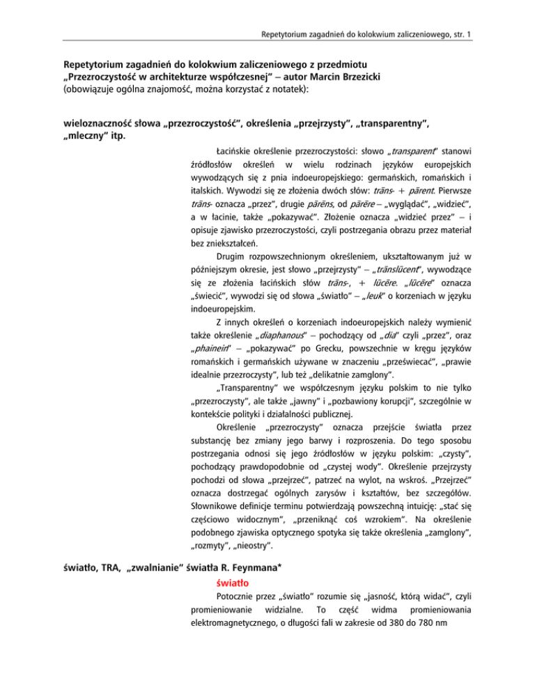 Repetytorium zagadnień do kolokwium zaliczeniowego, str. 1 Repetytorium zagadnień do kolokwium zaliczeniowego z przedmiotu „Przezroczystość w architekturze współczesnej” – autor Marcin Brzezicki (obowiązuje ogólna znajomość, można korzystać z notatek): wieloznaczność słowa „przezroczystość”, określenia „przejrzysty”, „transparentny”, „mleczny” itp. Łacińskie określenie przezroczystości: słowo „transparent” stanowi źródłosłów określeń w wielu rodzinach języków europejskich wywodzących się z pnia indoeuropejskiego: germańskich, romańskich i italskich. Wywodzi się ze złożenia dwóch słów: trāns- + pārent. Pierwsze trāns- oznacza „przez”, drugie pārēns, od pārēre – „wyglądać”, „widzieć”, a w łacinie, także „pokazywać”. Złożenie oznacza „widzieć przez” – i opisuje zjawisko przezroczystości, czyli postrzegania obrazu przez materiał bez zniekształceń. Drugim rozpowszechnionym określeniem, ukształtowanym już w późniejszym okresie, jest słowo „przejrzysty” – „trānslūcent”, wywodzące się ze złożenia łacińskich słów trāns-, + lūcēre. „lūcēre” oznacza „świecić”, wywodzi się od słowa „światło” – „leuk” o korzeniach w języku indoeuropejskim. Z innych określeń o korzeniach indoeuropejskich należy wymienić także określenie „diaphanous” – pochodzący od „dia” czyli „przez”, oraz „phainein” – „pokazywać” po Grecku, powszechnie w kręgu języków romańskich i germańskich używane w znaczeniu „przeświecać”, „prawie idealnie przezroczysty”, lub też „delikatnie zamglony”. „Transparentny” we współczesnym języku polskim to nie tylko „przezroczysty”, ale także „jawny” i „pozbawiony korupcji”, szczególnie w kontekście polityki i działalności publicznej. Określenie „przezroczysty” oznacza przejście światła przez substancję bez zmiany jego barwy i rozproszenia. Do tego sposobu postrzegania odnosi się jego źródłosłów w języku polskim: „czysty”, pochodzący prawdopodobnie od „czystej wody”. Określenie przejrzysty pochodzi od słowa „przejrzeć”, patrzeć na wylot, na wskroś. „Przejrzeć” oznacza dostrzegać ogólnych zarysów i kształtów, bez szczegółów. Słownikowe definicje terminu potwierdzają powszechną intuicję: „stać się częściowo widocznym”, „przeniknąć coś wzrokiem”. Na określenie podobnego zjawiska optycznego spotyka się także określenia „zamglony”, „rozmyty”, „nieostry”. światło, TRA, „zwalnianie” światła R. Feynmana* światło Potocznie przez „światło” rozumie się „jasność, którą widać”, czyli promieniowanie widzialne. To część widma promieniowania elektromagnetycznego, o długości fali w zakresie od 380 do 780 nm Repetytorium zagadnień do kolokwium zaliczeniowego, str. 2 Światło w każdym ośrodku rozchodzi się z inną prędkością, ale przy grubościach warstw – rzędu kilkunastu milimetrów – opóźnienia są niedostrzegalne. Jedną z analogii, której używa się do opisania sposobu przenikania promieniowania elektromagnetycznego przez materiał, jest porównanie fotonu do osoby, która „przeciska się przez gęsty tłum. Nawet jeśli porusza się w określonym tempie, zderzenia z innymi osobami są nieuniknione, i spowodują spowolnienie”. „zwalnianie” światła R. Feynmana* Prędkość światła jest stała w próżni, w powietrzu wynosi mniej 8 8 8 więcej 2,90*10 m/s, w wodzie 2,24*10 m/s, a w szkle 1,97* 10 m/s Światło w światłowodzie podróżuje z prędkością 66% światła w próżni, ok. 200 tys. km/s. . TRA Każde ciało przepuszczające światło można scharakteryzować za pomocą trzech podstawowych współczynników: przepuszczania, odbicia i pochłaniania światła. Wielkości te określają podstawowe cechy optyczne ciała przezroczystego: T – współczynnik przepuszczania światła (transmitance) nazywany także transmitancją lub przepuszczalnością światła – określa, jaka część padającego strumienia światła zostaje przez ciało przepuszczona; R – współczynnik odbicia (reflectance) – określa, jaka część padającego strumienia światła zostaje odbita, czyli wypromieniowana wtórnie jako promieniowanie widzialne; A – współczynnik pochłaniania (absorbance) – określa, jaka część padającego strumienia światła zostaje pochłonięta przez ciało podczas przepuszczania. Część energii po zaabsorbowaniu powoduje wzrost energii wewnętrznej ciała, podnosi jego temperaturę. Światło (promieniowanie widzialne jest formą energii) może zostać w ciele również rozproszone, ale wtedy opuszcza to ciało w postaci wielokierunkowego strumienia i nie wpływa na bilans energii wewnętrznej. T+R+A = 1 model optyczny Ogólna relacja strumieni wyraża się w prostym stwierdzeniu: im mniej promieni przenika, tym więcej ulega odbiciu. Postrzeganie przezroczystości jest w równym stopniu zależne od wartości strumieni światła (natężenia światła) oddziałujących na taflę z dwóch stron, jak od wartości współczynników charakteryzujących materiał (T, R, oraz A). Przedstawienie tej zależności jest istotne dla praktyki Repetytorium zagadnień do kolokwium zaliczeniowego, str. 3 architektonicznej. Strumień światła pochodzący z jasnego obiektu, którego obraz pozorny zostanie utworzony w tafli zdominuje strumień światła przenikający przez taflę. To często występujące w praktyce zjawisko nie mogło być opisane przy wykorzystaniu narzędzi modelu Richardsa i Stevensa. Przy stałych parametrach (T, R, A) tafli LTM postrzeganie jej jako przezroczystej będzie zależne od warunków oświetlenia (proporcji strumieni światła), kiedy warunki oświetlenia można oszacować (wystarczy, że przybliżona wartość strumieni światła), projektant może wpływać na przezroczystość tafli przez 