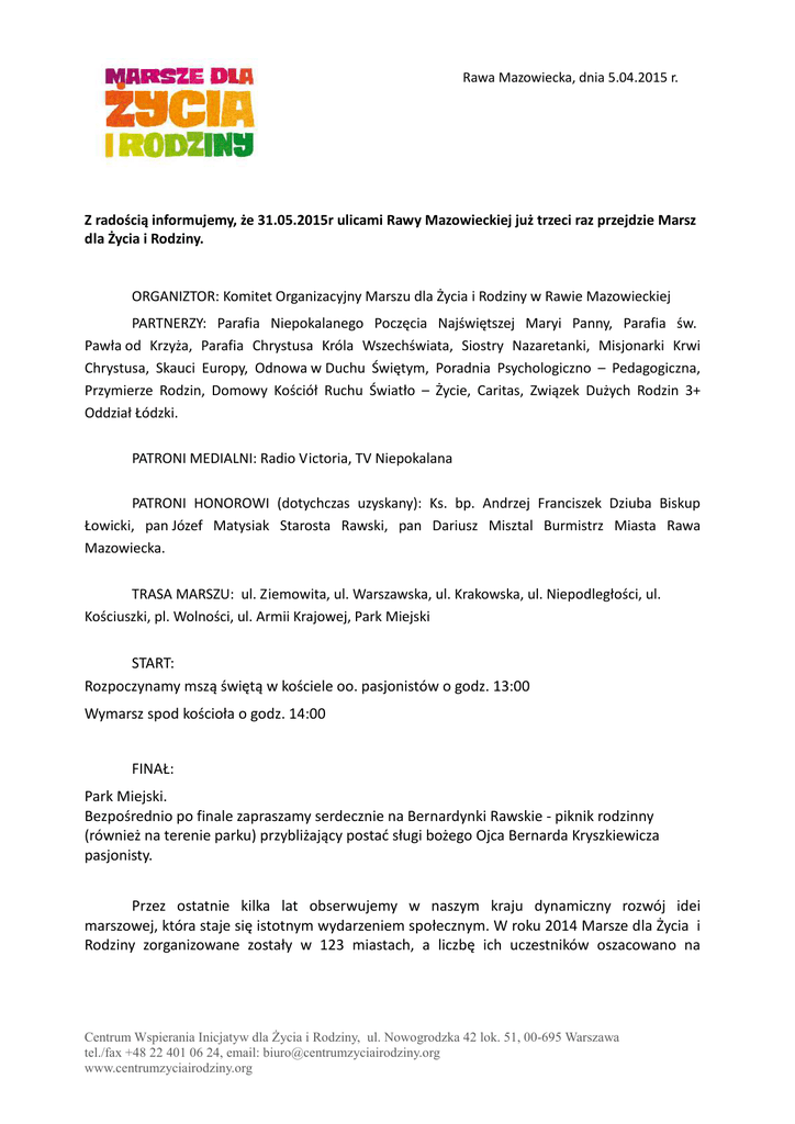 Rawa Mazowiecka, dnia 5.04.2015 r. Z radością informujemy, że 31.05.2015r ulicami Rawy Mazowieckiej już trzeci raz przejdzie Marsz dla Życia i Rodziny. ORGANIZTOR: Komitet Organizacyjny Marszu dla Życia i Rodziny w Rawie Mazowieckiej PARTNERZY: Parafia Niepokalanego Poczęcia Najświętszej Maryi Panny, Parafia św. Pawła od Krzyża, Parafia Chrystusa Króla Wszechświata, Siostry Nazaretanki, Misjonarki Krwi Chrystusa, Skauci Europy, Odnowa w Duchu Świętym, Poradnia Psychologiczno – Pedagogiczna, Przymierze Rodzin, Domowy Kościół Ruchu Światło – Życie, Caritas, Związek Dużych Rodzin 3+ Oddział Łódzki. PATRONI MEDIALNI: Radio Victoria, TV Niepokalana PATRONI HONOROWI (dotychczas uzyskany): Ks. bp. Andrzej Franciszek Dziuba Biskup Łowicki, pan Józef Matysiak Starosta Rawski, pan Dariusz Misztal Burmistrz Miasta Rawa Mazowiecka. TRASA MARSZU: ul. Ziemowita, ul. Warszawska, ul. Krakowska, ul. Niepodległości, ul. Kościuszki, pl. Wolności, ul. Armii Krajowej, Park Miejski START: Rozpoczynamy mszą świętą w kościele oo. pasjonistów o godz. 13:00 Wymarsz spod kościoła o godz. 14:00 FINAŁ: Park Miejski. Bezpośrednio po finale zapraszamy serdecznie na Bernardynki Rawskie - piknik rodzinny (również na terenie parku) przybliżający postać sługi bożego Ojca Bernarda Kryszkiewicza pasjonisty. Przez ostatnie kilka lat obserwujemy w naszym kraju dynamiczny rozwój idei marszowej, która staje się istotnym wydarzeniem społecznym. W roku 2014 Marsze dla Życia i Rodziny zorganizowane zostały w 123 miastach, a liczbę ich uczestników oszacowano na Centrum Wspierania Inicjatyw dla Życia i Rodziny, ul. Nowogrodzka 42 lok. 51, 00-695 Warszawa tel./fax +48 22 401 06 24, email: [email protected] www.centrumzyciairodziny.org 150 000 osób. Z każdym rokiem zwiększa się liczba miast deklarujących wolę organizowania Marszu w gronie ogólnopolskiego porozumienia. Marsze dla Życia i Rodziny są manifestacją przywiązania do wartości rodzinnych i szacunku dla życia ludzkiego. Imprezę wyróżnia jej afirmatywny charakter, ponieważ Marsze to przede wszystkim święto rodzin, stanowiące okazję do tego, by publicznie manifestować radość z posiadania rodziny. To również sposobność, by spotkać osoby, z którymi dzielimy te same wartości. Uczestniczą w nim przede wszystkim młode rodziny z dziećmi, ale także różnego rodzaju ruchy i stowarzyszenia. W minionych latach do udziału w wydarzeniu zachęcały znane i cenione osoby, m.in.: Marzena Nykiel, prof. Jan Żaryn, Przemysław Babiarz czy Krzysztof Ziemiec. Jednak Marsze to nie tylko kolorowy korowód. To również dobitna odpowiedź na najważniejsze wyzwania naszych czasów. Kontekstem tegorocznych Marszów jest troska rodziców o wychowanie i edukację swoich dzieci. Chcemy przypomnieć, że rodzice mają prawo i obowiązek wychowania swoich dzieci zgodnie z własnymi przekonaniami. Wszystkie prawa rodziców pochodzące z prawa naturalnego, potwierdzone między innymi w Konstytucji, winny być przez decydentów uznane i chronione. Ponieważ rodzice pełnią pierwszoplanową rolę wychowawczą, wszelkie instytucje publiczne winny pełnić rolę pomocniczą uznając autorytet i wolę rodziców. Pragniemy zwrócić uwagę na potrzebę coraz lepszej współpracy szkół z rodzicami uczniów w zakresie wychowania i przekazywania młodemu pokoleniu spójnego systemu wartości. Wychowanie oparte na podstawach wyrosłych z europejskiego kręgu kulturowego, u którego podstaw leży odpowiedzialność, wartość rodziny oraz szacunek dla życia, daje gwarancję przygotowania młodych ludzi do podjęcia odpowiedzialności za własną rodzinę, kraj i życie społeczne. Koordynatorem Marszów dla Życia i Rodziny jest Fundacja Centrum Wspierania Inicjatyw dla Życia i Rodziny , która powstała, by pracować nad rozwiązaniami, które stworzą przyjazne warunki dla rodzin. Z wyrazami szacunku, w imieniu Komitetu Organizacyjnego Marszu dla Życia i Rodziny w Rawie Mazowieckiej Bogdan Batorek tel. 696462844 e-mail: [email protected] Centrum Wspierania Inicjatyw dla Życia i Rodziny, ul. Nowogrodzka 42 lok. 51, 00-695 Warszawa tel./fax +48 22 401 06 24, email: [email protected] www.centrumzyciairodziny.org