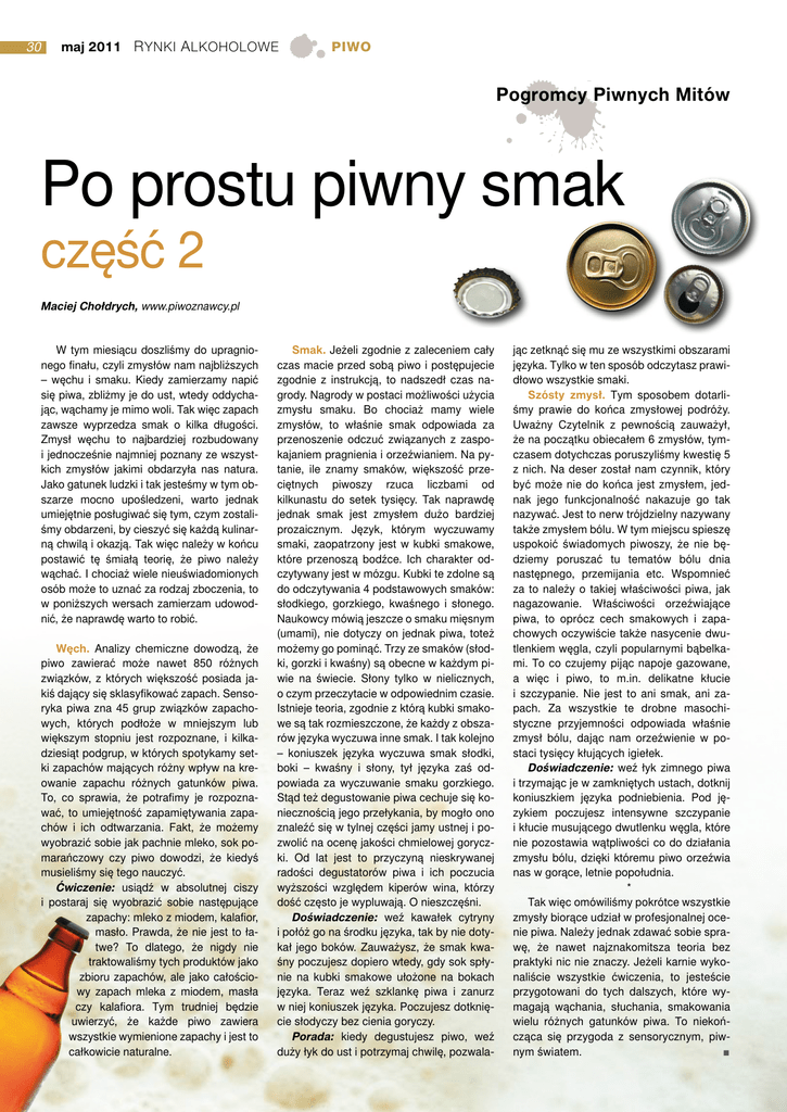 30 maj 2011 R YNKI A LKOHOLOWE PIWO Pogromcy Piwnych Mitów Po prostu piwny smak część 2 Maciej Chołdrych, www.piwoznawcy.pl W tym miesiącu doszliśmy do upragnio nego finału, czyli zmysłów nam najbliższych – węchu i smaku. Kiedy zamierzamy napić się piwa, zbliżmy je do ust, wtedy oddycha jąc, wąchamy je mimo woli. Tak więc zapach zawsze wyprzedza smak o kilka długości. Zmysł węchu to najbardziej rozbudowany i jednocześnie najmniej poznany ze wszyst kich zmysłów jakimi obdarzyła nas natura. Jako gatunek ludzki i tak jesteśmy w tym ob szarze mocno upośledzeni, warto jednak umiejętnie posługiwać się tym, czym zostali śmy obdarzeni, by cieszyć się każdą kulinar ną chwilą i okazją. Tak więc należy w końcu postawić tę śmiałą teorię, że piwo należy wąchać. I chociaż wiele nieuświadomionych osób może to uznać za rodzaj zboczenia, to w poniższych wersach zamierzam udowod nić, że naprawdę warto to robić. Węch. Analizy chemiczne dowodzą, że piwo zawierać może nawet 850 różnych związków, z których większość posiada ja kiś dający się sklasyfikować zapach. Senso ryka piwa zna 45 grup związków zapacho wych, których podłoże w mniejszym lub większym stopniu jest rozpoznane, i kilka dziesiąt podgrup, w których spotykamy set ki zapachów mających różny wpływ na kre owanie zapachu różnych gatunków piwa. To, co sprawia, że potrafimy je rozpozna wać, to umiejętność zapamiętywania zapa chów i ich odtwarzania. Fakt, że możemy wyobrazić sobie jak pachnie mleko, sok po marańczowy czy piwo dowodzi, że kiedyś musieliśmy się tego nauczyć. Ćwiczenie: usiądź w absolutnej ciszy i postaraj się wyobrazić sobie następujące zapachy: mleko z miodem, kalafior, masło. Prawda, że nie jest to ła twe? To dlatego, że nigdy nie traktowaliśmy tych produktów jako zbioru zapachów, ale jako całościo wy zapach mleka z miodem, masła czy kalafiora. Tym trudniej będzie uwierzyć, że każde piwo zawiera wszystkie wymienione zapachy i jest to całkowicie naturalne. Smak. Jeżeli zgodnie z zaleceniem cały czas macie przed sobą piwo i postępujecie zgodnie z instrukcją, to nadszedł czas na grody. Nagrody w postaci możliwości użycia zmysłu smaku. Bo chociaż mamy wiele zmysłów, to właśnie smak odpowiada za przenoszenie odczuć związanych z zaspo kajaniem pragnienia i orzeźwianiem. Na py tanie, ile znamy smaków, większość prze ciętnych piwoszy rzuca liczbami od kilkunastu do setek tysięcy. Tak naprawdę jednak smak jest zmysłem dużo bardziej prozaicznym. Język, którym wyczuwamy smaki, zaopatrzony jest w kubki smakowe, które przenoszą bodźce. Ich charakter od czytywany jest w mózgu. Kubki te zdolne są do odczytywania 4 podstawowych smaków: słodkiego, gorzkiego, kwaśnego i słonego. Naukowcy mówią jeszcze o smaku mięsnym (umami), nie dotyczy on jednak piwa, toteż możemy go pominąć. Trzy ze smaków (słod ki, gorzki i kwaśny) są obecne w każdym pi wie na świecie. Słony tylko w nielicznych, o czym przeczytacie w odpowiednim czasie. Istnieje teoria, zgodnie z którą kubki smako we są tak rozmieszczone, że każdy z obsza rów języka wyczuwa inne smak. I tak kolejno – koniuszek języka wyczuwa smak słodki, boki – kwaśny i słony, tył języka zaś od powiada za wyczuwanie smaku gorzkiego. Stąd też degustowanie piwa cechuje się ko niecznością jego przełykania, by mogło ono znaleźć się w tylnej części jamy ustnej i po zwolić na ocenę jakości chmielowej gorycz ki. Od lat jest to przyczyną nieskrywanej radości degustatorów piwa i ich poczucia wyższości względem kiperów wina, którzy dość często je wypluwają. O nieszczęśni. Doświadczenie: weź kawałek cytryny i połóż go na środku języka, tak by nie doty kał jego boków. Zauważysz, że smak kwa śny poczujesz dopiero wtedy, gdy sok spły nie na kubki smakowe ułożone na bokach języka. Teraz weź szklankę piwa i zanurz w niej koniuszek języka. Poczujesz dotknię cie słodyczy bez cienia goryczy. Porada: kiedy degustujesz piwo, weź duży łyk do ust i potrzymaj chwilę, pozwala jąc zetknąć się mu ze wszystkimi obszarami języka. Tylko w ten sposób odczytasz prawi dłowo wszystkie smaki. Szósty zmysł. Tym sposobem dotarli śmy prawie do końca zmysłowej podróży. Uważny Czytelnik z pewnością zauważył, że na początku obiecałem 6 zmysłów, tym czasem dotychczas poruszyliśmy kwestię 5 z nich. Na deser został nam czynnik, który być może nie do końca jest zmysłem, jed nak jego funkcjonalność nakazuje go tak nazywać. Jest to nerw trójdzielny nazywany także zmysłem bólu. W tym miejscu spieszę uspokoić świadomych piwoszy, że nie bę dziemy poruszać tu tematów bólu dnia następnego, przemijania etc. Wspomnieć za to należy o takiej właściwości piwa, jak nagazowanie. Właściwości orzeźwiające piwa, to oprócz cech smakowych i zapa chowych oczywiście także nasycenie dwu tlenkiem węgla, czyli popularnymi bąbelka mi. To co czujemy pijąc napoje gazowane, a więc i piwo, to m.in. delikatne kłucie i szczypanie. Nie jest to ani smak, ani za pach. Za wszystkie te drobne masochi styczne przyjemności odpowiada właśnie zmysł bólu, dając nam orzeźwienie w po staci tysięcy kłujących igiełek. Doświadczenie: weź łyk zimnego piwa i trzymając je w zamkniętych ustach, dotknij koniuszkiem języka podniebienia. Pod ję zykiem poczujesz intensywne szczypanie i kłucie musującego dwutlenku węgla, które nie pozostawia wątpliwości co do działania zmysłu bólu, dzięki któremu piwo orzeźwia nas w gorące, letnie popołudnia. * Tak więc omówiliśmy pokrótce wszystkie zmysły biorące udział w profesjonalnej oce nie piwa. Należy jednak zdawać sobie spra wę, że nawet najznakomitsza teoria bez praktyki nic nie znaczy. Jeżeli karnie wyko naliście wszystkie ćwiczenia, to jesteście przygotowani do tych dalszych, które wy magają wąchania