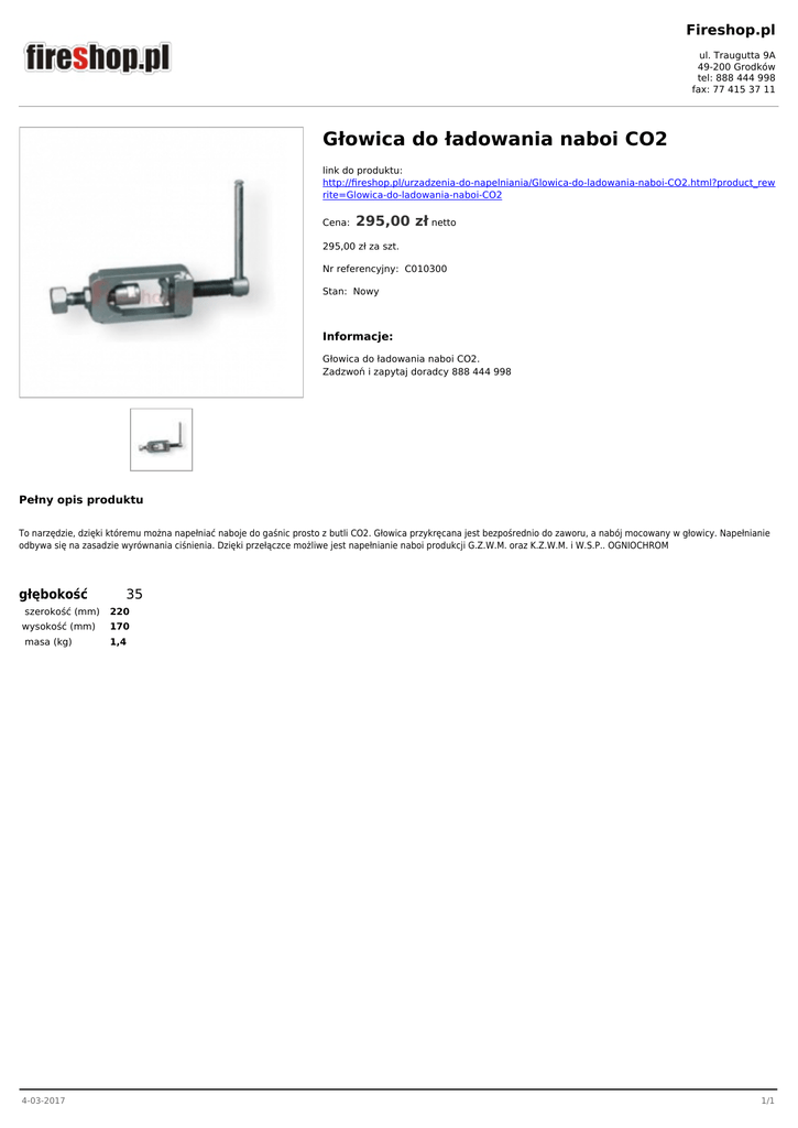 Fireshop.pl ul. Traugutta 9A 49-200 Grodków tel: 888 444 998 fax: 77 415 37 11 Głowica do ładowania naboi CO2 link do produktu: http://fireshop.pl/urzadzenia-do-napelniania/Glowica-do-ladowania-naboi-CO2.html?product_rew rite=Glowica-do-ladowania-naboi-CO2 Cena: 295,00 zł netto 295,00 zł za szt. Nr referencyjny: C010300 Stan: Nowy Informacje: Głowica do ładowania naboi CO2. Zadzwoń i zapytaj doradcy 888 444 998 Pełny opis produktu To narzędzie, dzięki któremu można napełniać naboje do gaśnic prosto z butli CO2. Głowica przykręcana jest bezpośrednio do zaworu, a nabój mocowany w głowicy. Napełnianie odbywa się na zasadzie wyrównania ciśnienia. Dzięki przełączce możliwe jest napełnianie naboi produkcji G.Z.W.M. oraz K.Z.W.M. i W.S.P.. OGNIOCHROM głębokość szerokość (mm) wysokość (mm) masa (kg) 4-03-2017 35 220 170 1,4 1/1