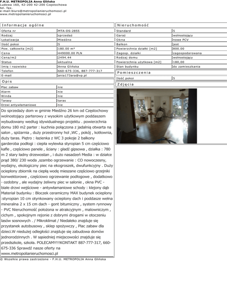 F.H.U. METROPOLIA Anna Glińska Ludowa 160, 42-200 42-200 Częstochowa tel. fax. e-mail:[email protected] www.metropolianieruchomosci.pl Informacje ogólne Nieruchomość Oferta nr MTA-DS-2855 Standard 5 Rodzaj sprzedaż Garaż wolnostojący Lokalizacja Miedźno Okna nowe PCV Ilość pokoi 5 Balkon jest Pow. całkowita [m2] 180.00 m² Powierzchnia działki [m2] 800.00 Cena 449000.00 PLN Zagosp. działki zagospodarowana Cena/m2 2494.44 Rodzaj domu wolnostojący Status aktualna Powierzchnia użytkowa [m2] 180,00 Imię i nazwisko Anna Glińska Stan budynku do zamieszkania Telefon 660-675-336, 887-777-317 E-mail [email protected] Pomieszczenia Ilość pokoi Opis Plac zabaw nie Alarm nie Winda nie Tarasy taras Drzwi antywłamaniowe nie Do sprzedaży dom w gminie Miedźno 26 km od Częstochowy wolnostojący parterowy z wysokim użytkowym poddaszem wybudowany według idywidualnego projektu . powierzchnia domu 180 m2 parter : kuchnia połączona z jadalnią otwarta na salon , spiżarnia , duży przestronny hol ,WC , pokój , kotłownia, duży taras. Piętro : łazienka z WC 3 pokoje 2 balkony garderoba podłogi : ciepła wylewka styropian 5 cm częściowo kafle , częściowo panele , ściany : gładź gipsowa , działka : 780 m 2 stary ładny drzewostan , i dużo nasadzeń Media : w działce prąd 380/ 230 woda ,szambo ogrzewanie : CO nowoczesny, wydajny, ekologiczny piec na ekogroszek, dwufunkcyjny . Duży ocieplony zbiornik na ciepłą wodę mieszane częściowo grzejniki konwektorowe , częściowo ogrzewanie podłogowe , dodatkowo - ozdobny , ale wydajny żeliwny piec w salonie , okna PVC białe drzwi wejściowe - antywłamaniowe schody : klejony dąb Materiał budynku : Bloczek ceramiczny MAX budynek ocieplony :styropian 10 cm otynkowany ocieplony dach i poddasze wełna mineralna 2 x 15 cm dach - gont bitumiczny , system rynnowy - PVC Nieruchomość położona w atrakcyjnym , malowniczym , cichym , spokojnym rejonie z dobrymi drogami w otoczeniu lasów sosnowych . / Mikroklimat / Niedaleko znajduje się przystanek autobusowy , sklep spożywczy , Plac zabaw dla dzieci.W niedużej odległości znajduje się zabudowa domów jednorodzinnych . W sąsiedniej miejscowości znajduje się przedszkole, szkoła. POLECAMY!!!KONTAKT 887-777-317, 660675-336 Sprawdź nasze oferty na www.metropolianieruchomosci.pl © Wszelkie prawa zastrzeżone - F.H.U. METROPOLIA Anna Glińska Zdjęcia 5