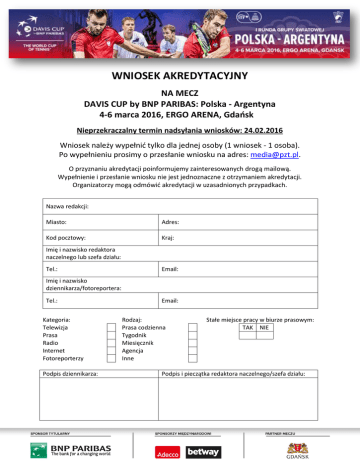 WNIOSEK AKREDYTACYJNY NA MECZ DAVIS CUP by BNP PARIBAS: Polska - Argentyna 4-6 marca 2016, ERGO ARENA, Gdańsk Nieprzekraczalny termin nadsyłania wniosków: 24.02.2016 Wniosek należy wypełnić tylko dla jednej osoby (1 wniosek - 1 osoba). Po wypełnieniu prosimy o przesłanie wniosku na adres: [email protected]. O przyznaniu akredytacji poinformujemy zainteresowanych drogą mailową. Wypełnienie i przesłanie wniosku nie jest jednoznaczne z otrzymaniem akredytacji. Organizatorzy mogą odmówić akredytacji w uzasadnionych przypadkach. Nazwa redakcji: Miasto: Adres: Kod pocztowy: Kraj: Imię i nazwisko redaktora naczelnego lub szefa działu: Tel.: Email: Imię i nazwisko dziennikarza/fotoreportera: Tel.: Kategoria: Telewizja Prasa Radio Internet Fotoreporterzy Podpis dziennikarza: Email: Rodzaj: Prasa codzienna Tygodnik Miesięcznik Agencja Inne Stałe miejsce pracy w biurze prasowym: TAK NIE Podpis i pieczątka redaktora naczelnego/szefa działu: