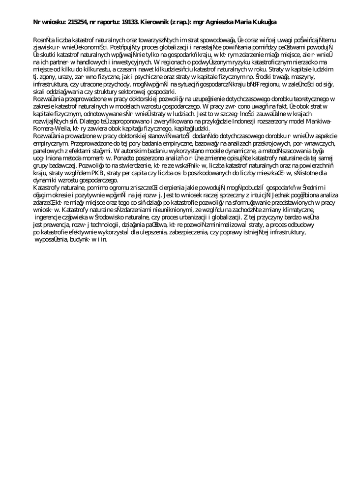 Nr wniosku: 215254, nr raportu: 19133. Kierownik (z rap.): mgr Agnieszka Maria Kukułka Rosnąca liczba katastrof naturalnych oraz towarzyszących im strat spowodowała, że coraz więcej uwagi poświęcają temu zjawisku również ekonomiści. Postępujący proces globalizacji i narastające powiązania pomiędzy państwami powodują, że skutki katastrof naturalnych wpływają nie tylko na gospodarkę kraju, w którym zdarzenie miało miejsce, ale również na ich partnerów handlowych i inwestycyjnych. W regionach o podwyższonym ryzyku katastroficznym nierzadko ma miejsce od kilku do kilkunastu, a czasami nawet kilkudziesięciu katastrof naturalnych w roku. Straty w kapitale ludzkim tj. zgony, urazy, zarówno fizyczne, jak i psychiczne oraz straty w kapitale fizycznym np. środki trwałe, maszyny, infrastruktura, czy utracone przychody, mogą wpłynąć na sytuację gospodarczą kraju bądź regionu, w zależności od siły, skali oddziaływania czy struktury sektorowej gospodarki. Rozważania przeprowadzone w pracy doktorskiej pozwoliły na uzupełnienie dotychczasowego dorobku teoretycznego w zakresie katastrof naturalnych w modelach wzrostu gospodarczego. W pracy zwrócono uwagę na fakt, że obok strat w kapitale fizycznym, odnotowywane są również straty w ludziach. Jest to w szczególności zauważalne w krajach rozwijających się. Dlatego też zaproponowano i zweryfikowano na przykładzie Indonezji rozszerzony model MankiwaRomera-Weila, który zawiera obok kapitału fizycznego, kapitał ludzki. Rozważania prowadzone w pracy doktorskiej stanowią wartość dodaną do dotychczasowego dorobku również w aspekcie empirycznym. Przeprowadzone do tej pory badania empiryczne, bazowały na analizach przekrojowych, porównawczych, panelowych z efektami stałymi. W autorskim badaniu wykorzystano modele dynamiczne, a metodą szacowania była uogólniona metoda momentów. Ponadto poszerzono analizę o różne zmienne opisujące katastrofy naturalne da tej samej grupy badawczej. Pozwoliło to na stwierdzenie, które ze wskaźników, liczba katastrof naturalnych oraz na powierzchnię kraju, straty względem PKB, straty per capita czy liczba osób poszkodowanych do liczby mieszkańców, są istotne dla dynamiki wzrostu gospodarczego. Katastrofy naturalne, pomimo ogromu zniszczeń i cierpienia jakie powodują, mogą pobudzić gospodarkę w średnim i długim okresie i pozytywnie wpłynąć na jej rozwój. Jest to wniosek raczej sprzeczny z intuicją. Jednak pogłębiona analiza zdarzeń, które miały miejsce oraz tego co się działo po katastrofie pozwoliły na sformułowanie przedstawionych w pracy wniosków. Katastrofy naturalne są zdarzeniami nieuniknionymi, ze względu na zachodzące zmiany klimatyczne, ingerencje człowieka w środowisko naturalne, czy proces urbanizacji i globalizacji. Z tej przyczyny bardzo ważna jest prewencja, rozwój technologii, działania państwa, które pozwolą zminimalizować straty, a proces odbudowy po katastrofie efektywnie wykorzystać dla ulepszenia, zabezpieczenia, czy poprawy istniejącej infrastruktury, wyposażenia, budynków i in.