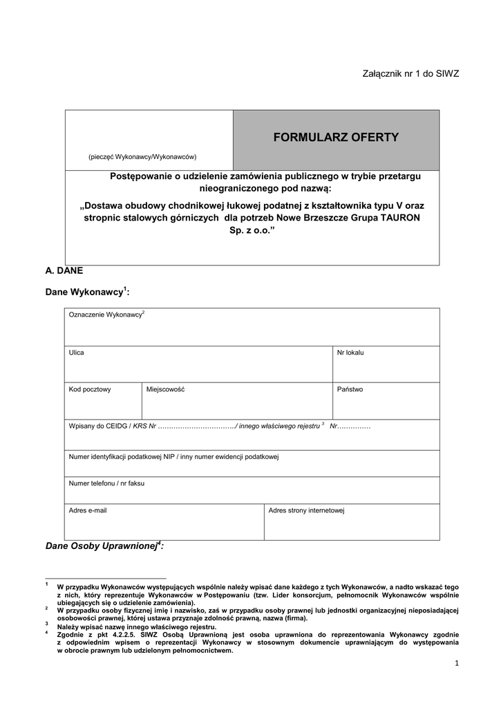 Załącznik nr 1 do SIWZ FORMULARZ OFERTY (pieczęć Wykonawcy/Wykonawców) Postępowanie o udzielenie zamówienia publicznego w trybie przetargu nieograniczonego pod nazwą: „Dostawa obudowy chodnikowej łukowej podatnej z kształtownika typu V oraz stropnic stalowych górniczych dla potrzeb Nowe Brzeszcze Grupa TAURON Sp. z o.o.” A. DANE Dane Wykonawcy1: Oznaczenie Wykonawcy2 Ulica Kod pocztowy Nr lokalu Miejscowość Państwo Wpisany do CEIDG / KRS Nr ……………………………../ innego właściwego rejestru 3 Nr…………… Numer identyfikacji podatkowej NIP / inny numer ewidencji podatkowej Numer telefonu / nr faksu Adres e-mail Adres strony internetowej Dane Osoby Uprawnionej4: 1 2 3 4 W przypadku Wykonawców występujących wspólnie należy wpisać dane każdego z tych Wykonawców, a nadto wskazać tego z nich, który reprezentuje Wykonawców w Postępowaniu (tzw. Lider konsorcjum, pełnomocnik Wykonawców wspólnie ubiegających się o udzielenie zamówienia). W przypadku osoby fizycznej imię i nazwisko, zaś w przypadku osoby prawnej lub jednostki organizacyjnej nieposiadającej osobowości prawnej, której ustawa przyznaje zdolność prawną, nazwa (firma). Należy wpisać nazwę innego właściwego rejestru. Zgodnie z pkt 4.2.2.5. SIWZ Osobą Uprawnioną jest osoba uprawniona do reprezentowania Wykonawcy zgodnie z odpowiednim wpisem o reprezentacji Wykonawcy w stosownym dokumencie uprawniającym do występowania w obrocie prawnym lub udzielonym pełnomocnictwem. 1 Oznaczenie Osoby Uprawnionej Ulica Nr lokalu Miejscowość Kod pocztowy Państwo Numer telefonu / nr faksu Adres e-mail Adres strony internetowej Adres do korespondencji: Ulica Kod pocztowy Nr lokalu Miejscowość Państwo Dane użytkownika uprawnionego do udziału ze strony Wykonawcy w aukcji elektronicznej5: Imię e-mail Nazwisko Numer telefonu Dodatkowe dane PESEL niezbędny do weryfikacji podpisu elektronicznego B. PARAMETRY OFERTY STANOWIĄCE KRYTERIA OCENY OFERT Nawiązując do ogłoszenia o zamówieniu publicznym prowadzonym w trybie przetargu nieograniczonego na realizację zamówienia pod nazwą „Dostawa obudowy chodnikowej łukowej podatnej z kształtownika typu V oraz stropnic stalowych górniczych dla potrzeb Nowe Brzeszcze Grupa TAURON Sp. z o.o.” oznaczonego numerem referencyjnym: 011600042 dla Nowe Brzeszcze Grupa TAURON Sp. z o.o. – Zakład Górniczy Brzeszcze. 1) Oświadczamy, że zamówienie zostanie przez nas wykonane za Cenę brutto (Kryterium: Cena – waga 100%): 5 Dane powinny być zgodne z danymi umieszczonymi w podpisie elektronicznym. 2 …………………………………………………………………………………………… PLN (słownie: ...............…………………………………………………………………………… ………………………………………………………………………………………………….) Sposób wyliczenia ceny brutto przedstawia Formularz Cenowy stanowiący Załącznik nr 1 do Formularza Oferty OŚWIADCZENIA I ZAPEWNIENIA WYKONAWCY C. Podana przez nas Cena zawiera wszelkie koszty niezbędne do zrealizowania zamówienia wynikające z zakresów i warunków określonych w SIWZ. Oświadczamy, że niedoszacowanie, pominięcie lub brak należytego rozpoznania przez nas zakresu Przedmiotu Zamówienia nie jest podstawą do żądania zmiany wysokości wynagrodzenia. Oświadczamy, że jesteśmy zdolni do wykonania Przedmiotu Zamówienia zgodnie z wymaganiami podanymi w SIWZ. Oświadczamy, że przedmiot oferty jest zgodny z opisem Przedmiotu Zamówienia. Oświadczamy, że zapoznaliśmy się z treścią SIWZ, nie wnosimy do niej zastrzeżeń oraz że uzyskaliśmy wszystkie informacje niezbędne do właściwego przygotowania oferty. Oświadczamy, iż zapoznaliśmy się z terminem realizacji zamówienia wskazanym przez Zamawiającego w SIWZ. Oświadczamy, że akceptujemy treść załączonego do SIWZ Wzoru Umowy wraz ze wszystkimi załącznikami. Wadium w wysokości…………………………………………………....…..…..PLN (słownie: ……………………………………………………………………………………… …………………………………………………………………………………………..………) w formie.............................................................. zostało wniesione w wymaganym przez Zamawiającego terminie i na cały okres związania ofertą na część/części nr …………………………. . Wadium wniesione w pieniądzu prosimy zwrócić na rachunek bankowy: ……………………………..…………………………………….. 1. 2. 3. 4. 5. 6. 7. 8. (właściciel rachunku) ………………………..………………………………………….. (nazwa banku) 9. 10. 11. 12. 13. 6 nr rachunku …………………..………………………………… wadium wniesione w formie niepieniężnej prosimy przesłać na adres ………………………………………………………………………..…………………………………… …………………………………………………………………………………………… . Oświadczamy, że uważamy się za związanych niniejszą ofertą przez okres 60 dni. Zobowiązujemy się w przypadku wybrania naszej oferty jako najkorzystniejszej do: 10.1. Podpisania Umowy zgodnej z postanowieniami SIWZ w miejscu i terminie wyznaczonym przez Zamawiającego. Oświadczamy, że niniejsza oferta jest kompletna, zawiera wszystkie wymagane w SIWZ dokumenty i załączniki oraz dane, posiada ……..… stron kolejno ponumerowanych i podpisanych przez upoważnioną osobę/osoby. Informujemy, iż informacje składające się na ofertę, zawarte na stronach ...….........…... stanowią tajemnicę przedsiębiorstwa w rozumieniu przepisów ustawy o zwalczaniu nieuczciwej konkurencji i jako takie nie mogą być udostępnione innym uczes