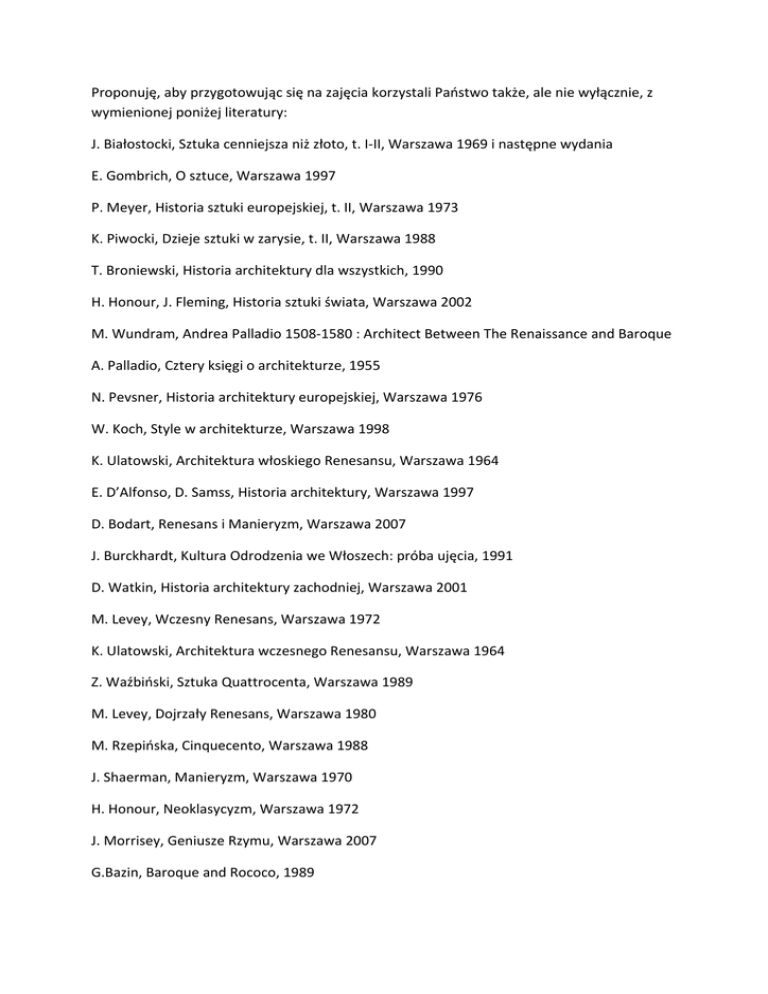 Proponuję, aby przygotowując się na zajęcia korzystali Państwo także, ale nie wyłącznie, z wymienionej poniżej literatury: J. Białostocki, Sztuka cenniejsza niż złoto, t. I‐II, Warszawa 1969 i następne wydania E. Gombrich, O sztuce, Warszawa 1997 P. Meyer, Historia sztuki europejskiej, t. II, Warszawa 1973 K. Piwocki, Dzieje sztuki w zarysie, t. II, Warszawa 1988 T. Broniewski, Historia architektury dla wszystkich, 1990 H. Honour, J. Fleming, Historia sztuki świata, Warszawa 2002 M. Wundram, Andrea Palladio 1508‐1580 : Architect Between The Renaissance and Baroque A. Palladio, Cztery księgi o architekturze, 1955 N. Pevsner, Historia architektury europejskiej, Warszawa 1976 W. Koch, Style w architekturze, Warszawa 1998 K. Ulatowski, Architektura włoskiego Renesansu, Warszawa 1964 E. D’Alfonso, D. Samss, Historia architektury, Warszawa 1997 D. Bodart, Renesans i Manieryzm, Warszawa 2007 J. Burckhardt, Kultura Odrodzenia we Włoszech: próba ujęcia, 1991 D. Watkin, Historia architektury zachodniej, Warszawa 2001 M. Levey, Wczesny Renesans, Warszawa 1972 K. Ulatowski, Architektura wczesnego Renesansu, Warszawa 1964 Z. Waźbiński, Sztuka Quattrocenta, Warszawa 1989 M. Levey, Dojrzały Renesans, Warszawa 1980 M. Rzepińska, Cinquecento, Warszawa 1988 J. Shaerman, Manieryzm, Warszawa 1970 H. Honour, Neoklasycyzm, Warszawa 1972 J. Morrisey, Geniusze Rzymu, Warszawa 2007 G.Bazin, Baroque and Rococo, 1989 E.Ortner, Der Barockbaumeister Balthasar Neumann : Eine Biographie, 1989 H. Meek, Guarino Guarini and his Architecture, 1988 A.Blunt, Borromini, 1979 T. Klaniczay, Renesans, Manieryzm, barok, 1986 J. Hook, The Baroque Age in England, 1979 R.Wittkower, Studies in The Italian Baroque, 1975 M. Schlechte, Sächsisches Barock : aus der Zeit von Matthes Daniel Pöppelmann, 1986 A. Czapska, Architekci Włoscy Okresu Manieryzmu i Baroku, 1983
