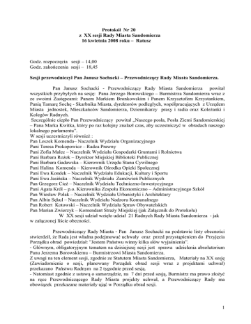 1 Protokół Nr 20 z XX sesji Rady Miasta Sandomierza 16 kwietnia