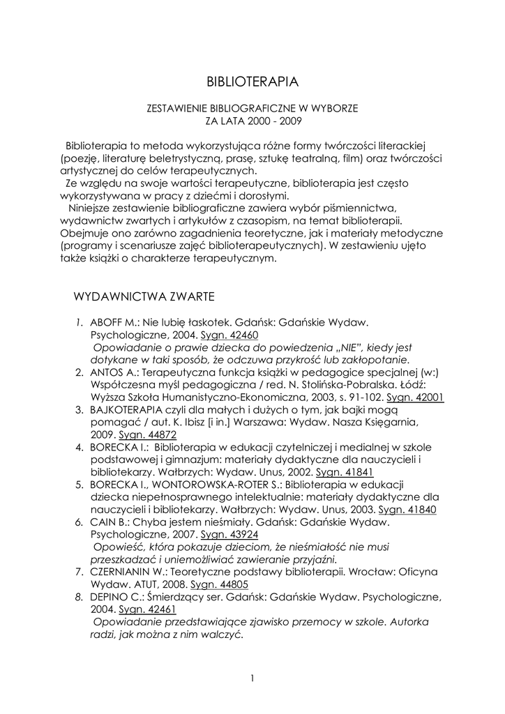 BIBLIOTERAPIA ZESTAWIENIE BIBLIOGRAFICZNE W WYBORZE ZA LATA 2000 - 2009 Biblioterapia to metoda wykorzystująca różne formy twórczości literackiej (poezję, literaturę beletrystyczną, prasę, sztukę teatralną, film) oraz twórczości artystycznej do celów terapeutycznych. Ze względu na swoje wartości terapeutyczne, biblioterapia jest często wykorzystywana w pracy z dziećmi i dorosłymi. Niniejsze zestawienie bibliograficzne zawiera wybór piśmiennictwa, wydawnictw zwartych i artykułów z czasopism, na temat biblioterapii. Obejmuje ono zarówno zagadnienia teoretyczne, jak i materiały metodyczne (programy i scenariusze zajęć biblioterapeutycznych). W zestawieniu ujęto także książki o charakterze terapeutycznym. WYDAWNICTWA ZWARTE 1. ABOFF M.: Nie lubię łaskotek. Gdańsk: Gdańskie Wydaw. Psychologiczne, 2004. Sygn. 42460 Opowiadanie o prawie dziecka do powiedzenia „NIE”, kiedy jest dotykane w taki sposób, że odczuwa przykrość lub zakłopotanie. 2. ANTOS A.: Terapeutyczna funkcja książki w pedagogice specjalnej (w:) Współczesna myśl pedagogiczna / red. N. Stolińska-Pobralska. Łódź: Wyższa Szkoła Humanistyczno-Ekonomiczna, 2003, s. 91-102. Sygn. 42001 3. BAJKOTERAPIA czyli dla małych i dużych o tym, jak bajki mogą pomagać / aut. K. Ibisz [i in.] Warszawa: Wydaw. Nasza Księgarnia, 2009. Sygn. 44872 4. BORECKA I.: Biblioterapia w edukacji czytelniczej i medialnej w szkole podstawowej i gimnazjum: materiały dydaktyczne dla nauczycieli i bibliotekarzy. Wałbrzych: Wydaw. Unus, 2002. Sygn. 41841 5. BORECKA I., WONTOROWSKA-ROTER S.: Biblioterapia w edukacji dziecka niepełnosprawnego intelektualnie: materiały dydaktyczne dla nauczycieli i bibliotekarzy. Wałbrzych: Wydaw. Unus, 2003. Sygn. 41840 6. CAIN B.: Chyba jestem nieśmiały. Gdańsk: Gdańskie Wydaw. Psychologiczne, 2007. Sygn. 43924 Opowieść, która pokazuje dzieciom, że nieśmiałość nie musi przeszkadzać i uniemożliwiać zawieranie przyjaźni. 7. CZERNIANIN W.: Teoretyczne podstawy biblioterapii. Wrocław: Oficyna Wydaw. ATUT, 2008. Sygn. 44805 8. DEPINO C.: Śmierdzący ser. Gdańsk: Gdańskie Wydaw. Psychologiczne, 2004. Sygn. 42461 Opowiadanie przedstawiające zjawisko przemocy w szkole. Autorka radzi, jak można z nim walczyć. 1 9. DIAGNOSTYCZNA i terapeutyczna funkcja biblioteki szkolnej: materiały konferencji Wrocław, 25-26 września 2003 r. / pod red. S. Kubowa. Wrocław: Dolnośląska Szkoła Wyższa Edukacji Towarzystwa Wiedzy Powszechnej, 2003. Sygn. 42221 10. EICHELBERGER W., SUCHOWIERSKA A.: Bajka to życie albo z jakiej jesteś bajki: historie zmyślone opatrzone pomocnym komentarzem. Warszawa: Jacek Santorski & Co Agencja Wydawnicza, 2008. Sygn. 44323 11. DUTHEIL F., FELLNER H.: Rasizm i nietolerancja nie! Warszawa: Muchomor, 2005. Sygn. 43586 Miniporadnik, który uczy dzieci akceptacji drugiego człowieka; do czytania z rodzicami dla dzieci powyżej 7 lat. 12. KOZŁOWSKA A.: Zaczarowane bajki, które leczą: dla dzieci i dorosłych. Warszawa: Wydaw. Akademickie Żak, 2007. Sygn. 44316 13. MEYER-GLITZA E.: Jakub pogromca strachu: terapeutyczne opowiadania dla dzieci przeżywających lęki. Kielce: Wydaw. Jedność, 2001. Sygn. 40243 14. MEYER-GLITZA E.: Kiedy Pani Złość przychodzi z wizytą: terapeutyczne opowiadania dla impulsywnych dzieci. Kielce: Wydaw. Jedność, 2001. Sygn. 40245, 44216 15. MOLICKA M.: Bajkoterapia: o lękach dzieci i nowej metodzie terapii. Poznań: Media Rodzina, 2002. Sygn. 40448, 42837, 42868 16. POTEMPSKA E., SOBIESKA-SZOSTAKIEWICZ G.: Rozwój empatii i kompetencji społecznych: program wychowawczo-terapeutyczny. Warszawa: Centrum Metodyczne Pomocy PsychologicznoPedagogicznej, 2003. Sygn. 41705 Program zajęć biblioterapeutycznych z elementami dramy. 17. SAINT MARS D. de, BLOCH S.: Poniżanie nie! Warszawa: Muchomor, 2005. Sygn. 43717 Miniporadnik, który pokazuje dzieciom, jak sprzeciwiać się upokarzaniu, jak radzić sobie nawet z drobnymi niesprawiedliwościami; do czytania z rodzicami dla dzieci powyżej 7 lat. 18. STALFELT P.: Mała książka o śmierci. Warszawa: Jacek Santorski & Co Agencja Wydawnicza, 2008. Sygn. 44415 Autorka książki z ogromnym wyczuciem i powagą, a jednocześnie z odpowiednią dozą humoru odpowiada na pytania, które nurtują dzieci i związane są z tematem śmierci. 19. SZCZUPAŁ B.: Zastosowanie biblioterapii w pracy dydaktycznowychowawczej z dziećmi przewlekle chorymi w zakładzie leczniczym (w:) Wybrane problemy edukacji dzieci w przedszkolu i szkole / pod red. S. Guz, J. Andrzejewskiej. Lublin: Wydaw. Uniwersytetu Marii CurieSkłodowskiej, 2005, s. 51-57. Sygn. 43915 20. SZELIGA K.: Bajkoterapia czyli jak z Guziolkiem tworzyć i wykorzystywać bajki i opowiadania w biblioterapii oraz rozwoju aktywności twórczej dziecka w wieku przedszkolnym: poradnik dla Dzieci, Rodziców i Nauczycieli. Kraków: Oficyna Wydaw. Impuls, 2008. Sygn. 44324 2 21. WILGOCKI J., WRIGHT M.K.: Czas niepewności: o dzieciach w rodzinach zastępczych. Gdańsk: Gdańskie Wydaw. Psychologiczne, 2002. Sygn. 43296 Książka mówi o uczuciach i zmartwieniach dzieci będących w rodzinach zastępczych. 22. ZUBRZYCKA E.: Słup soli: jak powstrzymać szkolnych dręczycieli. Gdańsk: Gdańskie Wydaw. Psychologiczne, 2005 Sygn. 43028 Autorka książki, w formie opowiadania, przedstawia zjawisko dręczenia dzieci przez dzieci. Podpowiada także, jak można wybrnąć z tej sytuacji. ARTYKUŁY Z CZASOPISM 1. ANDRZEJEWSKA a.: Biblioterapia w podmiotowym podejściu do osób niepełnosprawnych // Opieka, Wychowanie, Terapia. – 2001, nr 1, s. 2931 2. BŁASZCZYK-SMOLEC A.: Edukacja czytelnicza a biblioterapia // Biblioteka w Szkole. – 2002, nr 6, s. 4-5 3. BORECKA I.: Biblioterapia – czyli jak pomagać przez książkę i czytanie // Nasze Forum. – 2001, nr 3/4, s. 51-62 4. BORECKA I.: Biblioterapia w szkole, czyli o doskonaleniu nauczycieli bibliotekarzy // Biblioteka w Szkole. – 2000, nr 9, s. 22-23 5. BORECKA I.: O edukacji na