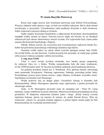 1 [Druk: „Przewodnik Katolicki” 7(1963), s. 110-111.] W cieniu Bazyliki Piotrowej Rzym żyje ciągle jeszcze pod wrażeniem pierwszej sesji Soboru Powszechnego. Wszyscy zdajemy sobie sprawę z tego, że była ona wielkim sukcesem. Był to skok niemal rewolucyjny w przyszłość. Uświadomiono sobie problemy Kościoła w skali światowej. Sobór rozpoczął wymowny dialog ze światem. Nadto między Kościołem Katolickim a odłączonymi Kościołami chrześcijańskimi nastąpiła wielka zmiana na lepsze. Przecież jeszcze nigdy nie bywało, by na obradach soborowych byli obecni obserwatorzy innych wyznań. Ich wypowiedzi były często pełne uznania dla Kościoła Katolickiego i Papieża. Obrady Soboru toczyły się oczywiście pod wszechmożnym wpływem Ducha Św. Sobór był prawdziwą koncentracją widzialnego działania Jego darów. Niemniej wielki wpływ na całość obrad wywarła ujmująca postać Jana XXIII. On zwołał Sobór, on nim kierował. I trzeba przyznać bez przesady, że osoba jego zyskała sobie jeszcze większą sympatię i miłość powszechną. U stóp Jana XXIII Toteż w sercu swoim żywiłem nieśmiałe, lecz bardzo gorące pragnienie, by zobaczyć Ojca św. z bliska. Wielką niespodzianką była dla mnie wiadomość, że Jan XXIII przyjmie mnie 16 stycznia na krótkiej audiencji, przed audiencją zbiorową. Na godzinę przedtem jestem już w Watykanie. Przy głównej bramie zatrzymują mnie posterunki Szwajcarów. Pokazuję zaproszenie. Salutują, pozwalają jechać dalej. Przejeżdżamy jeszcze przez bramę trzecią i piątą. Mijamy swobodnie wszystkie straże. Zajeżdżamy na dziedzic nieć Damazego. Winda podwozi mię na drugie piętro. Gwardziści kierują w kierunku Sali Klementyńskiej. Młody Monsignore sprawdza moje zaproszenie, a potem prowadzi do obszernego salonu. Godz. 11.30. Monsignore prowadzi mnie do następnej sali - Piura IX. Lśnią marmury, ściany ozdobione licznymi obrazami. Miarowym krokiem przechadzają się dwaj gwardziści. W skupieniu odmawiam różaniec jeden i drugi. „Kiedy kończę czwartą tajemnicę bolesną, zjawia się maestro di camera, ks. prałat Nassali Rocca. Wita się serdecznie: „Ojciec św. przyjmie księdza najpierw, a potem będzie można pójść do Sali Klementyńskiej, by wysłuchać przemówienia”. 2 Godz. 12. Dzwonią dzwony. Odmawiam „Angelus”. Za chwilę maestro di camera woła: „Papież nadchodzi”. Drzwi się otwierają. Gwardziści stają na baczność. Szwajcarzy prezentują broń. Ojciec św. podchodzi do mnie. Klękam z wielkim wzruszeniem u jego stóp i całuję z miłością obie ręce. Ojciec św. taki sam, jakem go oglądał tyle razy na fotografii i w telewizji włoskiej. Powstaję z klęczek. Trema mija. Ogarnia mnie wielki spokój. Patrzą na mnie dobre oczy, takie bardzo ludzkie. W oczach, na twarzy Papieża ani śladu choroby. Mówię, że przybywam z Polski. Zapewniam, że wszyscy modlimy się za niego, zwłaszcza w Częstochowie. Tu Ojciec św. mi przerywa: „Ach, Częstochowa, Częstochowa”. Mówi potem o Wieliczce, że nigdy nie zapomni tego wrażenia. Polacy tacy szlachetni i pobożni. Mówię, że teraz pojadę do Ameryki Południowej, by tam odwiedzić naszych misjonarzy. „To bardzo dobrze”. Proszę następnie o jakieś wskazania dla nas. Papież bez namysłu odpowiada: „Sanctificari, sanctificare” - uświęcać siebie, uświęcać innych. Klękam ponownie i proszę o błogosławieństwo. Ojciec św. udziela go wszystkim członkom mego Zgromadzenia w kraju i za granicą. Czuję, że ten który go udziela, to Namiestnik Chrystusowy, to człowiek wielki na miarę naszych wielkich czasów. Na audiencji zbiorowej Przechodzimy do Sali Klementyńskiej. Gorące owacje, huczne oklaski, okrzyki. Ojciec św. elastycznym krokiem wstępuje na tron. Odmawia „Anioł Pański”. Cała sala modli się razem z nim. Potem przemawia, przy czym gestykuluje, ożywia się i stale się uśmiecha. Mówi jak ojciec do swoich dzieci. Mówi o świętości osobistej. „In sanctitate et iustitia”. Najważniejsza rzecz żyć w łasce Bożej. La vita è bella - życie jest piękne i to w młodości i to w wieku dojrzałym i to w starości, byle tylko było opromienione łaską. Po tym życiu inne życie, pełne radości, by radować się wiecznym szczęściem trzeba pozostawać w zjednoczeniu z Chrystusem i stawać się z każdą godziną coraz godniejszym synem Najświętszej Dziewicy. Nawiązując do pogłosek o swej chorobie, Ojciec św. powiedział: „Rozszerzano parę tygodni temu wiadomości, iż Papież, czuje się źle i że znajduje się jakoby u kresu swoich sił... Wskazał przecież Papież zaraz w początkach swego pontyfikatu, że duch jego nieustannie czuwa, gotów na skinienia Pana. Właśnie dlatego też oświadcza obecnym z pogodą ducha, że dobrze się miewa. Jest to znak, że wola Boża żąda od niego, by nie ustawał w poświęcaniu wszystkich swoich energii dla dobra Kościoła. Nasi drodzy pielgrzymi mogą zresztą sami stwierdzić, że zdrowie Papieża jest dobre. Ale życzeniem Jego jest przede wszystkim to, by wszyscy dosłyszeli bicie jego serca, pełnego czułej troski o postęp i świętość wszystkich dusz”. 3 Po przemówieniu Ojca św. pewien kapłan z USA streszcza je po angielsku. Inny po hiszpańsku. Sam Ojciec św. przemawia jeszcze krótko po francusku. Następuje błogosławieństwo papieskie. Wznoszą się okrzyki, potężnieją z każdą chwilą. Wydaje się, że obecni nie wypuszczą Ojca św. z sali. Jest to wpływ jego wielkiej osobowości. Wszyscy czujemy. że jakiś fluid emanuje z jego postaci. Ona to podbija serca i urzeka. Kanonizacja błog. Wincentego Pallottiego Nadchodzi niedziela 20 stycznia. Upłynęły zaledwie 4 dni, a już znowu możemy oglądać. Ojca św. i to z okazji Kanonizacji Sługi Bożego Wincentego Pallottiego. Jesteśmy w Bazylice św. Piotra o godz. 8. Z trybuny Św. Benedykta mamy doskonały widok na całość. Ludzi