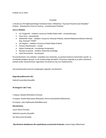 Kraków 16.11.2012 Protokół Z obrad jury XIII Ogólnopolskiego Festiwalu Dzieci i Młodzieży "Tęczowe Piosenki Jana Wojdaka" Kraków - Nowohuckie Centrum Kultury - przesłuchania finałowe Jury w składzie: Jan Targowski - redaktor muzyczny Polskie Radio Łódź – przewodniczący Arisa Vinci – piosenkarka Aleksander Pałac - redaktor muzyczny Telewizji Polskiej, członek Międzynarodowej Federacji Org. Festiwali "FIDOF" Jan Stępień - redaktor muzyczny Polskie Radio Kraków Tomasz Wachnowski – muzyk Sylwia Chałupczak - muzykolog, kompozytor Wacław Krupiński - redaktor Dziennika Polskiego Józef Smulczyński - kompozytor Po przesłuchaniu 131 solistów i zespołów Jury stwierdza, że poziom konkursu był bardzo wysoki, co utrudniało podjęcie decyzji, co do ostatecznego werdyktu. Przyznane nagrody są w pełni zasłużone, jednak osoby niewyróżnione nagrodami nie powinny się czuć niedocenione. Jury postanowiło przyznać następujące nagrody i wyróżnienia: Nagrodę publiczności dla: Gabrieli Łazarskiej (Suwałki) W kategorii I (do 7 lat): I miejsce: Natalia Michalska (Tarnów) II miejsce: Amelia Marczenia (Rzeszów), Hanna Sztachańska (Rokietnica) III miejsce: Julia Fijałkowska (Modliborzyce) Wyróżnienia: Laura Kocik (Tarnów) Gabriela Łazarska (Suwałki) Jan Wieczorek (Kraśnik) Wyróżnienie dodatkowe dla najmłodszej uczestniczki festiwalu: Joanny Gajos (Miechów) W kategorii II (od 8 do 10 lat) I miejsce: Zuzanna Łazarska (Suwałki) II miejsce: Klaudia Borejko (Łuków) III miejsce: Weronika Połowniak (Dzierżonów) Wyróżnienia: Miłosz Mogielski (Czeladź) Gabriela Golec (Ryglice) Marlena Karwacka (Głowno) Wiktoria Tracz (Nowy Sącz) W kategorii III (od 11 do 13 lat) I miejsce: Anna Loranty (Ostrowiec Świętokrzyski) II miejsce Zuzanna Rosa (Kraków) III miejsce: Anna Bębenek (Broniów), Hubert Bąk (Łachów) Wyróżnienia: Martyna Kaleta (Nowy Sącz) Wiktoria Oliwa (Kraków) Malwina Wojciechowska (Głowno) Kinga Dziduch (Biłgoraj) W kategorii IV (od 14 do 16 lat) I miejsce: Martyna Wróbel (Głowno) II miejsce: Kinga Kowalkowska (Gorzewo), Magdalena Romanowska (Suwałki) III miejsce: Monika Grabias (Biłgoraj) Wyróżnienia: Katarzyna Góras (Zawichost) Aleksandra Klepaczka (Skierniewice) Kamil Fratczak (Sierpc) Zespół wokalny Triola (Rabka Zdrój) W kategorii V (powyżej 17 lat) I miejsce: Ewelina Kisiel (Skierniewice) II miejsce: Kacper Andrzejewski (Zduńska Wola), Filip Rychcik (Zakroczyn) III miejsce: Karolina Musiał (Skawina) Wyróżnienia: Monika Kęzierska (Skierniewice) Aneta Woszczyńska (Bytom) Karol Wnuk (Batorz) Nominacje do udziału w festiwalach zagranicznych otrzymali: Anna Loranty - Ostrowiec Świętokrzyski, Weronika Połowniak - Dzierżoniów, Wiktoria Tracz - Nowy Sącz, Natalia Michalska - Tarnów, Mateusz Turecki - Lublin, Karolina Derwisz - Orzechówka, Hubert Bąk - Łachów, Wiktoria Oliwa - Kraków, Zuzanna Elsayed - Ambroziak - Skierniewice, zespół wokalny "Triola" - Rabka Zdrój Nagroda Jana Wojdaka za talent i indywidualność: Karolina Musiał, Martyna Wróbel, Kacper Andrzejewski, Anna Loranty, Martyna Wróbel, Filip Rychcik Grand Prix Festiwalu: Agata Żelazowska (Parczew)