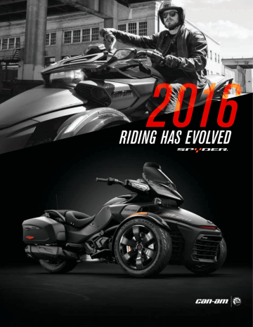 2016 RIDING HAS EVOLVED 1 THE EVOLUTION OF RIDING CONTINUES We can live our lives in anticipation of the destination, or we can experience the adventure of getting there. We can sit idle, waiting to arrive or we can open the throttle and enjoy the twists, the turns and the open-air exhilaration of it all. The destination has been given a purpose. The journey has evolved. 2 3 F3 SPYDER EXHILIRATION, HOWEVER YOU LIKE IT. Presenting the 2016 Can-Am ® Spyder ® line-up featuring the new Spyder F3-T and Spyder F3 Limited. RT SPYDER AWARD-WINNING DESIGN The Spyder F3 has been named a 2015 Red Dot award winner for demonstrating exceptional product design and innovation. The Red Dot awards recognize the finest designs across many product categories and this recognition underscores our commitment to designing world-class recreational products. CONVENIENT TEST DRIVES Nothing compares to the feeling of riding a Can-Am Spyder. And it’s never been easier to experience— whether at a dealer or at a demo event. Visit CanAmSpyder.com for a calendar of upcoming events. EASY LICENSING RS SPYDER While there are a few exceptions, simplicity is the rule. Generally, licensing can be completed in one day, using the Can-Am Spyder for the road test. Information on regional license requirements is available at CanAmSpyder.com. A STRONG COMMUNITY F3-T SPYDER From group rides to online discussions, the large and active community of Can-Am Spyder owners offers new riders support, advice and camaraderie. Facebook, Twitter, Instagram and forums are good ways to connect with the community. * TO LEARN MORE OR TO SCHEDULE A TEST RIDE, VISIT CANAMSPYDER.COM ST SPYDER FROM A TRUSTED NAME Built by BRP, every Can-Am Spyder shares its DNA with some of the most exciting, innovative and reliable names in powersports—Ski-Doo ® snowmobiles, Sea-Doo ® watercraft, Can-Am ATVs and side-by-side vehicles, Evinrude ® outboards, and Rotax® engines. *Shown with accessories 4 5 WHERE CONVENTION ENDS, THE ULTIMATE JOURNEY BEGINS. When you ride a Can-Am Spyder F3, the destination becomes the ride itself; a one-of-a-kind experience in open-air riding. A cruising riding position, low center of gravity and performance-calibrated Vehicle Stability System provide dynamic handling and great cornering, while ensuring unprecedented control. The Rotax 1330 ACE™ engine offers the power, torque and signature exhaust note guaranteed to make every journey exhilarating. 6 7 SPYDER F3 KEY FEATURES: Rotax 1330 ACE In-Line 3-Cylinder Engine Semi-Automatic or Manual 6-Speed Transmission with reverse STEEL BLACK METALLIC Stability Control, Traction Control and Anti-Lock Brakes Dynamic Power Steering UFit system High-Performance Brembo† Braking System Gas-charged FOX† PODIUM† Shocks Anti-Theft System 6.5 Gallons (24.4 L) of Cargo Space 6-Spoke Metallic Silver Front Wheels SPYDER F3-S ALL SPYDER F3 FEATURES, PLUS: Distinctive “S” Trim Signature Machined, Deep Black High Gloss Front Wheels PEARL WHITE Black Suede Seat with Red Stitching Refined Front Fenders with LED Lights Cruise Control PURE MAGNESIUM METALLIC WITH CAN-AM RED FRAME CAN-AM RED SOLID GLOSS Also available in Special Series MONOLITH BLACK SATIN 8 9 New for 2016, the Can-Am Spyder F3-T and F3 Limited offer greater freedom and flexibility. Loaded with comfort and convenience features, both models blend performance with practicality and feature extra cargo space for longer rides. SPYDER F3-T ALL SPYDER F3-S FEATURES, PLUS: And to make the journey as comfortable as possible, all Spyder F3 models also feature the exclusive UFit system, allowing the rider to adjust the riding position to find a truly customized fit, feel and riding experience SACHS† Big-Bore Shocks Integrated Hard Side Luggage for a total vehicle cargo capacity of 21 Gallons (78 L) Convenience Console including Glove Box, Tinted Windshield and Integrated Rear-View Mirror Machined, Deep Black High Gloss Front Wheels Premium Color Digital Gauge Trailer Ready Optional 4-Speaker Audio System with USB Port PEARL WHITE STEEL BLACK METALLIC PURE MAGNESIUM METALLIC WITH CAN-AM RED FRAME INTENSE RED PEARL SPYDER F3 LIMITED ALL SPYDER F3-T FEATURES, PLUS: 4-Speaker Audio System with USB Port Rider Heated Grips PEARL WHITE Rider Footboards Limited Trim Signature Seat Shamrock Chrome Front Wheels STEEL BLACK METALLIC Additional Pieces in Chrome INTENSE RED PEARL Also available in Special Series MONOLITH BLACK SATIN *Spyder F3-T shown with accessories 10 11 INTRODUCING THE 2016 CAN-AM SPYDER SPECIAL SERIES IN TRIPLE BLACK. Embrace the darkness with the limited-production Special Series Spyder F3-S, F3 Limited and RT-S. Featuring exclusive Triple Black coloration and graphics, unique six-spoke front wheels in black chrome and a signature seat. Reserve yours before they disappear. 12 13 U-FIT U-FIT DRAG BAR Part of the UFit System. Race-inspired straight bar is wide and more forward for a more aggressive riding position or tall drivers. UNIQUE BEGINS WITH U Create a Can-Am Spyder that’s as unique as you are. Let our exclusive 4U guide kick start your customization. Choose and cruise. As easy as 1-2-3-4. Now you can tailor your Can-Am Spyder to fit you like a dream. Tweak and adjust the fit that lets you truly connect with your ride. It’s all about comfort and enjoying every stretch and curve of the road to freedom. U-FUNCTION Every outing is different and that’s part of the fun. Customize your Can-Am Spyder for the way you usually ride, and thanks to our easy-to-add or -remove integrated accessories, you can adjust as you need. Is it a solo or 2-up trip today? Stripped down or fully loaded? It’s your journey— do it your way. U-STYLE Personalization speaks volumes about who you are, and our custom accessories let you say it with added sophistication and style. Don’t just embrace your inner self, make a statement. U-PERFORMANCE Unleash the untapped power and handling of your Can-Am Spyder with our performance-boosting
