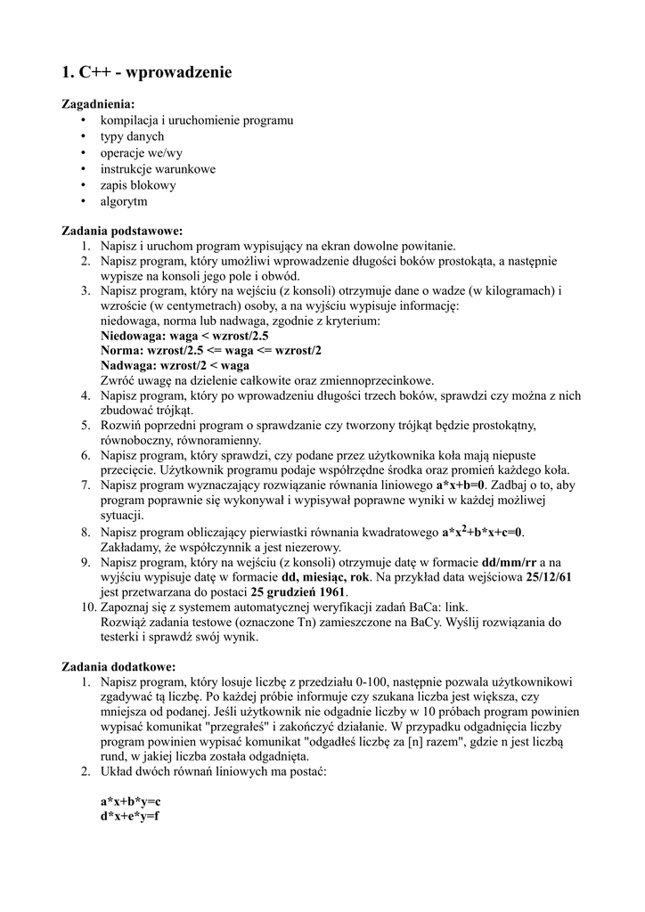 1. C++ - wprowadzenie Zagadnienia: • kompilacja i uruchomienie programu • typy danych • operacje we/wy • instrukcje warunkowe • zapis blokowy • algorytm Zadania podstawowe: 1. Napisz i uruchom program wypisujący na ekran dowolne powitanie. 2. Napisz program, który umożliwi wprowadzenie długości boków prostokąta, a następnie wypisze na konsoli jego pole i obwód. 3. Napisz program, który na wejściu (z konsoli) otrzymuje dane o wadze (w kilogramach) i wzroście (w centymetrach) osoby, a na wyjściu wypisuje informację: niedowaga, norma lub nadwaga, zgodnie z kryterium: Niedowaga: waga < wzrost/2.5 Norma: wzrost/2.5 <= waga <= wzrost/2 Nadwaga: wzrost/2 < waga Zwróć uwagę na dzielenie całkowite oraz zmiennoprzecinkowe. 4. Napisz program, który po wprowadzeniu długości trzech boków, sprawdzi czy można z nich zbudować trójkąt. 5. Rozwiń poprzedni program o sprawdzanie czy tworzony trójkąt będzie prostokątny, równoboczny, równoramienny. 6. Napisz program, który sprawdzi, czy podane przez użytkownika koła mają niepuste przecięcie. Użytkownik programu podaje współrzędne środka oraz promień każdego koła. 7. Napisz program wyznaczający rozwiązanie równania liniowego a*x+b=0. Zadbaj o to, aby program poprawnie się wykonywał i wypisywał poprawne wyniki w każdej możliwej sytuacji. 8. Napisz program obliczający pierwiastki równania kwadratowego a*x2+b*x+c=0. Zakładamy, że współczynnik a jest niezerowy. 9. Napisz program, który na wejściu (z konsoli) otrzymuje datę w formacie dd/mm/rr a na wyjściu wypisuje datę w formacie dd, miesiąc, rok. Na przykład data wejściowa 25/12/61 jest przetwarzana do postaci 25 grudzień 1961. 10. Zapoznaj się z systemem automatycznej weryfikacji zadań BaCa: link. Rozwiąż zadania testowe (oznaczone Tn) zamieszczone na BaCy. Wyślij rozwiązania do testerki i sprawdź swój wynik. Zadania dodatkowe: 1. Napisz program, który losuje liczbę z przedziału 0-100, następnie pozwala użytkownikowi zgadywać tą liczbę. Po każdej próbie informuje czy szukana liczba jest większa, czy mniejsza od podanej. Jeśli użytkownik nie odgadnie liczby w 10 próbach program powinien wypisać komunikat "przegrałeś" i zakończyć działanie. W przypadku odgadnięcia liczby program powinien wypisać komunikat "odgadłeś liczbę za [n] razem", gdzie n jest liczbą rund, w jakiej liczba została odgadnięta. 2. Układ dwóch równań liniowych ma postać: a*x+b*y=c d*x+e*y=f Rozwiązanie: Wyznacznik główny: wg=a*e-b*d Wyznacznik x: wx=c*e-b*f Wyznacznik y: wy=a*f-c*d Jeżeli wg jest równe zeru to jeżeli wx różne od zera lub wy różne od zera to układ sprzeczny w przeciwnym wypadku istnieje nieskończenie wiele rozwiązań o postaci jeżeli b jest rózne od zera y=c/b-a/b*x w przeciwnymn wypadku jeżeli e jest różne od zera y=f/e-d/e*x w przeciwnym wypadku x=wx/wg y=wy/wg Algorytm nie wyczerpuje wszystkich możliwości - w ogólnym przypadku należy badać i porównywać rzędy odpowiednich macierzy.