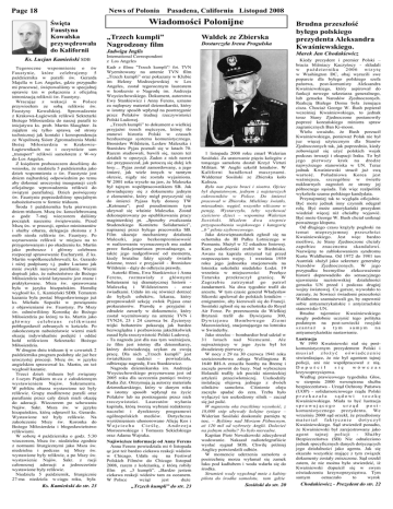 Page 18 News of Polonia Pasadena, California Listopad 2008 Święta Faustyna Kowalska przywędrowała do Kalifornii Ks. Lucjan Kamieński SDB Tegoroczne wspomnienie o św Faustynie, które celebrujemy 5 października w parafii św. Gerarda Majella w Los Angeles, gdzie przypadło mi pracować, świętowaliśmy w specjalnej oprawie tzn w połączeniu z oficjalną intronizacją relikwii św. Faustyny. Wracając z wakacji w Polsce przywiozłem ze sobą relikwie św. Faustyny Kowalskiej. Sprowadzenie z Krakowa-Łagiewnik relikwii Sekretarki Bożego Miłosierdzia do naszej parafii to inicjatywa ks. prob. Martin Slaughter. Ja zająłem się tylko sprawą od strony technicznej jak kontakt i korespondencja ze Wspólnotą Sióstr Zgromadzenia Matki Bożej Miłosierdzia w KrakowieŁagiewnikach no i oczywiście sam „transport” relikwii samolotem z W-wy do Los Angeles. Z księdzem proboszczem doszliśmy do wniosku, że niedziela 5 października jako dzień wspomnienia o św. Faustynie jest dniem najbardziej odpowiednim po temu aby dokonać uroczystej inauguracji czyli oficjalnego wprowadzenia relikwii do świątyni parafialnej. Dzień poświęcony św. Faustynie poprzedziliśmy specjalnym nabożeństwem w formie triduum. Środa 1 października była pierwszym dniem triduum. Mszą św. koncelebrowaną o godz 7-mej wieczorem daliśmy początek naszemu świętowaniu. Przed Mszą św. w procesji, oprócz ministrantów i służby ołtarza, delegacja złożona z 3 osób niosła relikwie św. Faustyny. Po usytuowaniu relikwii w miejscu na to przygotowanym i po okadzeniu ks. Martin jako proboszcz i główny celebrans rozpoczął sprawowanie Eucharystii. Z ks. Martin współkoncelebrowali; ks. Gerardo i niżej podpisany t.j. padre Luciano jak mnie zwykli nazywać parafianie. Wierni dopisali jako, że nabożeństwo do Bożego Miłosierdzia wśród latynosów jest znane i praktykowane. Msza św. sprawowana była w języku hiszpańskim. Homilię wygłosił ks. L. Kamieński SDB. Tematem kazania była postać błogosławionego już ks. Michała Sopoćki w powiązaniu z objawieniami św. Faustyny. Po Mszy św. odmówiliśmy Koronkę do Bożego Miłosierdzia po której to ks. Martin jako główny celebrans relikwiami pobłogosławił zebranych w kościele. Po zakończonym nabożeństwie wierni mieli okazję indywidualnie podejść i oddać hołd relikwiom Sekretarki Bożego Miłosierdzia. W drugim dniu triduum tj w czwartek 2 października program podobny ale już bez uroczystej procesji. Mszę św. w języku angielskim sprawował ks. Martin, on też wygłosił kazanie. Trzeci dzień triduum był związany z I-szym Piątkiem m-ca z całodziennym wystawieniem Najśw. Sakramentu. W pobliżu ołtarza wystawione też były relikwie. Grupy modlitewne parafii oraz parafianie przez cały dzień mieli okazję do adoracji. Wieczorem po schowaniu Najśw. Sakr. Msza św. w języku hiszpańskim, którą odprawił ks. Gerardo. Wystawione też były relikwie. Na zakończenie Mszy św. Koronka do Bożego Miłosierdzia i błogosławieństwo relikwiami. W sobotę 4 października o godz. 5:30 wieczorem, Msza św. niedzielna zgodnie z normami liturgicznymi jako Msza św. niedzielna i podczas tej Mszy św. wystawione były relikwie, a po Mszy św. wystawienie Najśw. Sakr. z racji całonocnej adoracji a jednocześnie wystawione były relikwie. Niedziela 5 październik, liturgicznie 27-ma niedziela w ciągu roku, była Ks. Kamieński do str. 23 Wiadomości Polonijne „Trzech kumpli” Nagrodzony film Waldek ze Zbierska Dostarczyła Irena Progulska Jadwiga Inglis International Correspondent z Los Angeles Kadr z filmu "Trzech kumpli"/ fot. TVN Wyemitowany na antenie TVN film „Trzech kumpli” oraz pokazany w Klubie im Heleny Modrzejewskiej w Los Angeles, został tegorocznym laureatem w konkursie o Nagrodę im. Andrzeja Woyciechowskiego. Dokument, autorstwa Ewy Stankiewicz i Anny Ferens, uznano za najlepszy materiał dziennikarski, który w istotny sposób wpłynął na postrzeganie przez Polaków trudnej rzeczywistości Polski Ludowej. „Trzech kumpli” to dokument o wielkiej przyjaźni trzech mężczyzn, której tło stanowi historia Polski w czasach bezdusznego systemu komunistycznego. Bronisław Wildstein, Lesław Maleszka i Stanisław Pyjas poznali się w latach 70. Razem studiowali, bawili się, razem też działali w opozycji. Żaden z nich nawet nie przypuszczał, jak potoczą się dalej ich losy… Pyjas został zamordowany, a jego śmierć, jak wiele innych w tamtym okresie, nigdy nie została wyjaśniona. W 2001 roku wyszło na jaw, że Maleszka był tajnym współpracownikiem SB. Jak dowiadujemy się z dokumentu jednym z elementów, który mógł przyczynić się do śmierci Pyjasa były donosy TW „Ketmana”; pod pseudonimem tym ukrywał się właśnie Maleszka. Został dekonspirowany po opublikowaniu pracy magisterskiej pt. „Sposoby zwalczania Studenckiego Komitetu Solidarności”, napisanej przez byłego pracownika SB. Film ukazuje mechanizmy działania Maleszki, jego bezkompromisowość w realizowaniu wyznaczonych mu zadań przez funkcjonariusza prowadzącego, a także jego nadgorliwość od momentu, kiedy brutalne fakty ujrzały światło dzienne, trzeci z przyjaciół - Bronisław Wildstein - dąży do odkrycia prawdy. Autorki filmu, Ewa Stankiewicz i Anna Ferens, rozmawiały z głównymi bohaterami tej dramatycznej historii Maleszką i Wildsteinem - oraz świadkami. Udało im się również dotrzeć do byłych esbeków, lekarza, który przeprowadził sekcję zwłok Pyjasa oraz prokuratorów. Prawdę o przyjaźni i zdradzie zawarły w dokumencie, który został wyemitowany na antenie TVN i TVN24, 23 i 24 czerwca br. Życiorysy trójki bohaterów pokazują jak bardzo bezwzględna i pozbawiona jakichkolwiek zasad była rzeczywistość Polski Ludowej. - Ta nagroda jest dla nas tym ważniejsza, że film jest istotny dla dziennikarzy, którzy doświadczają szykan za swoją pracę. Dla nich „Trzech kumpli” j