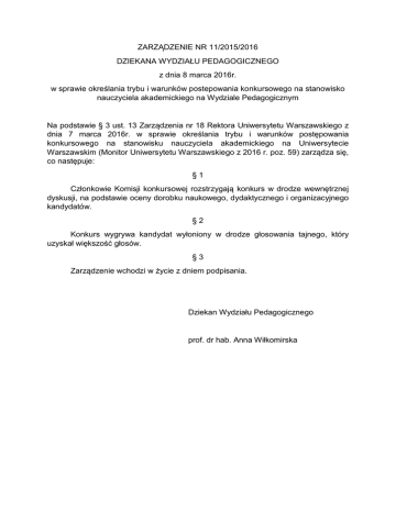 ZARZĄDZENIE NR 11/2015/2016 DZIEKANA WYDZIAŁU PEDAGOGICZNEGO z dnia 8 marca 2016r. w sprawie określania trybu i warunków postepowania konkursowego na stanowisko nauczyciela akademickiego na Wydziale Pedagogicznym Na podstawie § 3 ust. 13 Zarządzenia nr 18 Rektora Uniwersytetu Warszawskiego z dnia 7 marca 2016r. w sprawie określania trybu i warunków postępowania konkursowego na stanowisku nauczyciela akademickiego na Uniwersytecie Warszawskim (Monitor Uniwersytetu Warszawskiego z 2016 r. poz. 59) zarządza się, co następuje: §1 Członkowie Komisji konkursowej rozstrzygają konkurs w drodze wewnętrznej dyskusji, na podstawie oceny dorobku naukowego, dydaktycznego i organizacyjnego kandydatów. §2 Konkurs wygrywa kandydat wyłoniony w drodze głosowania tajnego, który uzyskał większość głosów. §3 Zarządzenie wchodzi w życie z dniem podpisania. Dziekan Wydziału Pedagogicznego prof. dr hab. Anna Wiłkomirska