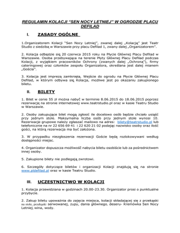 REGULAMIN KOLACJI “SEN NOCY LETNIEJ” W OGRODZIE PLACU DEFILAD I. ZASADY OGÓLNE 1.Organizatorem Kolacji “Sen Nocy Letniej”, zwanej dalej „Kolacją” jest Teatr Studio z siedzibą w Warszawie przy placu Defilad 1, zwany dalej „Organizatorem”. 2. Kolacja odbędzie się̨ 20 czerwca 2015 roku na Płycie Głównej Placu Defilad w Warszawie. Osoba przebywająca na terenie Płyty Głównej Placu Defilad podczas Kolacji, z wyjątkiem pracowników Ochrony (zwanych dalej „Ochroną”), firmy cateringowej oraz członków zespołu Organizatora, określana jest dalej mianem „Gościa”. 3. Kolacja jest imprezą zamkniętą. Wejście do ogrodu na Płycie Głównej Placu Defilad, w którym odbywa się̨ Kolacja, możliwe jest po okazaniu zakupionego biletu. II. BILETY 1. Bilet w cenie 55 zł można nabyć́ w terminie 8.06.2015 do 18.06.2015 poprzez rezerwację na stronie internetowej www.teatrstudio.pl oraz w kasie Teatru Studio w Warszawie. 2. Osoby zakupujące bilet mogą zgłosić ile docelowo osób będzie chciało usiąść przy jednym stole. Maksymalna liczba osób przy jednym stole wynosi 10. Rezerwacje grupowe należy zgłaszać mailowo na adres: [email protected] lub telefonicznie na nr 22 656 69 41 i 22 620 21 02 podając nazwisko osoby oraz ilość gości, na którą rezerwacja ma być założona. 3. W przypadku niezgłoszenia rezerwacji Goście będą rozlokowywani według dostępności miejsc. 4. Organizator dopuszcza możliwość́ nabycia biletu osobiście lub za pośrednictwem innej osoby. 5. Zakupione bilety nie podlegają̨ zwrotowi. 6. Szczegóły dotyczące biletów i organizacji Kolacji znajdują̨ się̨ na stronie www.pldefilad.pl oraz w kasie Teatru Studio. III. UCZESTNICTWO W KOLACJI 1. Kolacja przewidziana w godzinach 20.00-23.30. Organizator prosi o punktualne przybycie. 2. Zakup biletu upoważnia do zajęcia miejsca, kolacji składającej się z przekąski na stole, przekąski serwowanej, zupy, dania głównego, deseru- Kremówka Sen Nocy Letniej, wina, wody. 3. W trakcie kolacji będzie można dokupić napoje bezalkoholowe, alkoholowe lub koktajle w dwóch barach ustawionych na Płycie Głównej Placu Defilad od strony Cafe Kulturalna i Bar Studio. 4. Organizator zastrzega możliwość zmiany w menu. 5. Rozstawienie stolików może ulec zmianie jeśli będzie tego wymagać sytuacja rezerwacyjna. IV. BEZPIECZEŃSTWO I ODPOWIEDZIALNOŚĆ ZA SZKODY 1. Nad bezpieczeństwem Gości czuwa Ochrona. 2. Organizator oraz pracownicy Ochrony mogą̨ odmówić́ wstępu na Kolacje i/lub przebywania na nim osobom: znajdującym się̨ pod widocznym wpływem alkoholu, środków odurzających itp.; zachowującym się̨ agresywnie, prowokacyjnie albo w inny sposób stwarzającym zagrożenie bezpieczeństwa gości i/lub pracowników Organizatora; 3. Na Kolacje zakazuje się̨ wnoszenia i posiadania broni, narkotyków i innych materiałów niebezpiecznych. Osobom posiadającym przy sobie wyżej wskazane przedmioty Organizator i/lub pracownicy Ochrony mają prawo odmówić́ wstępu bądź́ przebywania na Kolacji. 4. Gość́ lub inna osoba, która zakłóca spokój Gości, zaburza przebieg Kolacji, jest agresywna, niszczy mienie Organizatora i Partnerów Wydarzenia bądź́ łamie niniejszy Regulamin Kolacji zostanie niezwłocznie wyproszona z Kolacji przez Organizatora i/lub pracowników Ochrony. 5. Gościom i innym osobom wyproszonym z Kolacji nie przysługuje prawo do zwrotu kosztów zaproszenia ani dochodzenia innych roszczeń́. 6. Gość odpowiada za naprawienie wszelkich szkód i zniszczeń́ powstałych z jego winy w trakcie lub w związku z jego obecnością̨ na terenie Płyty Głównej Placu Defilad i Pałacu Kultury i Nauki podczas Kolacji. 7. W trakcie Kolacji zabrania się palenia tytoniu poza miejscami specjalnie do tego wyznaczonymi. 8. Odpowiedzialność́ Organizatora za wszelkie szkody związane lub wynikające z uczestnictwa Gości w Kolacji ograniczona jest do szkody wyrządzonej z winy umyślnej. 9. Organizator nie ponosi odpowiedzialności za rzeczy zgubione i/lub pozostawione przez Gości na terenie Płyty Głównej Placu Defilad oraz w Pałacu Kultury i Nauki. 10. Przed zakupem biletu prosimy o staranne przeanalizowanie menu pod kątem uczuleń pokarmowych. Organizator nie ponosi odpowiedzialności za ew. Konsekwencje spożycia produktów wywołujących reakcje alergiczne. V. ROZWIĄZANIA KOLACYJNE W SYTUACJI DESZCZU 1. Organizator przeniesie kolacje z Płyty Głównej Placu Defilad do Sali Ratuszowej Pałacu Kultury I Nauki jeśli warunki atmosferyczne będą wykluczać organizację Kolacji w plenerze. 2. Ww. Przypadek będzie wprowadzony w trybie roboczym na ok 1 dzień przed planowaną Kolacją. 3. Jeśli w czasie trwania kolacji zmienią się warunki atmosferyczne co wykluczy kontynuację kolacji, goście będą mogli kontynuować wieczór w Sali Ratuszowej Pałacu Kultury i Nauki w formie niezasiadanej przy stolikach. VI. WARUNKI KOŃCOWE 1. Udział w Kolacji oznacza zgodę Gościa na bezpłatne wykorzystanie jego wizerunku przez Organizatora w celach dokumentacyjnych, reklamowych oraz promocyjnych. 2. Każdy z Gości nabywając bilet jednocześnie akceptuje treść niniejszego Regulaminu oraz jego przestrzegania. Regulamin dostępny jest na stronie internetowej wydarzenia (www.pldefilad.pl) oraz w Biurze Organizatora (Plac Defilad 1- kasa Teatru Studio). 3. Organizator zastrzega sobie prawo do zmian w niniejszym Regulaminie. 4. W sprawach nieuregulowanych niniejszym Regulaminem stosuje się przepisy Kodeksu Cywilnego oraz innych właściwych ustaw.