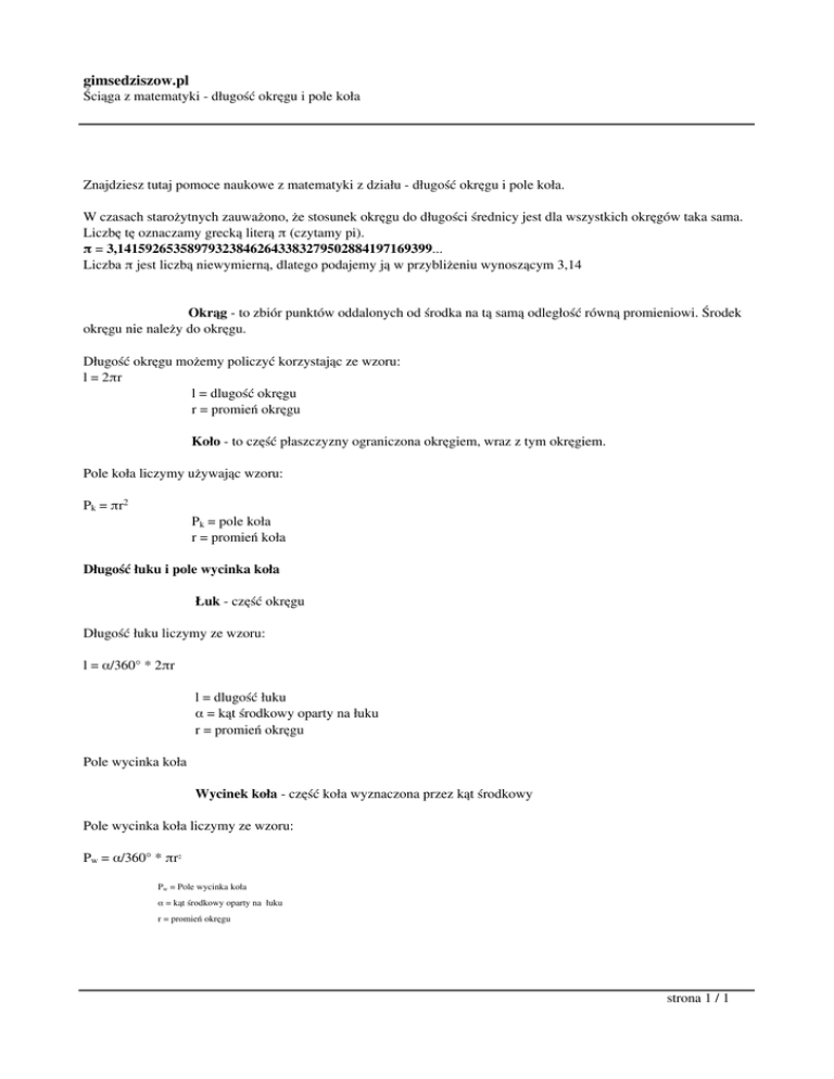gimsedziszow.pl Ściąga z matematyki - długość okręgu i pole koła Znajdziesz tutaj pomoce naukowe z matematyki z działu - długość okręgu i pole koła. W czasach starożytnych zauważono, że stosunek okręgu do długości średnicy jest dla wszystkich okręgów taka sama. Liczbę tę oznaczamy grecką literą π (czytamy pi). π = 3,141592653589793238462643383279502884197169399... Liczba π jest liczbą niewymierną, dlatego podajemy ją w przybliżeniu wynoszącym 3,14 Okrąg - to zbiór punktów oddalonych od środka na tą samą odległość równą promieniowi. Środek okręgu nie należy do okręgu. Długość okręgu możemy policzyć korzystając ze wzoru: l = 2πr l = dlugość okręgu r = promień okręgu Koło - to część płaszczyzny ograniczona okręgiem, wraz z tym okręgiem. Pole koła liczymy używając wzoru: Pk = πr2 Pk = pole koła r = promień koła Długość łuku i pole wycinka koła Łuk - część okręgu Długość łuku liczymy ze wzoru: l = α/360° * 2πr l = dlugość łuku α = kąt środkowy oparty na łuku r = promień okręgu Pole wycinka koła Wycinek koła - część koła wyznaczona przez kąt środkowy Pole wycinka koła liczymy ze wzoru: Pw = α/360° * πr2 Pw = Pole wycinka koła α = kąt środkowy oparty na łuku r = promień okręgu strona 1 / 1