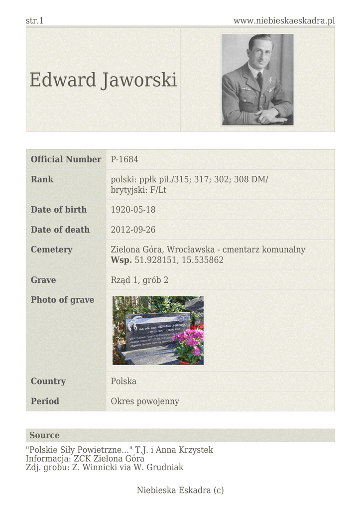 str.1 www.niebieskaeskadra.pl Edward Jaworski Official Number P-1684 Rank polski: ppłk pil./315; 317; 302; 308 DM/ brytyjski: F/Lt Date of birth 1920-05-18 Date of death 2012-09-26 Cemetery Zielona Góra, Wrocławska - cmentarz komunalny Wsp. 51.928151, 15.535862 Grave Rząd 1, grób 2 Photo of grave Country Polska Period Okres powojenny Source "Polskie Siły Powietrzne..." T.J. i Anna Krzystek Informacja: ZCK Zielona Góra Zdj. grobu: Z. Winnicki via W. Grudniak Niebieska Eskadra (c) str.2 www.niebieskaeskadra.pl Urodził się 18 maja 1920 roku w Trzebini. W sierpniu 1937 roku przeszedł kurs szybowcowy w Ustianowej. Po egzaminie dojrzałości w miesiącach czerwiec i lipiec 1938 odbył kurs samolotowy w Aleksandrowicach. Następnie zdawał do SPL w Dęblinie i został przyjęty. Między 15 sierpnia, a 15 września przebywał na obowiązkowym obozie pracy. Po tym rozpoczął służbę wojskową na Dywizyjnym Kursie Piechoty w Szkole Podchorążych Piechoty przy 20 Pułku Piechoty w Krakowie. 3 stycznia 1939 roku rozpoczął naukę w SPL w Dęblinie. Przeszedł kurs wyższego pilotażu w Ułężu. 8 września ewakuował się wraz z całym rocznikiem z Dęblina, by 17 września przekroczyć granicę z Rumunią. 15 października na greckim statku St. Nicolaus wypłynął w dalszą podróż. 21 października dotarł do Bejrutu. 22 października na Ville de Strasbourg odpłynął do Francji. Gdzie dotarł 29 października. Wraz z pozostałymi podchorążymi został umieszczony w bazie lotniczej w Istres. 16 października nastąpiło przeniesienie do bazy Lyon-Bron. W lutym 1940 roku został przetransportowany na Wyspy Brytyjskie. Po odmówieniu przysięgi podchorążowie, a wraz z nimi Jaworski, dnia 13 marca opuścili Anglię. Podchorążowie wysyłali delegację do gen. Sikorskiego uskarżając się na niewłaściwe traktowanie. 25 marca wszyscy przenośli się ponownie do Lyonu. 10 maja Niemcy napadli na Francję. 24 czerwca z St. Jean de Luce Jaworski ewakuuje się na statku Arandora Star . 27 czerwca statek zawinął do Liverpoolu. 6 listopada Jaworski otrzymał rozkaz udania się do Carlisle do 15 EFTS na wstępne przeszkolenie. 26 listopada wrocił do Polish Depot w Backpool. 14 stycznia 1941 roku rozpoczął szkolenie w 1. PFTS w Hucknall. Następnie odbył kurs w 55 OTU w Unsworth. 7 maja 1941 otrzymał przydział do 605 dywizjonu myśliwskiego stacjonującego w Bagington. 24 czerwca tegoż roku został przeniesiony do 315 dywizjonu myśliwskiego przebywającego w Speke. Po odbyciu tury bokjowej został przeniesiony na odpoczynek do 58 OTU w Grangemouth, a następnie do 61 OTU, w charakterze instruktora. Po odpoczynku 3 marca 1944 roku przeniesiono go do 317 dywizjonu myśliwskiego. 30 sierpnia otrzymał awans na dowódcę eskadry w 302 dywizjonie stacjonującym w Plumetot. Po ukończeniu II tury pracował jako oficer operacyjny 131 Skrzydła Myśliwskiego. 28 sierpnia 1945 roku oddelegowany został do 308 dywizjonu bazującego w Varelbusch. 19 grudnia 1946 roku zdemobilizowano go. Wrócił do kraju 22 lipca 1947 roku. Dopiero po 9 miesiącach otrzymał pracę w hutnictwie. We wrześniu 1948 roku otrzymał zakaz latania. W styczniu 1957 roku cofnięto ten zakaz. Od 1 października 1957 roku pracował jako pilot w lotnictwie sanitarnym w Zielonej Górze. 31 maja 1981 roku przeszedł na emeryturę. Został odznaczony Krzyżem Srebrnym Virttuti Militari, 3-krotnie Krzyżem Walecznych, DFC, Air Crew Europe, Atlantic Star, The Defence Medal, War, Medal, Medalem za udział w Wojnie Obronnej, Medalem Lotniczym, Krzyżem Czynu Zbrojnego PSZ na Zachodzie. W czasie wojny wykonał 300 lotów bojowych. 25 września 1973 roku otrzymał awans na stopień majora. W 1990 roku awansował na podpułkownika. Niebieska Eskadra (c)