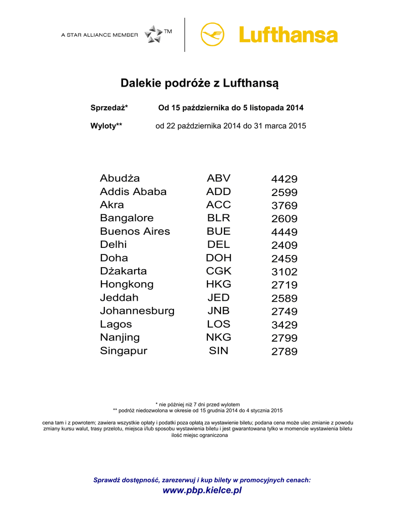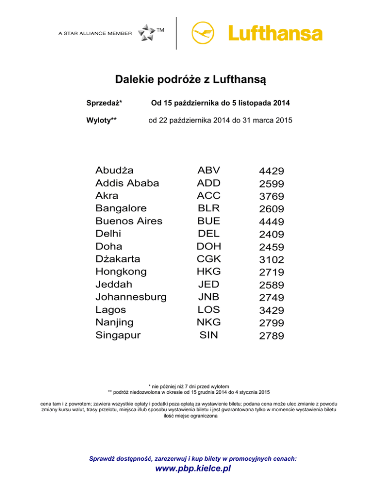 Dalekie podróże z Lufthansą Sprzedaż* Wyloty** Od 15 października do 5 listopada 2014 od 22 października 2014 do 31 marca 2015 Abudża Addis Ababa Akra Bangalore Buenos Aires Delhi Doha Dżakarta Hongkong Jeddah Johannesburg Lagos Nanjing Singapur ABV ADD ACC BLR BUE DEL DOH CGK HKG JED JNB LOS NKG SIN 4429 2599 3769 2609 4449 2409 2459 3102 2719 2589 2749 3429 2799 2789 * nie później niż 7 dni przed wylotem ** podróż niedozwolona w okresie od 15 grudnia 2014 do 4 stycznia 2015 cena tam i z powrotem; zawiera wszystkie opłaty i podatki poza opłatą za wystawienie biletu; podana cena może ulec zmianie z powodu zmiany kursu walut, trasy przelotu, miejsca i/lub sposobu wystawienia biletu i jest gwarantowana tylko w momencie wystawienia biletu ilość miejsc ograniczona Sprawdź dostępność, zarezerwuj i kup bilety w promocyjnych cenach: www.pbp.kielce.pl