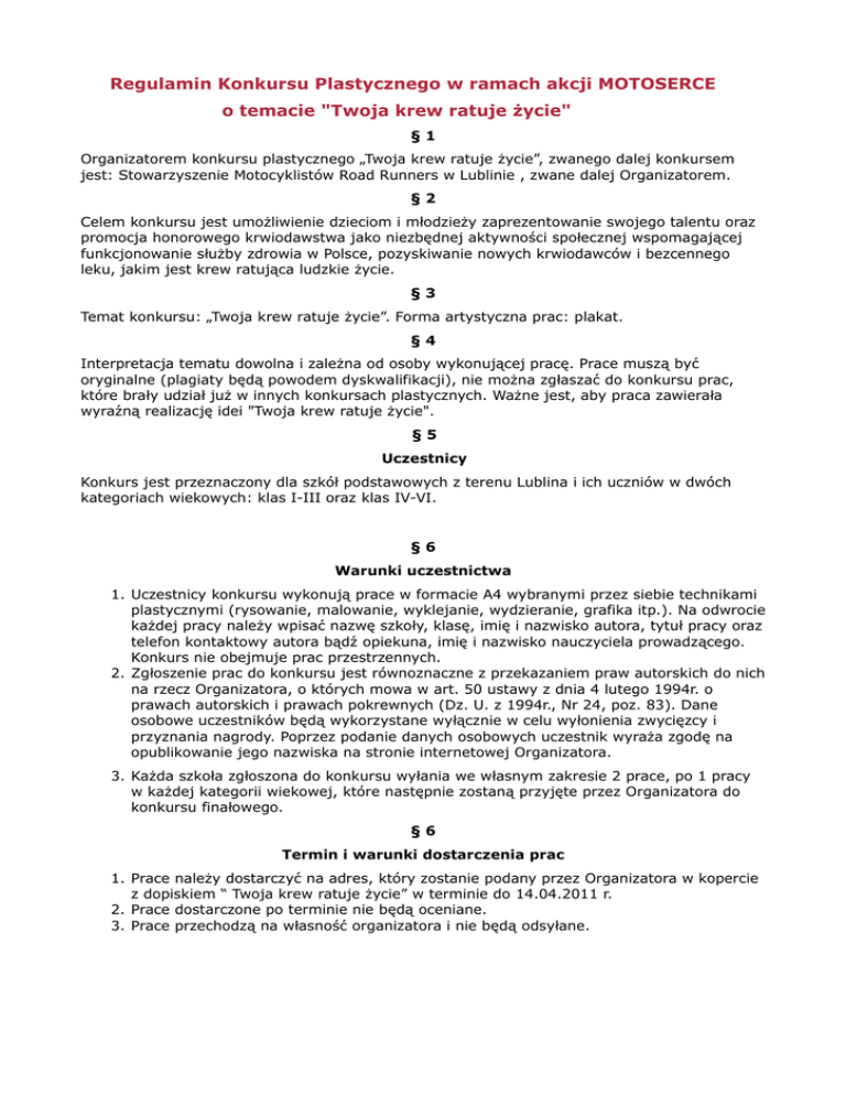 Regulamin Konkursu Plastycznego w ramach akcji MOTOSERCE o temacie "Twoja krew ratuje życie" §1 Organizatorem konkursu plastycznego „Twoja krew ratuje życie”, zwanego dalej konkursem jest: Stowarzyszenie Motocyklistów Road Runners w Lublinie , zwane dalej Organizatorem. §2 Celem konkursu jest umożliwienie dzieciom i młodzieży zaprezentowanie swojego talentu oraz promocja honorowego krwiodawstwa jako niezbędnej aktywności społecznej wspomagającej funkcjonowanie służby zdrowia w Polsce, pozyskiwanie nowych krwiodawców i bezcennego leku, jakim jest krew ratująca ludzkie życie. §3 Temat konkursu: „Twoja krew ratuje życie”. Forma artystyczna prac: plakat. §4 Interpretacja tematu dowolna i zależna od osoby wykonującej pracę. Prace muszą być oryginalne (plagiaty będą powodem dyskwalifikacji), nie można zgłaszać do konkursu prac, które brały udział już w innych konkursach plastycznych. Ważne jest, aby praca zawierała wyraźną realizację idei "Twoja krew ratuje życie". §5 Uczestnicy Konkurs jest przeznaczony dla szkół podstawowych z terenu Lublina i ich uczniów w dwóch kategoriach wiekowych: klas I-III oraz klas IV-VI. §6 Warunki uczestnictwa 1. Uczestnicy konkursu wykonują prace w formacie A4 wybranymi przez siebie technikami plastycznymi (rysowanie, malowanie, wyklejanie, wydzieranie, grafika itp.). Na odwrocie każdej pracy należy wpisać nazwę szkoły, klasę, imię i nazwisko autora, tytuł pracy oraz telefon kontaktowy autora bądź opiekuna, imię i nazwisko nauczyciela prowadzącego. Konkurs nie obejmuje prac przestrzennych. 2. Zgłoszenie prac do konkursu jest równoznaczne z przekazaniem praw autorskich do nich na rzecz Organizatora, o których mowa w art. 50 ustawy z dnia 4 lutego 1994r. o prawach autorskich i prawach pokrewnych (Dz. U. z 1994r., Nr 24, poz. 83). Dane osobowe uczestników będą wykorzystane wyłącznie w celu wyłonienia zwycięzcy i przyznania nagrody. Poprzez podanie danych osobowych uczestnik wyraża zgodę na opublikowanie jego nazwiska na stronie internetowej Organizatora. 3. Każda szkoła zgłoszona do konkursu wyłania we własnym zakresie 2 prace, po 1 pracy w każdej kategorii wiekowej, które następnie zostaną przyjęte przez Organizatora do konkursu finałowego. §6 Termin i warunki dostarczenia prac 1. Prace należy dostarczyć na adres, który zostanie podany przez Organizatora w kopercie z dopiskiem “ Twoja krew ratuje życie” w terminie do 14.04.2011 r. 2. Prace dostarczone po terminie nie będą oceniane. 3. Prace przechodzą na własność organizatora i nie będą odsyłane. §9 Zasady przyznawania nagród 1. O wyłonieniu zwycięzców konkursu decyduje powołana w tym celu Komisja Konkursowa, zwaną dalej Komisją. 2. Komisję powołuje Organizator. 3. Prace, które nie spełnią warunków regulaminowych nie będą klasyfikowane przez Komisję. 4. Spośród zgłoszonych do konkursu finałowego prac Komisja wybierze 10 przyznając po 3 nagrody główne w dwóch kategoriach wiekowych oraz 4 wyróżnienia. 5. Decyzja Komisji jest ostateczna i nieodwołalna. 6. Warunkiem ostatecznego przyznania nagród jest przedstawienie przez osoby, które zostaną wyłonione jako zwycięzcy potwierdzenia danych osobowych zamieszczonych na zwycięskich pracach. 7. Autorzy nagrodzonych i wyróżnionych prac powinni być obecni w dniu 16.04.2011 r. na imprezie MOTOSERCE, podczas której odbędzie się ogłoszenie wyników konkursu i wręczenie nagród oraz dyplomów / Organizator powiadomi o miejscu i godzinie opiekunów i nauczycieli prowadzących/.