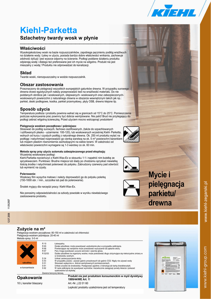 Kiehl-Parketta Szlachetny twardy wosk w płynie ⎯⎯⎯⎯⎯⎯⎯⎯⎯⎯⎯⎯⎯⎯⎯⎯⎯⎯⎯⎯⎯⎯⎯⎯⎯⎯⎯ Właściwości Wysokojakościowy wosk na bazie rozpuszczalników, zapobiega pęcznieniu podłóg wrażliwych na działanie wody. Łatwy w użyciu, posiada bardzo dobre właściwości wnikania, zachowuje zdolność dyfuzji i jest wysoce odporny na ścieranie. Podłogi poddane działaniu produktu odpierają wodę i dlatego też preferowane jest ich mycie na wilgotno. Produkt nie jest mieszalny z wodą ! Produktu nie odprowadzać do kanalizacji. Skład Twarde woski, nierozpuszczalny w wodzie rozpuszczalnik. Obszar zastosowania Przeznaczony do pielęgnacji wszystkich europejskich gatunków drewna. W przypadku surowego drewna drzew egzotycznych należy przeprowadzić test na wrażliwość materiału. Do nie poddanych obróbce jak i woskowanych, olejowanych- woskowanych oraz zabezpieczonychwoskowanych powierzchni z naturalnego drewna w obszarze wewnętrznym takich jak np.: parkiet, deski podłogowe, kostka, parkiet przemysłowy, płyty OSB, drewno klejone itp. Sposób użycia Temperatura podłoża i produktu powinna wahać się w granicach od 15°C do 25°C. Pomieszczenia podczas wykonywania prac powinny być dobrze wentylowane. Nie palić! Brud nie przylegający do podłogi zebrać wilgotną ściereczką. Przed użyciem mocno wstrząsnąć produktem! Pielęgnacja woskiem początkowa i późniejsza: Stosować do podłóg surowych, fachowo oszlifowanych, (także do szpachlowanych i szlifowanych płasko - uziarnienie: 100-120), lub woskowanych wcześniej Kiehl- Parketta, wolnych od kurzu i czystych podłóg z naturalnego drewna. Ok. 250 ml produktu wylać na podłogę i natychmiast rozprowadzić go cienką warstwą na ok. 5 m² powierzchni barankiem lub mopem płaskim równomiernie zachodzącymi na siebie torami. W zależności od właściwości powierzchni wymagane są 1-3 warstwy co ok. 60 min. Polerowanie: Woskowy film wysycha matowo i należy doprowadzić go do połysku polerką (150-1000 obr. / min., szczotka lub pad do polerowania). Środek myjący dla narzędzi pracy: Kiehl-Wax-Ex. 12.07.2006 11.09.2007 Nie ponosimy odpowiedzialności za szkody powstałe w wyniku niewłaściwego zastosowania produktu. Zużycie na m² Pielęgnacja woskiem początkowa: 80-150 ml w zależności od chłonności Pielęgnacja woskiem późniejsza: 20-40 ml Metoda spray: 3-5 ml R 10 R 65 R 66 R 67 R 52/53 szkodliwy w koncentracie Łatwopalny. Działa szkodliwie; może powodować uszkodzenie płuc w przypadku połknięcia. Powtarzające się narażenie może powodować wysuszanie lub pękanie skóry. Pary mogą wywoływać uczucie senności i zawroty głowy. Działa szkodliwie na organizmy wodne; może powodować długo utrzymujące się niekorzystne zmiany w w środowisku wodnym. S 24 Unikać zanieczyszczenia skóry. S 43 W przypadku pożaru używać gaśnic proszkowych lub gaśnic CO2. Nigdy nie używać wody S 51 Stosować wyłącznie w dobrze wentylowanych pomieszczeniach. S 61 Unikać zrzutów do środowiska. Postępować zgodnie z instrukcją lub kartą charakterystyki. S 62 W razie połknięcia nie wywoływać wymiotów: niezwłocznie zasięgnąć porady lekarza i pokazać opakowanie lub etykietę. Zawiera benzynę lakową. Opakowanie 10 L kansiter blaszany Produkt nie jest produktem konsumenckim w myśl dyrektywy 1999/44/WE Art. 1! Art.-Nr. j 22 01 60 Lepkość produktu uzależniona jest od temperatury Mycie i pielęgnacja parkietu/ drewna www.kiehl-zegarski.pl Metoda spray przy użyciu automatu zabezpieczonego przed eksplozją: Wcześniej woskowane podłogi: Kiehl-Parketta rozcieńczyć z Kiehl-Wax-Ex w stosunku 1:1 i napełnić nim butelkę ze spryskiwaczem. Punktowo: Brudne miejsca lub ślady po chodzeniu spryskać niewielką ilością środka i natychmiast polerować do połysku. Zabrudzony czerwony pad odwrócić lub wymienić na czysty.