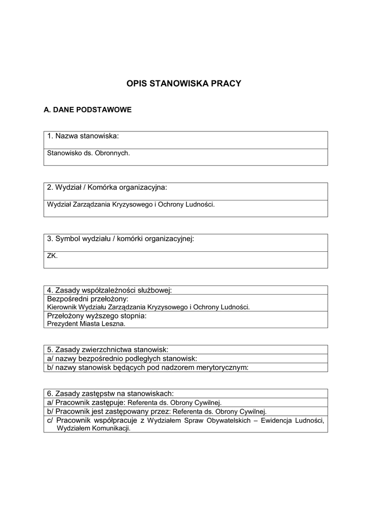 OPIS STANOWISKA PRACY A. DANE PODSTAWOWE 1. Nazwa stanowiska: Stanowisko ds. Obronnych. 2. Wydział / Komórka organizacyjna: Wydział Zarządzania Kryzysowego i Ochrony Ludności. 3. Symbol wydziału / komórki organizacyjnej: ZK. 4. Zasady współzaleŜności słuŜbowej: Bezpośredni przełoŜony: Kierownik Wydziału Zarządzania Kryzysowego i Ochrony Ludności. PrzełoŜony wyŜszego stopnia: Prezydent Miasta Leszna. 5. Zasady zwierzchnictwa stanowisk: a/ nazwy bezpośrednio podległych stanowisk: b/ nazwy stanowisk będących pod nadzorem merytorycznym: 6. Zasady zastępstw na stanowiskach: a/ Pracownik zastępuje: Referenta ds. Obrony Cywilnej. b/ Pracownik jest zastępowany przez: Referenta ds. Obrony Cywilnej. c/ Pracownik współpracuje z Wydziałem Spraw Obywatelskich – Ewidencja Ludności, Wydziałem Komunikacji. B. ZAKRES OBOWIĄZKÓW, UPRAWNIEŃ I ODPOWIEDZIALNOŚCI 1. Zakres obowiązków: Prowadzenie spraw w zakresie 1. Kancelarii tajnej 2. Nakładania świadczeń osobistych i rzeczowych na rzecz obrony 3. Planu Operacyjnego Miasta 4. Regulaminu Organizacyjnego Urzędu Miasta na czas „W” 5. Głównego stanowiska kierowania Prezydenta(Stały DyŜur, Akcja Kurierska) 6. Ćwiczeń, treningów i szkoleń obronnych 2. Zakres odpowiedzialności: Pracownik ponosi odpowiedzialność za mienie i wyposaŜenie, znajdujące się na stanie Wydziału. 3. Zakres uprawnień: Wnioskowanie w sprawach decyzji podejmowanych przez przełoŜonych. C. CHARAKTERYSTYKA WYMAGAŃ NA STANOWISKU 1. Wykształcenie pracownika: konieczne: WyŜsze. poŜądane: WyŜsze. 2. Praktyka zawodowa: konieczna: poŜądana: doświadczenie w pracy administracji rządowej lub samorządowej, praca w administracji wojskowej. 3. Uprawnienia konieczne: poŜądane: Przygotowanie merytoryczne w zakresie spraw obronnych, obrony cywilnej. Poświadczenie bezpieczeństwa, dostęp do informacji niejawnych stanowiących tajemnicę słuŜbową oznaczonych klauzulą „poufne”. 4. Wymagana wiedza specjalistyczna i umiejętności: Ustawy: 1. Konstytucja Rzeczypospolitej Polskiej z dnia 2 kwietnia 1997 r. 2. Ustawa z dnia 21 listopada 1967 r. o powszechnym obowiązku obrony RP. 3. Ustawa z dnia 18 kwietnia 2002 r. o stanie klęski Ŝywiołowej. 4. Ustawa z dnia 8 marca 1990 r. o samorządzie gminnym. 5. Ustawa z dnia 5 czerwca 1998 r. o samorządzie powiatowym. 6. Ustawa o ochronie informacji niejawnych. 7. Ustawa z dnia 14 czerwca 1960 r. Kodeks Postępowania Administracyjnego Dz. Rozporządzenia: 1. Rozporządzenie Rady Ministrów z dnia 28 września 1993 r. w sprawie powszechnej samoobrony ludności. 2. Rozporządzenie Rady Ministrów z dnia 25 czerwca 2002 r. w sprawie szczegółowego zakresu działania Szefa Obrony Cywilnej Kraju, szefów obrony cywilnej województw, powiatów i gmin. 3. Rozporządzenie Rady Ministrów z dnia 13 stycznia 2004 r. w sprawie ogólnych zasad wykonywania zadań w ramach powszechnego obowiązku obrony. 4. Rozporządzenie Ministra Kultury z dnia 25 sierpnia 2004 r. w sprawie organizacji i sposobu ochrony zabytków na wypadek konfliktu zbrojnego i sytuacji kryzysowych. 5. Rozporządzenie Rady Ministrów z dnia 13 stycznia 2004 r. w sprawie ogólnych zasad wykonywania zadań w ramach powszechnego obowiązku obrony. 6. Rozporządzenie Ministra Infrastruktury z dnia 7 maja 2004 r. w sprawie sposobu uwzględniania w zagospodarowaniu przestrzennym potrzeb obronności i bezpieczeństwa państwa. 7. Rozporządzenie Rady Ministrów w sprawie organizacji i funkcjonowania kancelarii tajnych; 8. Rozporządzenie Prezesa Rady Ministrów w sprawie trybu i sposobu przyjmowania, przewoŜenia, wydawania i ochrony materiałów zawierających informacje niejawne; 9. Rozporządzenie Prezesa Rady Ministrów w sprawie sposobu oznaczania materiałów, umieszczania na nich klauzuli tajności, a takŜe zmiany nadanej klauzuli tajności; 10. Rozporządzenie Prezesa Rady Ministrów w sprawie podstawowych wymagań bezpieczeństwa teleinformatycznego; 11. Rozporządzenie Prezesa Rady Ministrów w sprawie szczegółowego trybu przygotowywania i prowadzenia przez słuŜby ochrony państwa kontroli w zakresie ochrony informacji niejawnych; 12. Ustawa o samorządzie województwa, powiatu, gminy; 13. Ustawa o powszechnym obowiązku obrony RP; 14. Rozporządzenie Ministrów Spraw Wewnętrznych i Administracji, Obrony Narodowej oraz Infrastruktury w sprawie trybu doręczania kart powołania, rozplakatowania obwieszczeń o stawieniu się osób do czynnej słuŜby wojskowej; 15. Rozporządzenie Rady Ministrów w sprawie przygotowania systemu kierowania bezpieczeństwem narodowym; 16. Rozporządzenie Rady Ministrów w sprawie gotowości obronnej państwa; 17. Rozporządzenie Rady Ministrów w sprawie szkolenia obronnego; 18. Rozporządzenie Rady Ministrów w sprawie szczególnych zasad wykonywania zadań w ramach powszechnego obowiązku obrony; 19. Rozporządzenie Rady Ministrów w sprawie świadczeń osobistych na rzecz obrony w czasie pokoju; 20. Rozporządzenie Rady Ministrów w sprawie świadczeń rzeczowych na rzecz obrony w czasie pokoju; 21. Rozporządzenie Rady Ministrów w sprawie świadczeń osobistych i rzeczowych na rzecz obrony w razie ogłoszenia mobilizacji i w czasie wojny 22. Rozporządzenie Rady Ministrów w sprawie określenia limitu świadczeń rzeczowych wykonywanych 2006 r. na rzecz obrony; 23. Rozporządzenie Rady Ministrów w sprawie warunków i trybu planowania i finansowania zadań wykonywanych w ramach przygotowań obronnych państwa przez organy administracji rządowej i organy samorządu terytorialnego; 24. Rozporządzenie Rady Ministrów w sprawie przygotowania i wykorzystania systemów łączności na potrzeby obronne państwa; 5. Obsługa – komputery, programy komputerowe, maszyny, narzędzia, urządzenia: Praca wymaga znajomości obsługi radiostacji i radiotelefonu, obsługi komputera w zakresie poczty elektronicznej, programów Word, Excel, oraz specjalistycznych programów z zakresu spraw obronnyc