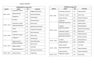 ZAJĘCIA OTWARTE godzina 9:00 – 10:30 PONIEDZIAŁEK 13 lutego 2017 zajęcia sala instruktor malarstwo i rysunek s. 10 Małgorzata Michniak zajęcia teatralne modelarnia ceramika malarstwo i rysunek 10:40 – 12:10 zajęcia komputerowe szachy ceramika 12:20 – 13:05 malarstwo i rysunek modelarnia zajęcia taneczne grafika warsztatowa 12:20 – 13:50 zajęcia wokalne zajęcia komputerowe s. 25 WTOREK 14 lutego 2017 zajęcia sala godzina Martyna Witowska 9:00 – 10:30 gimnastyka artystyczna s. 51 Elżbieta Nowak malarstwo i rysunek s. 19 Marta Jarosz s. 60 Paweł Dejnak zajęcia teatralne s. 25 Martyna Witowska s. 1C Marta Alenowicz modelarnia s. 60 Paweł Dejnak s. 19 Marta Jarosz s. 51 Elżbieta Nowak s. 18 Agnieszka Grzechowiak s. 1C Marta Alenowicz s. 11 Agnieszka Grzechowiak malarstwo i rysunek s. 19 Marta Jarosz zajęcia komputerowe s. 18 Elżbieta Ratajczyk s. 1 Monika Andreose ceramika s. 1C Marta Alenowicz edukacja filmowa s. 58 Jacek Marek zajęcia wokalne s. 15 Ewa Siwek s. 18 Elżbieta Ratajczyk s. 25 Martyna Witowska s. 10 Joanna Kaucz gimnastyka artystyczna ceramika grafika warsztatowa s. 27 Grzegorz Orzechowski s. 1C Marta Alenowicz s. 19 Marta Jarosz s. 60 Paweł Dejnak s. 51 Anna Wiatrowska s. 11 Beata Turska s. 15 Ewa Siwek s. 18 Agnieszka Grzechowiak s. 51 Izabela Ilów 10:40 – 12:10 gimnastyka artystyczna 12:20 – 13:05 12:20 – 13:50 zajęcia komputerowe zajęcia teatralne 15:40 – 16:25 zajęcia taneczne instruktor 15:40 – 16:25 malarstwo i rysunek ZAJĘCIA OTWARTE ŚRODA 15 lutego 2017 zajęcia sala godzina 9:00 – 10:30 10:40 – 12:10 12:20 – 13:05 godzina instruktor zajęcia taneczne gimnastyka artystyczna s. 51 Elżbieta Nowak ceramika s. 1C Marta Alenowicz laboratorium młodego technika s. 60 Małgorzata Merta zajęcia taneczne s. 1 Karolina Bodziony malarstwo i rysunek s. 10 Małgorzata Michniak ceramika grafika komputerowa s. 18 Elżbieta Ratajczyk grafika warsztatowa szachy s. 27 Grzegorz Orzechowski s. 1C Marta Alenowicz malarstwo i rysunek s. 51 Izabela Ilów szachy s. 11 Agnieszka Grzechowiak filmy na dużym ekranie s. 18 Elżbieta Ratajczyk ceramika zajęcia taneczne 12:20 – 13:50 CZWARTEK 16 lutego 2017 zajęcia sala grafika warsztatowa grafika komputerowa malarstwo i rysunek 9:00 – 10:30 szachy modelarnia gimnastyka artystyczna 10:40 – 12:10 12:20 – 13:05 grafika komputerowa ceramika zajęcia taneczne gimnastyka artystyczna grafika warsztatowa 12:20 – 13:50 grafika komputerowa malarstwo i rysunek zajęcia teatralne 14:00 – 15:30 gimnastyka artystyczna instruktor s. 1 Renata Doroba s. 19 Marta Jarosz s. 27 Grzegorz Orzechowski s. 60 Paweł Dejnak s. 51 Monika Andreose s. 1A Dorota Korzeniewska s. 11 Agnieszka Grzechowiak s. 18 Elżbieta Ratajczyk s. 19 Marta Jarosz s. 27 Grzegorz Orzechowski s. 58 Jarosław Skóra s. 1A Dorota Korzeniewska s. 1 Renata Doroba s. 51 Monika Andreose s. 11 Agnieszka Grzechowiak s. 18 Elżbieta Ratajczyk s. 19 Marta Jarosz s. 25 Krystyna Paraszkiewicz s. 51 Monika Andreose ZAJĘCIA OTWARTE PIĄTEK 17 lutego 2017 godzina 9:00 – 10:30 zajęcia zajęcia taneczne Anna Wiatrowska s. 51 Monika Andreose s. 52 Bożena Pałczyńska s. 52 Bożena Pałczyńska s. 51 Monika Andreose s. 1A Dorota Korzeniewska grafika komputerowa s. 18 Elżbieta Ratajczyk grafika komputerowa s. 18 Elżbieta Ratajczyk s. 25 Krystyna Paraszkiewicz gimnastyka artystyczna zajęcia przyrodnicze gimnastyka artystyczna 10:40 – 12:10 12:20 – 13:50 instruktor s. 1 zajęcia przyrodnicze 10:40 – 11:25 sala ceramika zajęcia teatralne *zmiana planu 18.01.2017 ZAJĘCIA OTWARTE WTOREK 21 lutego 2017 PONIEDZIAŁEK 20 lutego 2017 godzina zajęcia malarstwo i rysunek godzina zajęcia Marta Jarosz s. 25 Martyna Witowska s. 27 Grzegorz Orzechowski zajęcia przyrodnicze modelarnia s. 60 Paweł Dejnak ceramika ceramika s. 1C Marta Alenowicz zajęcia komputerowe s. 19 Marta Jarosz 9:00 – 10:30 szachy malarstwo i rysunek grafika warsztatowa szachy zajęcia przyrodnicze modelarnia ceramika malarstwo i rysunek 12:20 – 13:05 instruktor s. 19 zajęcia teatralne 10:40 – 12:10 sala warcaby stupolowe modelarnia s. 11 Beata Turska s. 27 Grzegorz Orzechowski s. 52 Wojciech Wawrecki s. 60 Paweł Dejnak s. 1C Marta Alenowicz s. 19 Marta Jarosz s. 27 Ryszard Chącki s. 60 Paweł Dejnak s. 15 Ewa Siwek s. 18 Agnieszka Grzechowiak s. 27 Ryszard Chącki s. 51 Izabela Ilów s. 10 Renata Bryjanowska zajęcia wokalne 9:00 – 10:30 Dariusz Włosiniak s. 19 Marta Jarosz s. 52 Wojciech Wawrecki s. 1C Marta Alenowicz s. 18 Elżbieta Ratajczyk s. 25 Martyna Witowska s. 58 Jacek Marek s. 60 Paweł Dejnak s. 1 Monika Andreose s. 1C Marta Alenowicz s. 19 Marta Jarosz s. 58 Jacek Marek s. 60 Paweł Dejnak s. 1 Monika Andreose s. 15 Ewa Siwek zajęcia komputerowe s. 18 Elżbieta Ratajczyk malarstwo i rysunek s. 10 Joanna Kaucz malarstwo i rysunek 10:40 – 12:10 edukacja filmowa modelarnia gimnastyka artystyczna ceramika malarstwo i rysunek edukacja filmowa modelarnia gimnastyka artystyczna zajęcia wokalne 12:20 – 13:50 13:10 – 13:55 zajęcia komputerowe warcaby stupolowe zajęcia taneczne zajęcia wokalne 12:20 – 13:50 15:40 – 16:25 15:40 – 16:25 malarstwo i rysunek instruktor s. 15 zajęcia teatralne 12:20 – 13:05 sala ZAJĘCIA OTWARTE ŚRODA 22 lutego 2017 zajęcia sala godzina instruktor szachy s. 27 Grzegorz Orzechowski zajęcia przyrodnicze s. 52 Bożena Pałczyńska s. 1C Marta Alenowicz s. 25 Martyna Witowska s. 1C Marta Alenowicz s. 51 Izabela Ilów s. 10 Joanna Kaucz grafika warsztatowa s. 11 Agnieszka Grzechowiak malarstwo i rysunek s. 10 Joanna Kaucz godzina malarstwo i rysunek 10:40 – 12:10 zajęcia teatralne 12:20 – 13:05 ceramika zajęcia taneczne 12:20 – 13:50 14:00 – 15:30 malarstwo i rysunek instruktor s. 19 Marta Jarosz s. 15 Dariusz Włosiniak s. 27 Grzegorz Orzechowski s. 52 Bożena Pałczyńska s. 60 Paweł Dejnak s. 1 Renata Doroba s. 51 Monika Andreose s. 1A Dorota Korzeniewska s. 18 Elżbieta Ratajczyk s. 19 Marta Jarosz 