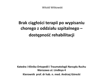 Witold Witkowski Brak ciągłości terapii po wypisaniu chorego z oddziału szpitalnego – dostępność rehabilitacji Katedra i Klinika Ortopedii i Traumatologii Narządu Ruchu Warszawa ul. Lindleya 4 Kierownik prof. dr hab. n. med. Andrzej Górecki Motto • Ruch jako lek nie ma substancji ani opakowania. Substancją tego leku jest pomysł zrodzony z nauki i doświadczenia. Jego podanie wymaga prawdziwego mistrzostwa. Przekazanie go choremu wraz z osobowością i sercem czyni ten lek niezastąpionym prof. Dega (1962) • Możliwości rehabilitacji • - ambulatoryjna • - oddział dzienny • - oddział stacjonarny • - rehabilitacja domowa • - telerehabilitacja • - rehabilitacja prywatna NFZ Procedura • Skierowanie od lekarza prowadzącego chorego w Oddziale • Rejestracja skierowania w odpowiednim podmiocie rehabilitacyjnym • Zapisanie w kolejkę do lekarza rehabilitacji • Wizyta konsultacyjna lekarza rehabilitacji – kwalifikacja do leczenia • Przyjęcie do odpowiedniego podmiotu rehabilitacyjnego Konsultacja lekarza rehabilitacji • Pełna dokumentacja medyczna chorego, dotycząca jego schorzenia ortopedycznego, jak i ogólnego stanu zdrowia • Konsultacja powinna być wykonana najpóźniej na dwa tygodnie przed przyjęciem chorego do oddziału rehabilitacji stacjonarnej Problemy z konsultacją Opłata za rehabilitację ogólnoustrojową czyli ortopedyczną • Rehabilitacja ogólnoustrojowa rozliczana jest ryczałtowo • Dzień pobytu w oddziale rehabilitacji stacjonarnej – osobodzień – około 126 zł • Dzień pobytu w oddziale rehabilitacji dziennej – osobodzień – 77 złotych • Opieka ambulatoryjna wg cennika NFZ Dokumenty z NFZ • Rehabilitacja ogólnoustrojowa w warunkach stacjonarnych (dane dla Mazowsza) • 2012 - 48 765 481 punktów • 2013 - 49 629 817 punktów • Po przeliczeniu z takiej ilości punktów można leczyć w ciągu roku w oddziałach rehabilitacji na Mazowszu 15 039 chorych, gdy ich pobyt w oddziale będzie wynosił 30 dni Dokumenty z NFZ • Rehabilitacja ogólnoustrojowa w ośrodku/oddziale dziennym • 2012 – 74 995 871 punktów • 2013 - 74 995 871 punktów • Po przeliczeniu z takiej ilości punktów można leczyć w ciągu roku w oddziale dziennym rehabilitacji 35 712 pacjentów, gdy pobyt w oddziale dziennym będzie wynosił 30 dni Dokumenty z NFZ • Inne warunki wymagane : zapewnienie pomocy lekarza w przypadku nagłego zachorowania lub pogorszenia stanu zdrowia w godzinach popołudniowych, wieczornych i nocnych – z zapisu tego wynika, że nie musi być lekarza dyżurnego w oddziale rehabilitacji – w szkoleniu do specjalizacji z rehabilitacji medycznej wymagane są dyżury lekarskie Dokumenty z NFZ • Inne warunki, dodatkowo oceniane : Gwarancja bezpośredniej kontynuacji usprawniania – sformalizowane zasady współpracy ze szpitalami/oddziałami szpitalnymi w sprawie kierowania pacjentów na rehabilitację – czy jest to martwy zapis ? Dokumenty NFZ – okres oczekiwania • Nazwa podmiotu CKR Konstancin – Gąsiorowskiego WSCHU Warszawa - Barska Konstancin - Wierzejewskiego Gorzewo – Kruk Lux-Med Tabitan ZOL Konstancin - Długa stabilny 1118 pacjentów 826 dni 207 294 631 410 464 892 190 247 pilny 273 226 84 41 203 87 81 43 77 145 Problemy • Pacjenci i rodzina - Należy mi się rehabilitacja - Co my zrobimy z chorą osobą w rodzinie - Lekarz mi dał skierowanie, to mam być przyjęty - Jestem po urazie lub operacji to mam być przyjęty od razu, a kolejka mnie nie interesuje Problemy • Lekarze • Chcę mieć święty spokój to dam skierowanie na rehabilitację • Jak rodzina jest roszczeniowa to dam skierowanie „pilne” • Większy spokój mam jak dam skierowanie do oddziału stacjonarnego • Lekarz rehabilitacji nie zdyskwalifikuje chorego do leczenia, bo też chce mieć święty spokój Problemy • Okres oczekiwania • Oddział stacjonarny rehabilitacji ogólnoustrojowej – od jednego do dwóch lat • Oddział dzienny rehabilitacji ogólnoustrojowej - około 4 miesięcy • Rehabilitacja domowa – około 3-4 miesięcy Problemy • Przyjęcia pilne Wg NFZ przyjęcie takie powinno nastąpić maksymalnie do 42 dni ( do oddziału rehabilitacji stacjonarnej jak i dziennej) od chwili jego zarejestrowania. W większości ośrodków istnieją dwie kolejki – pacjenci „ pilni” i pacjenci bez skierowania „pilne”. Problemy • Nadwykonania NFZ deklaruje, że nie będzie płacił za przekroczenie wykonania usług rehabilitacyjnych, bo nie są to działania ratujące życie. Są to usługi skracające okres niezdolności chorego do pracy, zmniejszające uzależnienie chorego od osób drugich, czyli przyśpieszające powrót do normalnego życia. Wnioski • Poprawa wyceny usług rehabilitacyjnych • Te same zasady rozliczania dla każdego rodzaju usług rehabilitacyjnych ( ogólnoustrojowe, neurologiczne, kardiologiczne) • Sformalizowane zasady przejmowania pacjentów po urazach lub zabiegach operacyjnych z ośrodków urazowo – ortopedycznych Wnioski • Lekarz wystawia skierowanie na konsultację w celu przyjęcia do oddziału rehabilitacyjnego (taka wizyta powinna być rozliczana przez NFZ osobno) • Na konsultację musi być dostarczona pełna dokumentacja chorego • Lekarze rehabilitacji jako konsultanci powinni kierować chorych do odpowiednich form rehabilitacji ( oddział stacjonarny, dzienny, rehabilitacja domowa) Wnioski • Poszukiwanie nowych form rehabilitacji : • Telerehabilitacja czyli rehabilitacja przez internet, z okresową kontrola chorego w ambulatorium • Rehabilitacja jak w oddziale dziennym z wynajęciem przez chorych hotelu – dla osób przyjeżdżających z daleka Wnioski • Zachowanie pacjentów : - Połowa wyzdrowienia to chęć wyzdrowienia - Wszyscy ludzie pragną dla siebie zdrowia, często zaś czynią to, co jest zdrowiu przeciwne Dziękuję za uwagę