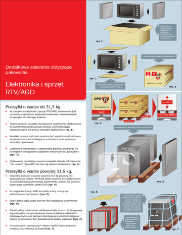 01:00 użycie formy styropianowej dopasowanej wielkością i kształtem do transportowanego asortymentu rys. 1 zastosowanie oznaczeń ostrzegawczych 01:00 Dodatkowe zalecenia dotyczące pakowania. rys. 2 Elektronika i sprzęt RTV/AGD www.dpd.com.pl wzmocnienie kantów oraz górnej i dolnej powierzchni towaru rys. 3 max 180 cm Przesyłki o wadze do 31,5 kg. www.dpd.com.pl ,W transporcie elektroniki i sprzętu RTV/AGD preferowane jest www.dpd.com.pl www.dpd.com.pl www.dpd.com.pl max. waga: 31,5 kg używanie oryginalnych opakowań producenta, dostosowanych do specyfiki określonego artykułu. ,Karton powinien posiadać styropianowe wypełnienie, dostosowane www.dpd.com.pl max. waga: 500 kg max. 120 cm EUR max. 80 cm rys. 4 do kształtu transportowanego artykułu uniemożliwiające przemieszczanie się towaru wewnątrz opakowania (rys. 1). zabezpieczenie wszystkich ścian styropianem ,Wszelkie puste przestrzenie powinny być wypełnione dodatkowym wypełniaczem uniemożliwiającym przemieszczanie się towaru wewnątrz opakowania. ,Dodatkowe wzmocnienia i usztywnienia powinny znajdować się jhkfjh na rogach i krawędziach szczególnie narażonych na uszkodzenia (rys. 2). ,Opakowanie zewnętrzne powinno posiadać naklejki ostrzegawcze: “nie rzucać”, “góra/dół” lub inne wg zaleceń producenta (rys. 3). Przesyłki o wadze powyżej 31,5 kg. ,Wszystkie przesyłki o wadze powyżej 31,5 kg powinny być spakowane na palecie. Wielkość palety powinna być dostosowana do wielkości transportowanego asortymentu, jednak nie powinna przekraczać rozmiarów palety EUR (rys. 4). ,W przypadku dużego AGD wszystkie ściany muszą być zabezpieczone styropianem (rys. 5). ,Rogi i górna część palety powinny być dodatkowo usztywnione (rys. 6). ,Całość palety powinna być zafoliowana folią stretch i (o ile wymaga tego specyfika transportowanego towaru) oklejona naklejkami ostrzegawczymi oraz taśmami plombującymi uniemożliwiającymi dostęp do zawartości bez pozostawienia śladów ingerencji (rys. 7). ,Na opakowaniu zewnętrznym należy umieścić dane adresowe nadawcy oraz odbiorcy przesyłki (rys. 7). rys. 5 rys. 6 zabezpieczenie palety taśmami plombującymi, oklejenie nalepkami ostrzegawczymi oraz oznaczenie opakowania zewnętrznego danymi adresowymi nadawcy oraz odbiorcy przesyłki Jan Kowalski ul.Kazimierzowska Warszawa przytwierdzenie towaru taśmami do palety, wzmocnienie rogów oraz górnej części Jan Kowalski ul.Kazimierzowska Warszawa www.dpd.com.pl www.dpd.com.pl rys. 7