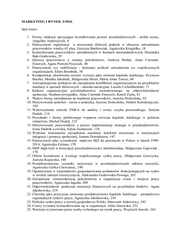 MARKETING I RYNEK 3/2016 Spis treści: 1. Formy edukacji sprzyjające kształtowaniu postaw przedsiębiorczych - próba oceny, Angelika Andrzejczyk, 8 2. Elastyczność organizacji a stosowanie dobrych praktyk w obszarze zatrudniania pracowników wiedzy 65 plus, Grażyna Bartkowiak, Agnieszka Krugiełka, 18 3. Kontrolowanie pracowników zatrudnionych w formach niestandardowych, Dominika Bąk-Grabowska, 29 4. Interesy pracownicze a zmiany pokoleniowe, Andrzej Bodak, Anna CierniakEmerych, Agata Pietroń-Pyszczek, 40 5. Elastyczność czy stabilizacja - dylematy polityki zatrudnienia we współczesnych organizacjach, Edyta Bombiak, 50 6. Kompetencje absolwenta uczelni wyższej jako element kapitału ludzkiego, Krystyna Buchta, Monika Jakubiak, Małgorzata Skiert, Maria Anna Turosz, 60 7. Antropologiczne podejście do zarządzania konfliktem organizacyjnym na przykładzie mediacji w sporach zbiorowych - metoda narracyjna, Leszek Cichobłaziński, 71 8. Kultura organizacyjna przedsiębiorstwa zorientowanego na odpowiedzialność społeczną. Studium przypadku, Anna Cierniak-Emerych, Kamil Zięba, 81 9. Wpływ formy zatrudnienia na lojalność pracowników, Justyna Dolecińska, 92 10. Motywowanie pokoleń - teoria a praktyka, Justyna Dolecińska, Hubert Kołodziejczyk, 103 11. Wykorzystanie metody FMEA do analizy i oceny ryzyka personalnego, Justyna Dudek, 114 12. Przesłanki i formy publicznego wsparcia rozwoju kapitału ludzkiego w polskim rolnictwie, Michał Dudek, 125 13. Motywowanie pracowników a proces implementacji strategii w przedsiębiorstwie, Irena Dudzik-Lewicka, Edyta Zachurzok, 134 14. Wybrane instrumenty zarządzania zasobami ludzkimi stosowane w instytucjach integracji i pomocy społecznej, Joanna Dzieńdziora, 147 15. Elastyczność płac czynnikiem napływu BIZ do przemysłu w Polsce w latach 19982014, Agnieszka Ertman, 159 16. MSP high-tech w koncepcji przedsiębiorczości intelektualnej, Małgorzata Gajowiak , 170 17. Oferta kształcenia a wymogi współczesnego rynku pracy, Małgorzata Gawrycka, Justyna Kujawska, 180 18. Pozaekonomiczne czynniki motywacji w przedsiębiorstwach sektora turystyki, Agnieszka Górka-Chowaniec, 190 19. Ograniczenia w racjonalności gospodarowania podmiotów funkcjonujących na rynku w świetle założeń teoretycznych, Aleksandra Grabowska-Powaga, 201 20. Zarządzanie różnorodnością pokoleniową a organizacja czasu i miejsca pracy pracowników, Agnieszka Jagoda, 209 21. Odpowiedzialność społeczna instytucji finansowych na przykładzie banków, Agata Jakubowska, 219 22. Choroba jako przyczyna utraconej produktywności kapitału ludzkiego - perspektywa regionalnych rynków pracy, Agnieszka Jakubowska, 230 23. Polityka rynku pracy a rozwój gospodarczy Polski, Sławomir Jankiewicz, 242 24. Cztery wymiary komunikowania się w organizacji, Julita Janowska, 252 25. Wartości wyznawane przez osoby wchodzące na rynek pracy, Wojciech Jarecki, 263 26. Współczesne systemy emerytalne w Polsce - elementy analizy porównawczej, Wacław Jarmołowicz, Tomasz Sikora, 272 27. Niedopasowania kompetencyjne i kwalifikacyjne absolwentów studiów doktoranckich, Urszula Jeruszka, 289 28. Zarządzanie talentami jako koncepcja zarządzania kapitałem ludzkim w MSP, Barbara Kamińska, 305 29. Zarządzanie zespołem w czasie zmiany własnościowej przedsiębiorstwa. Ujęcie retrospektywne, Sławomir Kamosiński, 315 30. Mechanizm generowania nowych miejsc pracy na przykładzie USA, Paweł Kazibudzki, 326 31. Wartość kontraktu psychologicznego w zespołach sprzedażowych, Olga Khomin, 337 32. Problemy polskich przedsiębiorców związane z zatrudnianiem migrantów z Ukrainy, Dariusz Klimek, 347 33. Neuronauka - perspektywa rozwoju zarządzania zasobami ludzkimi?, Monika Kłos, 357 34. Polskie kobiety jako użytkowniczki mediów społecznościowych, Magdalena Kowalska, 367 35. Szkolenia integracyjne i motywacyjne jako narzędzie kształtowania zaangażowania pracowników, Anna Krasnova, 379 36. Wpływ funkcji personalnej na pozytywny wizerunek pracodawcy, Janusz Kroik, Paweł Ziembicki, 390 37. Determinanty satysfakcji i zaangażowania w pracę, Katarzyna Krot, Dagmara Lewicka, 400 38. Przywództwo w organizacji a jej innowacyjność, Marek Kruk, 411 39. Wpływ poziomu umiędzynarodowienia środowiska pracy na proces adaptacji pracowniczej, Iwona Kubica, 421 40. Mocne i słabe strony serwisów społecznościowych jako narzędzi komunikacji interpersonalnej, Diana Kuliś, 432 41. Bierność zawodowa kobiet i mężczyzn. Polska na tle Unii Europejskiej, Marek Kunasz, 443 42. Czynniki determinujące szanse na szkolenie w organizacji - analiza ekonometryczna, Marek Kunasz, 457 43. Postawy pracowników organizacji publicznej wobec konsultatywy, Regina LenartGansiniec, 468 44. Wiedza i wartości ekologiczne a satysfakcja z pracy, Agnieszka Leszczyńska, 479 45. Controlling dyskredytacji pracowników przez klientów (obszary, mierniki i wskaźniki, miejsce w controllingu), Anna Lipka, 490 46. Wirtualne światy miejscem rozwoju zasobów ludzkich, Paweł Łuczak, 502 47. Skutki starzenia się społeczeństwa dla rynku pracy w Polsce - wybrane aspekty, Marta Maier, 511 48. Metaanaliza motywatorów zwiększających produktywność pracownika wiedzy, Maria Majewska, Elżbieta Jantoń-Drozdowska, 521 49. Uczelnie wyższe wobec wyzwań uczenia się przez całe życie, Grażyna Maniak, Jarosław Poteralski, 531 50. Rozwój kapitału ludzkiego a konkurencyjność firm sektora MSP, Marek Matejun, 542 51. Inteligentne przedsiębiorstwa proaktywne środowiskowo, Ewa Mazur-Wierzbicka, 553 52. Materialne motywatory pozapłacowe w Polsce - wybrane aspekty, Ewa MazurWierzbicka, 563 53. Satysfakcja z pracy a preferowany wiek przechodzenia na emeryturę. Wyniki badań, Iwona Mendryk, 578 54. Rola komunikacji w kształtowaniu postaw wobec systemów oceniania okresowego pracowników, Anna Michałkiewicz, 588 55. Polityka wynagradzania zarządu i jej wpływ na wynik finansowy firmy, Danu