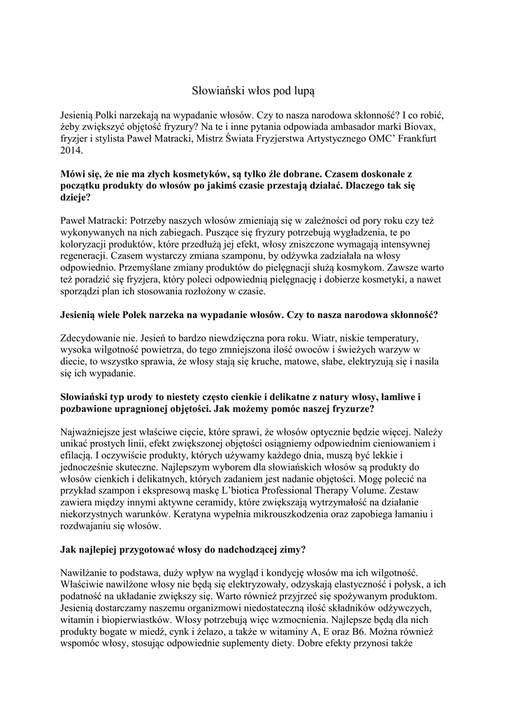 Słowiański włos pod lupą Jesienią Polki narzekają na wypadanie włosów. Czy to nasza narodowa skłonność? I co robić, żeby zwiększyć objętość fryzury? Na te i inne pytania odpowiada ambasador marki Biovax, fryzjer i stylista Paweł Matracki, Mistrz Świata Fryzjerstwa Artystycznego OMC’ Frankfurt 2014. Mówi się, że nie ma złych kosmetyków, są tylko źle dobrane. Czasem doskonałe z początku produkty do włosów po jakimś czasie przestają działać. Dlaczego tak się dzieje? Paweł Matracki: Potrzeby naszych włosów zmieniają się w zależności od pory roku czy też wykonywanych na nich zabiegach. Puszące się fryzury potrzebują wygładzenia, te po koloryzacji produktów, które przedłużą jej efekt, włosy zniszczone wymagają intensywnej regeneracji. Czasem wystarczy zmiana szamponu, by odżywka zadziałała na włosy odpowiednio. Przemyślane zmiany produktów do pielęgnacji służą kosmykom. Zawsze warto też poradzić się fryzjera, który poleci odpowiednią pielęgnację i dobierze kosmetyki, a nawet sporządzi plan ich stosowania rozłożony w czasie. Jesienią wiele Polek narzeka na wypadanie włosów. Czy to nasza narodowa skłonność? Zdecydowanie nie. Jesień to bardzo niewdzięczna pora roku. Wiatr, niskie temperatury, wysoka wilgotność powietrza, do tego zmniejszona ilość owoców i świeżych warzyw w diecie, to wszystko sprawia, że włosy stają się kruche, matowe, słabe, elektryzują się i nasila się ich wypadanie. Słowiański typ urody to niestety często cienkie i delikatne z natury włosy, łamliwe i pozbawione upragnionej objętości. Jak możemy pomóc naszej fryzurze? Najważniejsze jest właściwe cięcie, które sprawi, że włosów optycznie będzie więcej. Należy unikać prostych linii, efekt zwiększonej objętości osiągniemy odpowiednim cieniowaniem i efilacją. I oczywiście produkty, których używamy każdego dnia, muszą być lekkie i jednocześnie skuteczne. Najlepszym wyborem dla słowiańskich włosów są produkty do włosów cienkich i delikatnych, których zadaniem jest nadanie objętości. Mogę polecić na przykład szampon i ekspresową maskę L’biotica Professional Therapy Volume. Zestaw zawiera między innymi aktywne ceramidy, które zwiększają wytrzymałość na działanie niekorzystnych warunków. Keratyna wypełnia mikrouszkodzenia oraz zapobiega łamaniu i rozdwajaniu się włosów. Jak najlepiej przygotować włosy do nadchodzącej zimy? Nawilżanie to podstawa, duży wpływ na wygląd i kondycję włosów ma ich wilgotność. Właściwie nawilżone włosy nie będą się elektryzowały, odzyskają elastyczność i połysk, a ich podatność na układanie zwiększy się. Warto również przyjrzeć się spożywanym produktom. Jesienią dostarczamy naszemu organizmowi niedostateczną ilość składników odżywczych, witamin i biopierwiastków. Włosy potrzebują więc wzmocnienia. Najlepsze będą dla nich produkty bogate w miedź, cynk i żelazo, a także w witaminy A, E oraz B6. Można również wspomóc włosy, stosując odpowiednie suplementy diety. Dobre efekty przynosi także „nawilżenie poprzez natłuszczenie”, czyli olejowanie włosów. Na jesienno-zimowy czas najodpowiedniejszy będzie olej kokosowy.