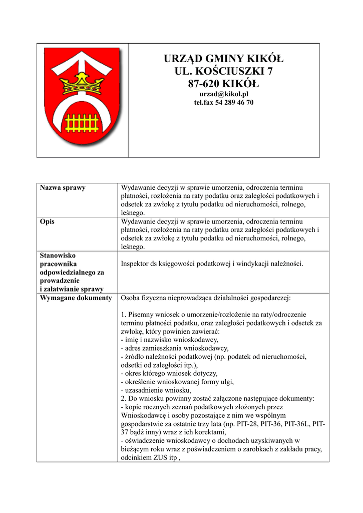 URZĄD GMINY KIKÓŁ UL. KOŚCIUSZKI 7 87-620 KIKÓŁ [email protected] tel.fax 54 289 46 70 Nazwa sprawy Opis Stanowisko pracownika odpowiedzialnego za prowadzenie i załatwianie sprawy Wymagane dokumenty Wydawanie decyzji w sprawie umorzenia, odroczenia terminu płatności, rozłożenia na raty podatku oraz zaległości podatkowych i odsetek za zwłokę z tytułu podatku od nieruchomości, rolnego, leśnego. Wydawanie decyzji w sprawie umorzenia, odroczenia terminu płatności, rozłożenia na raty podatku oraz zaległości podatkowych i odsetek za zwłokę z tytułu podatku od nieruchomości, rolnego, leśnego. Inspektor ds księgowości podatkowej i windykacji należności. Osoba fizyczna nieprowadząca działalności gospodarczej: 1. Pisemny wniosek o umorzenie/rozłożenie na raty/odroczenie terminu płatności podatku, oraz zaległości podatkowych i odsetek za zwłokę, który powinien zawierać: - imię i nazwisko wnioskodawcy, - adres zamieszkania wnioskodawcy, - źródło należności podatkowej (np. podatek od nieruchomości, odsetki od zaległości itp.), - okres którego wniosek dotyczy, - określenie wnioskowanej formy ulgi, - uzasadnienie wniosku, 2. Do wniosku powinny zostać załączone następujące dokumenty: - kopie rocznych zeznań podatkowych złożonych przez Wnioskodawcę i osoby pozostające z nim we wspólnym gospodarstwie za ostatnie trzy lata (np. PIT-28, PIT-36, PIT-36L, PIT37 bądź inny) wraz z ich korektami, - oświadczenie wnioskodawcy o dochodach uzyskiwanych w bieżącym roku wraz z poświadczeniem o zarobkach z zakładu pracy, odcinkiem ZUS itp , - oświadczenie wnioskodawcy o posiadanych nieruchomościach wraz z ich wykazem zawierającym adres nieruchomości, powierzchnię, - oświadczenie wnioskodawcy o środkach pieniężnych posiadanych na rachunkach w bankach oraz lokatach inwestycyjnych, tzn. wartość posiadanych papierów wartościowych, jednostek funduszy inwestycyjnych, polis ubezpieczeniowych (itp.) oraz kopia deklaracji podatkowej (PIT-38 bądź inny) za ubiegły rok, - oświadczenie o posiadanych środkach transportowych, których właścicielem lub leasingobiorcą jest wnioskodawca lub członkowie rodziny pozostający we wspólnym gospodarstwie domowym, - oświadczenie wnioskodawcy o ilości osób pozostających z nim we wspólnym gospodarstwie domowym, - oświadczenie wnioskodawcy o dochodach osób pozostających z nim we wspólnym gospodarstwie domowym, - oświadczenie o chorobie lub wypadku losowym powodującym utratę zdolności do zarobkowania lub znaczące straty materialne oraz dokumenty potwierdzające w/w okoliczności. Osoba fizyczna prowadząca działalność gospodarczą: 1. Pisemny wniosek o umorzenie/rozłożenie na raty/odroczenie terminu płatności podatku, oraz zaległości podatkowych i odsetek za zwłokę, który powinien zawierać: - imię i nazwisko wnioskodawcy, - adres zamieszkania wnioskodawcy, - określenie przedmiotu działalności gospodarczej, - źródło należności podatkowej (np. podatek od nieruchomości, odsetki od zaległości itp.), - okres którego wniosek dotyczy, - określenie wnioskowanej formy ulgi. 2. Do wniosku powinny zostać załączone następujące dokumenty: - kopie rocznych zeznań podatkowych złożonych przez wnioskodawcę i osoby pozostające z nim we wspólnym gospodarstwie za ostatnie trzy lata (np. PIT-28, PIT-36, PIT-36L, PIT-37 bądź inny) wraz z ich korektami, - oświadczenie o wysokości przychodu uzyskanego w bieżącym roku, - oświadczenie o wysokości opłacanej składki ZUS, - oświadczenie wnioskodawcy o posiadanych nieruchomościach wraz z ich wykazem zawierającym adres nieruchomości, powierzchnię, - oświadczenie wnioskodawcy o posiadanych środkach trwałych zawierające określenie rodzaju środka trwałego, jego wartości wynikającej z ewidencji (ewentualnie wnioskodawca może dostarczyć kopię posiadanej ewidencji środków trwałych lub jej wydruk), - oświadczenie wnioskodawcy o środkach pieniężnych posiadanych na rachunkach w bankach oraz lokatach inwestycyjnych, tzn. wartość posiadanych papierów wartościowych, jednostek funduszy inwestycyjnych, polis ubezpieczeniowych (itp.) oraz kopia deklaracji podatkowej (PIT-38 bądź innej) za ubiegły rok, - aktualny wyciąg z bieżącego rachunku bankowego i z rachunków terminowych, Miejsce składania dokumentów Termin załatwienia sprawy Odwołanie Opłaty Podstawa prawna Załączniki - oświadczenie o posiadanych środkach transportowych, których właścicielem lub leasingobiorcą jest wnioskodawca lub członkowie rodziny pozostający we wspólnym gospodarstwie domowym, - oświadczenie wnioskodawcy o ilości osób pozostających z nim we wspólnym gospodarstwie domowym, - oświadczenie wnioskodawcy o dochodach osób pozostających z nim we wspólnym gospodarstwie domowym, - oświadczenie o chorobie lub wypadku losowym powodującym utratę zdolności do zarobkowania lub znaczące straty materialne oraz dokumenty potwierdzające w/w okoliczności. URZĄD GMINY KIKÓŁ PLAC KOŚCIUSZKI 7 87-620 KIKÓŁ Sekretariat pok. nr 10 w godzinach od 7:15 do 15:15 [email protected] tel.fax 54 289 46 70 Bez zbędnej zwłoki - do 1 miesiąca, do 2 miesięcy sprawy szczególnie skomplikowane. Do Samorządowego Kolegium Odwoławczego, w terminie 14 dni od dnia doręczenia decyzji, za pośrednictwem organu, który wydał decyzję. Brak 1. Ustawa z dnia 12 stycznia 1991 r. o podatkach i opłatach lokalnych (tekst jednolity: Dz.U. z 2010 r. Nr 95, poz. 613 z późn. zm.). 2. Ustawa z dnia 29 sierpnia 1997 r. Ordynacja podatkowa (tekst jednolity: Dz.U. z 2012 r., poz. 749). 3. Ustawa z dnia 15 listopada 1984 r. o podatku rolnym (tekst jednolity: Dz.U. z 2006 r. Nr 136, poz. 969 z późn. zm.). 4. Ustawa z dnia 30 października 2002 r. o podatku leśnym (Dz. U. z 2002 r. Nr 200, poz. 1682 z późn. zm.). Protokół w sprawie opisu warunków gospodarczych gospodarstwa rolnego.