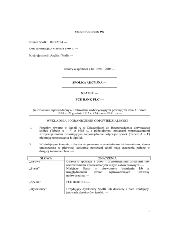 Statut FCE Bank Plc Numer Spółki: 00772784 --Data rejestracji: 3 września 1963 r. --Kraj rejestracji: Anglia i Walia --- Ustawy o spółkach z lat 1985 – 2006 --__________________________________ SPÓŁKA AKCYJNA --__________________________________ STATUT --FCE BANK PLC --(ze zmianami wprowadzonymi Uchwałami nadzwyczajnymi powziętymi dnia 31 marca 1993 r., 20 grudnia 1995 r. i 24 marca 2011 r.) --WYKŁADNIA I OGRANICZENIE ODPOWIEDZIALNOŚCI --1. Przepisy zawarte w Tabeli A w Załącznikach do Rozporządzenia dotyczącego spółek (Tabele A – F) z 1985 r., z późniejszymi zmianami wprowadzonymi Rozporządzeniem zmieniającym rozporządzenie dotyczące spółek (Tabele A – F) nie mają zastosowania do Spółki. --- 2. W niniejszym Statucie, o ile nie są sprzeczne z przedmiotem lub kontekstem, słowa umieszczone w pierwszej kolumnie poniższej tabeli mają znaczenia podane w drugiej kolumnie obok. --- SŁOWA „Ustawa” „Statut” ZNACZENIA Ustawa o spółkach z 2006 r. z późniejszymi zmianami lub rozszerzeniami wprowadzonymi innym aktem prawnym. --Niniejszy Statut w pierwotnym brzmieniu lub z uwzględnieniem zmian wprowadzonych Uchwałą nadzwyczajną. --- „Spółka” FCE Bank PLC --- „Dyrektorzy” Urzędujący dyrektorzy Spółki lub dowolny z nich działający jako rada dyrektorów Spółki. --- 1 „Dywidenda” Dywidenda i/lub premia. --- „Dokument elektroniczny” i „Forma elektroniczna” „Dokument papierowy” i „Forma papierowa” „Akcjonariusz” mają znaczenie nadane w art. 1168 Ustawy. --- „Uchwała zwyczajna” ma znaczenie nadane w art. 282 Ustawy. --- „opłacony” opłacony i/lub zaliczony jako opłacony. --- „Siedziba” siedziba Spółki. --- „Sekretarz” (z zastrzeżeniem przepisów Ustawy) obejmuje asystenta lub zastępcę Sekretarza oraz każdą osobę wyznaczoną przez Dyrektorów do wykonywania obowiązków Sekretarza, w tym współsekretarza, asystenta lub zastępcę Sekretarza. --- mają znaczenie nadane w art. 1168 Ustawy. --ma znaczenie nadane w art. 112 Ustawy. --- „Pieczęć do papierów Oficjalna Pieczęć, którą Spółka posiada zgodnie z art. 50 wartościowych” Ustawy. --„Pieczęć” Pieczęć firmowa Spółki. --- „Akcja” Akcja w Spółce. --- „Uchwała nadzwyczajna” ma znaczenie nadane w art. 282 Ustawy. --- „Zbiór ustaw” Ustawy o spółkach z lat 1985 – 2006 oraz każda inna Ustawa obowiązująca w danym czasie. --- „Zjednoczone Królestwo” na piśmie Wielka Brytania i Irlandia Północna. --Forma papierowa (lub – w zakresie ustalonym przepisem Zbioru ustaw – Forma elektroniczna lub komunikat na stronie internetowej. --- Z zastrzeżeniem powyższego słowa i wyrażenia zdefiniowane w Ustawie mają takie samo znaczenie w niniejszym Statucie, o ile nie jest to sprzeczne z tematem lub kontekstem. --3. Odpowiedzialność Akcjonariuszy jest ograniczona do ewentualnej kwoty wpłaconej za posiadane Akcje. --POŁOŻENIE SIEDZIBY --- 4. Siedziba znajduje się w miejscu położonym w Anglii i Walii, stosownie do decyzji Dyrektorów. --- 2 KAPITAŁ --5. Z zastrzeżeniem przepisów Ustawy oraz bez wpływu na specjalne prawa przysługujące obecnie właścicielom Akcji lub Akcji określonego rodzaju, Akcja w Spółce (wchodząca w skład pierwotnego kapitału zakładowego albo nie) może być wyemitowana z prawami uprzywilejowany, odroczonymi lub innymi, specjalnymi prawami bądź ograniczeniami co do Dywidendy, zwrotu kapitału, głosu lub innymi, ustalonymi przez Spółkę Uchwałą zwyczajną. --- 6. Z zastrzeżeniem przepisów Ustawy Akcje mogą być wyemitowane w celu ich umorzenia lub możliwości umorzenia stosownie do decyzji Spółki lub właściciela, przy czym Dyrektorzy mogą określić warunki i sposób umorzenia takich Akcji. ---- 7. Specjalne prawa przyznane właścicielom Akcji lub Akcji określonego rodzaju, które zostały wyemitowane z prawami uprzywilejowanymi lub innymi, specjalnymi prawami (o ile warunki emisji takich Akcji nie stanowią wyraźnie inaczej) nie zostaną uznane za zmienione wskutek utworzenia lub emisji dodatkowych Akcji o równoprawnej(pari passu) lub podległej pozycji prawnej. --PRZYDZIAŁ AKCJI --- 8. 9. Spółka może w dowolnym czasie powziąć Uchwałę zwyczajną upoważniającą Dyrektorów do przydziału Akcji w Spółce lub udzielenia praw subskrypcji lub zamiany papieru wartościowego na takie Akcje; po powzięciu Uchwały zwyczajnej Dyrektorzy będą ogólnie i bezwarunkowo upoważnieni do wykonywania wszystkich kompetencji Spółki w zakresie przydziału Akcji lub udzielenia praw subskrypcji lub zamiany papieru wartościowego na takie Akcje, pod warunkiem że: --a) maksymalna wartość papierów wartościowych, jakie mogą być przydzielone na mocy takiego upoważnienia, będzie w wysokości określonej w Uchwale zwyczajnej, --- b) o ile nie zostanie (przed wygaśnięciem) odwołane, zmienione lub przedłużone, upoważnienie takie wygaśnie w przeddzień piątej rocznicy daty powzięcia Uchwały zwyczajnej lub we wcześniejszej dacie określonej w Uchwale zwyczajnej. Spółka jest upoważniona, przed wygaśnięciem upoważnienia, do złożenia oferty lub zawarcia umowy zobowiązującej do przydziału Akcji lub przyznania praw po jego wygaśnięciu. --- a) Z zastrzeżeniem postanowień par. 9 i kiedy Dyrektorzy są generalnie uprawnieni stosownie do par. 10, Spółka może powziąć Uchwałę nadzwyczajną upoważniającą Dyrektorów do przydziału papierów wartościowych z prawem do kapitału (zgodnie z definicją w art. 560 Ustawy) w zamian za gotówkę. Po powzięciu takiej Uchwały nadzwyczajnej Dyrektorzy będą upoważnieni do przydziału takich papierów wartościowych z prawem do kapitału za gotówkę, tak jakby art. 560 ust. 1 Ustawy nie miał zastosowania do takiego przydziału, przy czym to uprawnienie jest ograniczone do: --- 3 (i) przydziałów dokonywanych w celu albo w związku z ofertą (dowolnej osoby) papierów wartościow