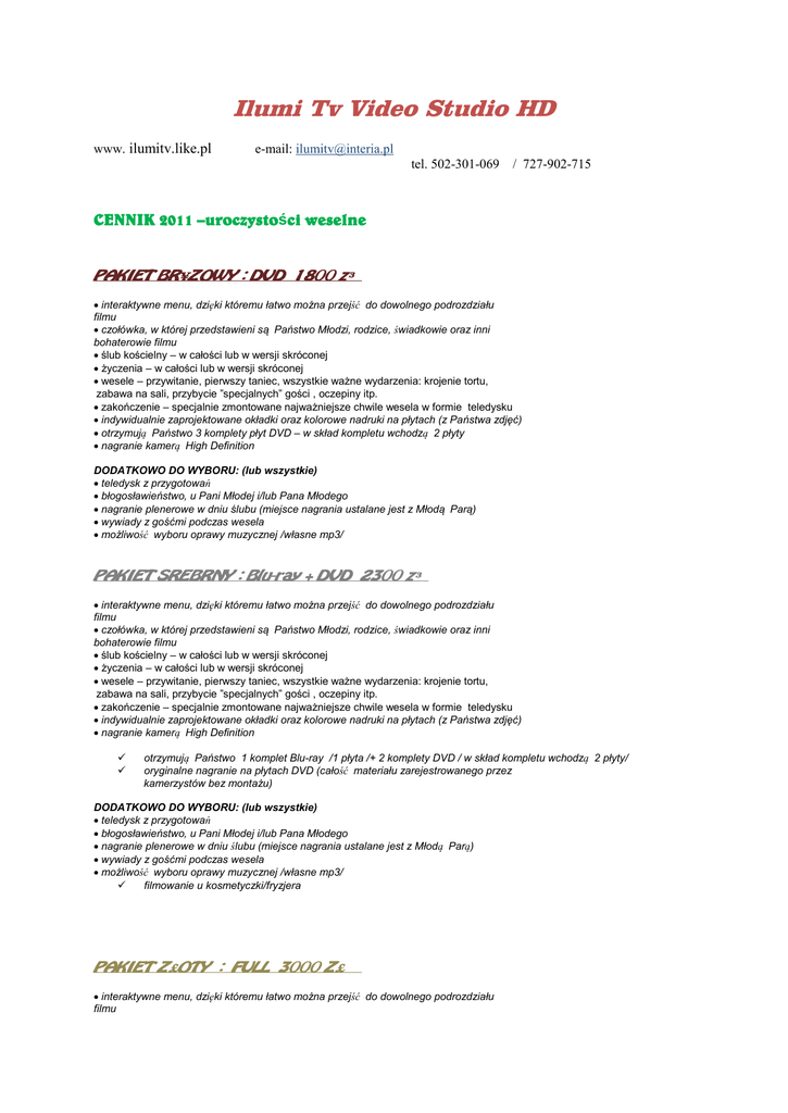 Ilumi Tv Video Studio HD www. ilumitv.like.pl e-mail: [email protected] tel. 502-301-069 / 727-902-715 CENNIK 2011 –uroczystości weselne interaktywne menu, dzięki któremu łatwo można przejść do dowolnego podrozdziału filmu czołówka, w której przedstawieni są Państwo Młodzi, rodzice, świadkowie oraz inni bohaterowie filmu ślub kościelny – w całości lub w wersji skróconej życzenia – w całości lub w wersji skróconej wesele – przywitanie, pierwszy taniec, wszystkie ważne wydarzenia: krojenie tortu, zabawa na sali, przybycie ”specjalnych” gości , oczepiny itp. zakończenie – specjalnie zmontowane najważniejsze chwile wesela w formie teledysku indywidualnie zaprojektowane okładki oraz kolorowe nadruki na płytach (z Państwa zdjęć) otrzymują Państwo 3 komplety płyt DVD – w skład kompletu wchodzą 2 płyty nagranie kamerą High Definition DODATKOWO DO WYBORU: (lub wszystkie) teledysk z przygotowań błogosławieństwo, u Pani Młodej i/lub Pana Młodego nagranie plenerowe w dniu ślubu (miejsce nagrania ustalane jest z Młodą Parą) wywiady z gośćmi podczas wesela możliwość wyboru oprawy muzycznej /własne mp3/ interaktywne menu, dzięki któremu łatwo można przejść do dowolnego podrozdziału filmu czołówka, w której przedstawieni są Państwo Młodzi, rodzice, świadkowie oraz inni bohaterowie filmu ślub kościelny – w całości lub w wersji skróconej życzenia – w całości lub w wersji skróconej wesele – przywitanie, pierwszy taniec, wszystkie ważne wydarzenia: krojenie tortu, zabawa na sali, przybycie ”specjalnych” gości , oczepiny itp. zakończenie – specjalnie zmontowane najważniejsze chwile wesela w formie teledysku indywidualnie zaprojektowane okładki oraz kolorowe nadruki na płytach (z Państwa zdjęć) nagranie kamerą High Definition otrzymują Państwo 1 komplet Blu-ray /1 płyta /+ 2 komplety DVD / w skład kompletu wchodzą 2 płyty/ oryginalne nagranie na płytach DVD (całość materiału zarejestrowanego przez kamerzystów bez montażu) DODATKOWO DO WYBORU: (lub wszystkie) teledysk z przygotowań błogosławieństwo, u Pani Młodej i/lub Pana Młodego nagranie plenerowe w dniu ślubu (miejsce nagrania ustalane jest z Młodą Parą) wywiady z gośćmi podczas wesela możliwość wyboru oprawy muzycznej /własne mp3/ filmowanie u kosmetyczki/fryzjera interaktywne menu, dzięki któremu łatwo można przejść do dowolnego podrozdziału filmu czołówka, w której przedstawieni są Państwo Młodzi, rodzice, świadkowie oraz inni bohaterowie filmu ślub kościelny – w całości lub w wersji skróconej życzenia – w całości lub w wersji skróconej wesele – przywitanie, pierwszy taniec, wszystkie ważne wydarzenia: krojenie tortu, zabawa na sali, przybycie ”specjalnych” gości , oczepiny itp. zakończenie – specjalnie zmontowane najważniejsze chwile wesela w formie teledysku indywidualnie zaprojektowane okładki oraz kolorowe nadruki na płytach (z Państwa zdjęć) oryginalne nagranie na płytach DVD (całość materiału zarejestrowanego przez kamerzystów bez montażu) nagranie kamerą High Definition otrzymują Państwo 2 komplety Blu-ray / w skład kompletu wchodzi 1 płyta / + 2 komplety DVD / w skład kompletu wchodzą 2 płyty/ dwóch operatorów kamer DODATKOWO DO WYBORU: (lub wszystkie) teledysk z przygotowań błogosławieństwo, u Pani Młodej i/lub Pana Młodego nagranie plenerowe w dniu ślubu (miejsce nagrania ustalane jest z Młodą Parą) wywiady z gośćmi podczas wesela możliwość wyboru oprawy muzycznej /własne mp3/ filmowanie u kosmetyczki/fryzjera nagranie plenerowe w innym dniu niż dzień ślubu (miejsce nagrania ustalane jest z Młodą Parą) po zakończeniu – lista gości wraz z fragmentami „niewykorzystanych ujęć oraz ewentualnych „potknięć” zabawny teledysk” – naśśmieszniejsze momenty odpowiednio dobrane i zmontowane w rytm muzyki Operator jest dyspozycyjny w dniu ślubu do godz. 01:00 dnia następnego/końca oczepin. Czas trwania zmontowanego materiału to ok. 60-150 min. Wszystkie filmy są montowane w formacie panoramicznym 16:9. Płyty nie są zabezpieczane przed kopiowaniem. Rezerwacja terminu następuje po podpisaniu umowy i uiszczeniu zadatku w kwocie 300-500 zł /w zależności od usługi lub pakietu / FILMY SĄ REALIZOWANE W WYSOKIEJ ROZDZIELCZOŚCI FULL HD ! POPRAWINY : dopłata 700 zł, ok. 60 min zmontowanego materiału w oddzielnym opakowaniu z indywidualnymi nadrukami. Operator kamery dostępny od ok. godz. 16:00 do 00:00 DODATKOWO: (nie dotyczy pakietu „ FULL”) - nagranie plenerowe w innym dniu niż dzień ślubu – 300 zł, po wcześniejszym ustaleniu terminu dogodnego dla obu stron - lista gości wraz z fragmentami „niewykorzystanych ujęć + potknięć” – 100 zł - „ zabawny teledysk” – najśmieszniejsze momenty odpowiednio dobrane i zmontowane w rytm muzyki – 200 zł - drugi i kolejny operator kamery w dniu ślubu, cena do uzgodnienia W przypadku wszystkich pakietów: - dodatkowy teledysk/animacja wg. wskazań klienta – od 100 zł - dodatkowa kopia DVD – 15 zł/płyta, Blu-ray – 70 zł/płyta - dojazd powyżej 50 km – 1 zł/km (w przypadku bardzo dużej odległości – cena do ustalenia indywidualnie) DODATKOWO: - usługa „ reportaż ze ślubu cywilnego” – bez uroczystości weselnych -1000 zł - usługa „ reportaż z podróży poślubnej „ – cena do uzgodnienia - możliwość nagrania uroczystości na kasety VHS - cena do uzgodnienia Do Państwa dyspozycji posiadamy profesjonalny sprzęt: - kamery High Definition Panasonic 151 E + osprzęt - profesjonalne oświetlenie z możliwością doboru temperatury barwowej światła w zależności od warunków otoczenia - statywy z głowicami olejowymi Manfrotto - mikrofony kierunkowe Rode, Audio-Technica oraz Sennheiser - zewnętrzne rekordery dźwięku Zoom H1-2 - stacje robocze do nieliniowego montażu wraz z najnowszym i najwyższym paki