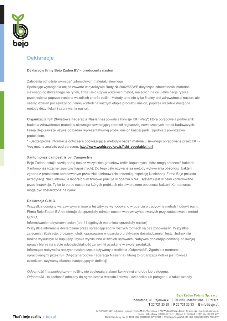 Deklaracje Deklaracje firmy Bejo Zaden BV – producenta nasion Zalecenia odnośnie wymagań zdrowotnych materiału siewnego Spełniając wymagania unijne zawarte w dyrektywie Rady Nr 2002/55/WE dotyczące zdrowotności materiału siewnego dostarczanego na rynek, firma Bejo używa wszelkich metod, mających na celu eliminację ryzyka przeniesienia poprzez nasiona wszelkich chorób roślin. Metody te to nie tylko finalny test zdrowotności nasion, ale szereg działań począwszy od pełnej kontroli na każdym etapie produkcji nasion, poprzez wszelkie dostępne metody dezynfekcji i zaprawiania nasion. Organizacja ISF (Światowa Federacja Nasienna) powołała komisję ISHI-Veg*) która opracowała podręcznik badania zdrowotności materiału siewnego zawierającą protokół najbardziej nowoczesnych metod badawczych. Firma Bejo zawsze używa do badań reprezentatywnej próbki nasion każdej partii, zgodnie z powyższym protokołem. *) Szczegółowe informacje dotyczące obowiązującej metodyki badań materiału siewnego opracowane przez ISHIVeg można znaleźć pod adresem: http://www.worldseed.org/isf/ishi_vegetable.html Xantomonas campestris pv. Campestris Bejo Zaden testuje każdą partię nasion wszystkich gatunków roślin kapustnych, które mogą przenosić bakterie Xantomonas (czarnej zgnilizny kapustnych). Do tego celu używane są metody wykrywania obecności bakterii zgodne z protokołem opracowanym przez Naktuinbouw (Holenderską Inspekcję Nasienną). Firma Bejo posiada akredytację Naktuinbouw, a laboratorium firmowe pracuje w oparciu o NAL system i jest w pełni kontrolowane przez Inspekcję. Tylko te partie nasion na których próbkach nie stwierdzono obecności bakterii Xantomonas, mogą być dostarczone na rynek. Deklaracja G.M.O. Wszystkie odmiany warzyw wymienione w tej witrynie wyhodowano w oparciu o tradycyjne metody hodowli roślin. Firma Bejo Zaden BV nie oferuje do sprzedaży odmian nasion warzyw wyhodowanych przy zastosowaniu metod G.M.O. Informowanie nabywców nasion (art. 14 ogólnych warunków sprzedaży nasion) Wszystkie informacje dostarczane przez sprzedającego w różnych formach są bez zobowiązań. Wszystkie zalecenia i ilustracje, broszury i ulotki opracowano w oparciu o praktyczne doświadczenia i testy. Jednak nie można wykluczyć że kupujący uzyska wyniki inne w swoich uprawach. Nabywca dobierając odmianę do swojej uprawy bierze na siebie odpowiedzialność za wyniki uzyskane w swojej produkcji. Informując nabywców naszych nasion często używamy określenia „Odporność”. Zgodnie z normami opracowanymi przez ISF (Międzynarodowa Federacja Nasienna), której to organizacji Polska jest również członkiem, używamy obecnie następujących definicji: Odporność immunologiczna – rośliny nie podlegają atakowi konkretnej choroby lub patogenu. Odporność - to zdolność odmiany do ograniczenia wzrostu i rozwoju szkodnika lub patogenu, a także szkody powstałej w wyniku ich ataku, lub infekcji, w porównaniu do odmian wrażliwych będących w podobnych warunkach środowiska i presji szkodnika lub patogenu. Rośliny odmiany odpornej w warunkach silnej presji patogenu lub szkodnika mogą wykazywać częściowe objawy infekcji lub uszkodzenia. Określa się dwa poziomy odporności: - Wysoka / standardowa odporność (HR) - Umiarkowana / średnia odporność (IR) Wrażliwość – to niezdolność odmiany do ograniczenia wzrostu i rozwoju określonego szkodnika lub patogenu. Porady bezpiecznego stosowania zaprawionego materiału siewnego i wysadkowego Używając do siewu zaprawionych nasion lub wysadzając zaprawiony materiał należy przestrzegać dodatkowo warunków bezpieczeństwa obowiązujących dla substancji chemicznych użytych do zaprawiania. Więcej informacji na stronie: „postępowanie z nasionami zaprawionymi”. Bezpieczne użytkowanie zaprawionych nasion Podczas użycia zaprawionych nasion muszą Państwo przestrzegać zasad bezpieczeństwa swojego jak i ochrony środowiska. Zobacz użytkowanie nasion zaprawionych’.