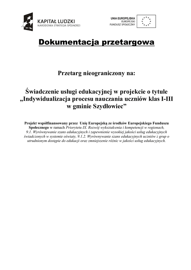 Dokumentacja przetargowa Przetarg nieograniczony na: Świadczenie usługi edukacyjnej w projekcie o tytule „Indywidualizacja procesu nauczania uczniów klas I-III w gminie Szydłowiec” Projekt współfinansowany przez Unię Europejską ze środków Europejskiego Funduszu Społecznego w ramach Priorytetu IX. Rozwój wykształcenia i kompetencji w regionach, 9.1. Wyrównywanie szans edukacyjnych i zapewnienie wysokiej jakości usług edukacyjnych świadczonych w systemie oświaty, 9.1.2. Wyrównywanie szans edukacyjnych uczniów z grup o utrudnionym dostępie do edukacji oraz zmniejszenie różnic w jakości usług edukacyjnych. Termin składania ofert 19.09.2012 rok godz. 10:00 Termin otwarcia ofert 19.09.2012 roku godz. 10:15 Numer sprawy : Ed-II.271.1.2012 Specyfikacja istotnych warunków zamówienia dotyczy postępowania pn: Świadczenie usługi edukacyjnej w projekcie o tytule „Indywidualizacja procesu nauczania uczniów klas I-III w gminie Szydłowiec” Ogłoszenie o przetargu ukazało się w Biuletynie Urzędu Zamówień Publicznych, na stronie internetowej Zamawiającego www.bip.szydlowiec oraz na tablicy ogłoszeń Zamawiającego w dniu: 07.09.2012r. I. ZAMAWIAJĄCY Gmina Szydłowiec ul. Rynek Wielki 1 26-500 Szydłowiec tel. 48 617 86 30, fax. 48 617 05 10 , e-mail: [email protected] II. TRYB UDZIELANIA ZAMÓWIENIA 1. Niniejsze postępowanie o udzielenie zamówienia publicznego prowadzone jest w trybie przetargu nieograniczonego zgodnie z art. 39 ustawy z dnia 29 stycznia 2004 r. Prawo zamówień publicznych (t. j. Dz. U. z 2010 r. Nr 113, poz. 759), zwanej dalej ustawą. Postępowanie prowadzone jest w procedurze właściwej dla zamówienia o szacunkowej wartości poniżej kwot określonych w przepisach wydanych na podstawie art. 11 ust. 8 Prawa zamówień publicznych. Usługa stanowiąca przedmiot zamówienia jest usługą niepriorytetową wg. Rozporządzenia Prezesa Rady Ministrów z dnia 28 stycznia 2010r. ws. wykazu usług o charakterze priorytetowym i niepriorytetowym (załącznik nr 2 Rozporządzenia, nr kategorii 24 – usługi edukacyjne i szkoleniowe), ustawa wyłącza stosowanie w postępowaniach o udzielenie zamówienia, gdzie przedmiotem zamówienia są usługi tego typu, przepisów ustawy dotyczących m. in. terminów składania ofert, obowiązku żądania dokumentów potwierdzających spełnianie warunków udziału w postępowaniu oraz zakazu ustalania kryteriów oceny ofert na podstawie właściwości Wykonawcy. Ponadto Zamawiający w jednym zamówieniu ujął podobne rodzajowo usługi nie chcąc dzielić zamówienia w sposób który mógłby godzić w literę ustawy z art. 32 ust 2. Zamawiający, stosuje dla postępowania przetargowego przepisy właściwe dla usług niepriorytetowych, a mogące się pojawić w przedmiocie zamówienia dostawy służą wykonaniu usługi, a ich udział wartościowy w zamówieniu będzie nieporównywalnie mniejszy od usług 2. 3. 4. 5. a. b. c. d. III. edukacyjnych; stąd powołując się na art. 5 ust. 2 ustawy Pzp, mając na względzie ust. 3 tegoż art., Zamawiający stosuje przepisy właściwe dla usług edukacyjnych (niepriorytetowych). Podstawa prawna opracowania specyfikacji istotnych warunków zamówienia: Ustawa z dnia 29 stycznia 2004 r. Prawo zamówień publicznych (t. j. Dz. U. z 2010 r. Nr 113, poz. 759); Rozporządzenie Prezesa Rady Ministrów z dnia 30 grudnia 2009 r. w sprawie rodzajów dokumentów, jakich może żądać zamawiający od wykonawcy oraz form, w jakich te dokumenty mogą być składane (Dz. U. z 2009 r. Nr 226, poz. 1817.); Rozporządzenie Prezesa Rady Ministrów z 16 grudnia 2011 r. w sprawie średniego kursu złotego w stosunku do euro stanowiącego podstawę przeliczenia wartości zamówień publicznych (Dz. U. z 2011 r. Nr 282 poz. 1796); Rozporządzenie Prezesa Rady Ministrów z dnia 28 stycznia 2010r. ws. wykazu usług o charakterze priorytetowym i niepriorytetowym (załącznik nr 2 Rozporządzenia, nr kategorii 24 – usługi edukacyjne i szkoleniowe). OPIS PRZEDMIOTU ZAMÓWIENIA POZYCJA WE WSPÓLNYM SŁOWNIKU ZAMÓWIEŃ CPV: 80100000-5, 80310000-0, 80410000-1. 1. Realizacja zamówienia obejmuje świadczenie usług rozumianych jako przeprowadzanie specjalistycznych zajęć edukacyjnych wspierających indywidualizację procesu dydaktycznego, na poziomie właściwym dla nauczania w szkołach podstawowych w klasach I – III. Celem głównym projektu jest wyrównywanie szans edukacyjnych oraz rozwinięcie zainteresowań poprzez indywidualizację procesu kształcenia dzieci z klas I – III w 71% szkół podstawowych funkcjonujących na terenie gminy Szydłowiec, tj.: SP nr 1 z Oddziałami Integracyjnymi w Szydłowcu, SP w Majdowie, SP w Wysokiej, SP w Sadku, SP nr 2 w Zespole Szkół w Szydłowcu w terminie od 1 IX 2012 r. do 30 VI 2013 r. Cele szczegółowe projektu to: Zapewnienie dziecku realizującemu I etap Liczba uczniów i uczennic klas I-III, edukacyjny w szkołach podstawowych, którzy otrzymali wsparcie w zakresie funkcjonujących na terenie gminy indywidualizacji nauczania Szydłowiec oferty edukacyjno-wychowawczo-profilaktycznej zgodnej z jego indywidualnymi potrzebami możliwościami i edukacyjnymi i rozwojowymi w terminie od 01.09.2012 do 30.06.2013. Zmniejszenie dysproporcji edukacyjnych i rozwojowych uczniów i uczennic szkół z gminy Szydłowiec poprzez udział w zajęciach dodatkowych w terminie od 01.09.2012 do 30.06.2013. Stworzenie odpowiednich warunków indywidualnej pracy nauczyciela z uczniem w szkołach podstawowych objętych wsparciem poprzez doposażenie szkół w materiały dydaktyczne w roku szk. 2012/2013. W zajęciach z beneficjentami poruszona zostanie kwestia zasady równością szans kobiet i mężczyzn w życiu społecznym. Bezpośrednim realizatorem usługi (nauczycielem) z ramienia Wykonawcy (doświadczonej firmy szkoleniowej) będzie osoba, która posiada wykształcenie kierunkowe oraz praktykę. 2. Szczegółowy opis przedmiotu zamówienia – „zespó