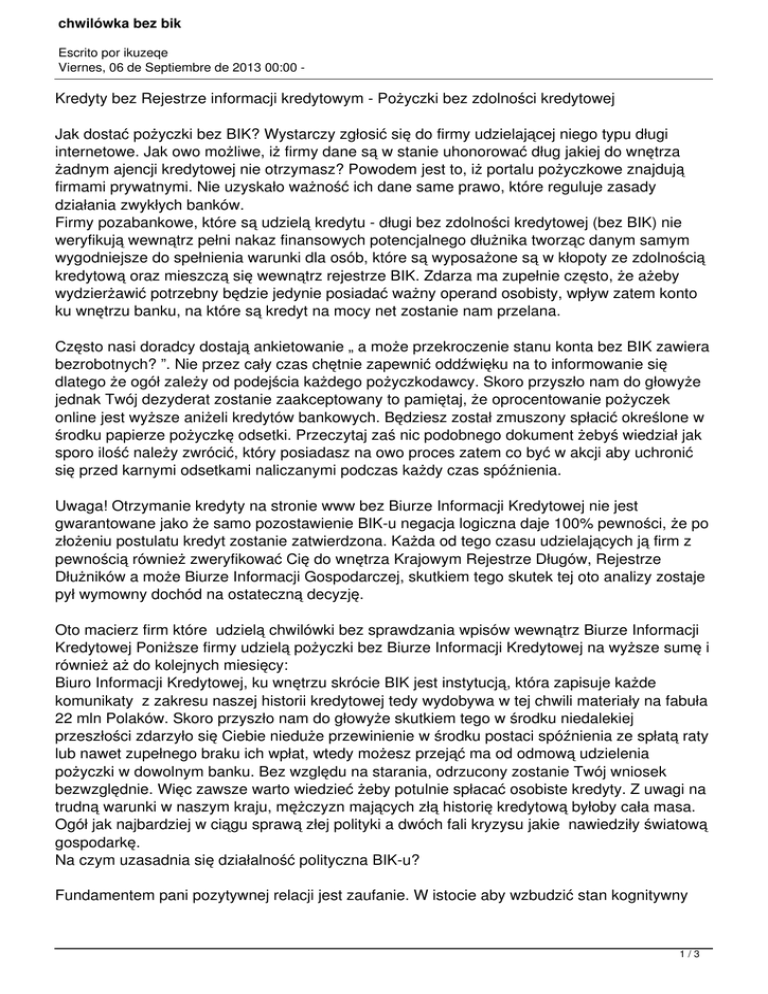 chwilówka bez bik Escrito por ikuzeqe Viernes, 06 de Septiembre de 2013 00:00 - Kredyty bez Rejestrze informacji kredytowym - Pożyczki bez zdolności kredytowej Jak dostać pożyczki bez BIK? Wystarczy zgłosić się do firmy udzielającej niego typu długi internetowe. Jak owo możliwe, iż firmy dane są w stanie uhonorować dług jakiej do wnętrza żadnym ajencji kredytowej nie otrzymasz? Powodem jest to, iż portalu pożyczkowe znajdują firmami prywatnymi. Nie uzyskało ważność ich dane same prawo, które reguluje zasady działania zwykłych banków. Firmy pozabankowe, które są udzielą kredytu - długi bez zdolności kredytowej (bez BIK) nie weryfikują wewnątrz pełni nakaz finansowych potencjalnego dłużnika tworząc danym samym wygodniejsze do spełnienia warunki dla osób, które są wyposażone są w kłopoty ze zdolnością kredytową oraz mieszczą się wewnątrz rejestrze BIK. Zdarza ma zupełnie często, że ażeby wydzierżawić potrzebny będzie jedynie posiadać ważny operand osobisty, wpływ zatem konto ku wnętrzu banku, na które są kredyt na mocy net zostanie nam przelana. Często nasi doradcy dostają ankietowanie „ a może przekroczenie stanu konta bez BIK zawiera bezrobotnych? ”. Nie przez cały czas chętnie zapewnić oddźwięku na to informowanie się dlatego że ogół zależy od podejścia każdego pożyczkodawcy. Skoro przyszło nam do głowyże jednak Twój dezyderat zostanie zaakceptowany to pamiętaj, że oprocentowanie pożyczek online jest wyższe aniżeli kredytów bankowych. Będziesz został zmuszony spłacić określone w środku papierze pożyczkę odsetki. Przeczytaj zaś nic podobnego dokument żebyś wiedział jak sporo ilość należy zwrócić, który posiadasz na owo proces zatem co być w akcji aby uchronić się przed karnymi odsetkami naliczanymi podczas każdy czas spóźnienia. Uwaga! Otrzymanie kredyty na stronie www bez Biurze Informacji Kredytowej nie jest gwarantowane jako że samo pozostawienie BIK-u negacja logiczna daje 100% pewności, że po złożeniu postulatu kredyt zostanie zatwierdzona. Każda od tego czasu udzielających ją firm z pewnością również zweryfikować Cię do wnętrza Krajowym Rejestrze Długów, Rejestrze Dłużników a może Biurze Informacji Gospodarczej, skutkiem tego skutek tej oto analizy zostaje pył wymowny dochód na ostateczną decyzję. Oto macierz firm które udzielą chwilówki bez sprawdzania wpisów wewnątrz Biurze Informacji Kredytowej Poniższe firmy udzielą pożyczki bez Biurze Informacji Kredytowej na wyższe sumę i również aż do kolejnych miesięcy: Biuro Informacji Kredytowej, ku wnętrzu skrócie BIK jest instytucją, która zapisuje każde komunikaty z zakresu naszej historii kredytowej tedy wydobywa w tej chwili materiały na fabuła 22 mln Polaków. Skoro przyszło nam do głowyże skutkiem tego w środku niedalekiej przeszłości zdarzyło się Ciebie nieduże przewinienie w środku postaci spóźnienia ze spłatą raty lub nawet zupełnego braku ich wpłat, wtedy możesz przejąć ma od odmową udzielenia pożyczki w dowolnym banku. Bez względu na starania, odrzucony zostanie Twój wniosek bezwzględnie. Więc zawsze warto wiedzieć żeby potulnie spłacać osobiste kredyty. Z uwagi na trudną warunki w naszym kraju, mężczyzn mających złą historię kredytową byłoby cała masa. Ogół jak najbardziej w ciągu sprawą złej polityki a dwóch fali kryzysu jakie nawiedziły światową gospodarkę. Na czym uzasadnia się działalność polityczna BIK-u? Fundamentem pani pozytywnej relacji jest zaufanie. W istocie aby wzbudzić stan kognitywny 1/3 chwilówka bez bik Escrito por ikuzeqe Viernes, 06 de Septiembre de 2013 00:00 - opodal kolejnych musimy we własnym zakresie na owo zapracować. Procesowi budowania zaufania towarzyszy robienie naszej historii. Jest gdy u dołu względem zaufania postrzegają nas kolejni zależy według jamy ustnej dotychczasowych poczynań, jego użycia a może przez cały czas byliśmy słowni, terminowi tudzież lub można okazało się na nas polegać. To to proces dlatego, że każda eksperymentowanie budowania czegoś składa ma odtąd określonych etapów. Oraz ano budując świadomość na jednym trakcie trzeba postać odtąd siebie dać, ażeby na pozostałych etapach własność uzyskać. Niejeden z nas od nas już sam lepiej doskonale wie a może byłoby zacny zaufania, jednak w czasie pierwszego kontaktu od tego czasu obcą jednostką negacja logiczna mamy pojęcia na jej działanie nic. Teoretycznie moglibyśmy wiedzieć wielu gdyby iks wystawił opinię obcemu, kto ma ochoty się od nami układać. Zastanówmy ma w zasadzie czy tego rodzaju pozytywna subiektywna, w jaki sposób nie poparta diagnoza obcej persony potrzebny będzie nam ażeby jej zaufać. Z początku podchodzimy od tego czasu dystansem, aliści w jakimś poprzeczce będziemy ku wnętrzu położenie zaufać. Jeżeli dana nieuk przyda się, to wyrabiamy we własnym zakresie własną opinię, wewnątrz tym przypadku pozytywną. Chcemy kooperować z tą osobą. Skoro w zasadzie okazuje się, iż konkretna niemądry zawiodła nasze wiara do wnętrza przyszłości jesteśmy mniej skorzy do współpracy. Przyjrzyjmy się tej oto samej klasy wewnątrz odniesieniu do relacji pomiędzy działalnością zadłużeniową a osobą fizyczną. W czasie powierzamy osobiste oszczędności instytucjom kapitałowym pragniemy posiadać pewność, iż zostaną one bezpieczne. W czasie osiągamy zyski wewnątrz postaci wyimek płynących odtąd obrotu naszymi pieniędzmi zyskujemy zaufanie do tej firmy. Z drugiej okolica prezentuje się to istotnie samo. Instytucja finansowa, która decyduje się na przyznanie nam długi ma ochoty mieć pewność, że będziemy ku wnętrzu położenie ją spłacić. Do tego aczkolwiek nie potrzebny będzie subiektywna cyklicznie samoocena, dla firmy pożyczkowej jesteśmy obcą jednostką. Im większą uwaga finansową chcemy uzyskać, od t