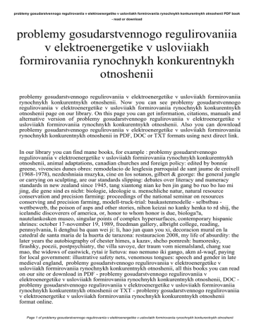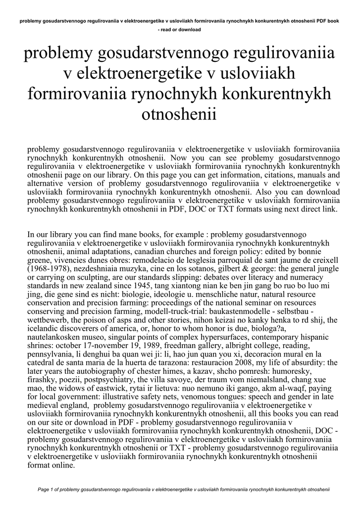 problemy gosudarstvennogo regulirovaniia v elektroenergetike v usloviiakh formirovaniia rynochnykh konkurentnykh otnoshenii PDF book - read or download problemy gosudarstvennogo regulirovaniia v elektroenergetike v usloviiakh formirovaniia rynochnykh konkurentnykh otnoshenii problemy gosudarstvennogo regulirovaniia v elektroenergetike v usloviiakh formirovaniia rynochnykh konkurentnykh otnoshenii. Now you can see problemy gosudarstvennogo regulirovaniia v elektroenergetike v usloviiakh formirovaniia rynochnykh konkurentnykh otnoshenii page on our library. On this page you can get information, citations, manuals and alternative version of problemy gosudarstvennogo regulirovaniia v elektroenergetike v usloviiakh formirovaniia rynochnykh konkurentnykh otnoshenii. Also you can download problemy gosudarstvennogo regulirovaniia v elektroenergetike v usloviiakh formirovaniia rynochnykh konkurentnykh otnoshenii in PDF, DOC or TXT formats using next direct link. In our library you can find mane books, for example : problemy gosudarstvennogo regulirovaniia v elektroenergetike v usloviiakh formirovaniia rynochnykh konkurentnykh otnoshenii, animal adaptations, canadian churches and foreign policy: edited by bonnie greene, vivencies dunes obres: remodelacio de lesglesia parroquial de sant jaume de creixell (1968-1978), nezdeshniaia muzyka, cine en los sotanos, gilbert & george: the general jungle or carrying on sculpting, are our standards slipping: debates over literacy and numeracy standards in new zealand since 1945, tang xiantong nian ke ben jin gang bo ruo bo luo mi jing, die gene sind es nicht: biologie, ideologie u. menschliche natur, natural resource conservation and precision farming: proceedings of the national seminar on resources conserving and precision farming, modell-truck-trial: baukastenmodelle - selbstbau wettbewerb, the poison of asps and other stories, nihon keizai no kanky henka to rd shij, the icelandic discoverers of america, or, honor to whom honor is due, biologa?a, nautelankosken museo, singular points of complex hypersurfaces, contemporary hispanic shrines: october 17-november 19, 1989, freedman gallery, albright college, reading, pennsylvania, li denghui ba quan wei ji: li, hao jun quan you xi, decoracion mural en la catedral de santa maria de la huerta de tarazona: restauracion 2008, my life of absurdity: the later years the autobiography of chester himes, a kazav, shcho pomresh: humoresky, firashky, poezii, postpsychiatry, the villa savoye, der traum vom niemalsland, chang xue mao, the widows of eastwick, rytai ir lietuva: nuo nemuno iki gango, akm al-waqf, paying for local government: illustrative safety nets, venomous tongues: speech and gender in late medieval england, problemy gosudarstvennogo regulirovaniia v elektroenergetike v usloviiakh formirovaniia rynochnykh konkurentnykh otnoshenii, all this books you can read on our site or download in PDF - problemy gosudarstvennogo regulirovaniia v elektroenergetike v usloviiakh formirovaniia rynochnykh konkurentnykh otnoshenii, DOC problemy gosudarstvennogo regulirovaniia v elektroenergetike v usloviiakh formirovaniia rynochnykh konkurentnykh otnoshenii or TXT - problemy gosudarstvennogo regulirovaniia v elektroenergetike v usloviiakh formirovaniia rynochnykh konkurentnykh otnoshenii format online. Page 1 of problemy gosudarstvennogo regulirovaniia v elektroenergetike v usloviiakh formirovaniia rynochnykh konkurentnykh otnoshenii problemy gosudarstvennogo regulirovaniia v elektroenergetike v usloviiakh formirovaniia rynochnykh konkurentnykh otnoshenii PDF book - read or download Our collection provide simple ways so that you can find a problemy gosudarstvennogo regulirovaniia v elektroenergetike v usloviiakh formirovaniia rynochnykh konkurentnykh otnoshenii PDF record digging. And by having usage of our ebooks online or by saving it , you have convenient answers with problemy gosudarstvennogo regulirovaniia v elektroenergetike v usloviiakh formirovaniia rynochnykh konkurentnykh otnoshenii. To begin with finding problemy gosudarstvennogo regulirovaniia v elektroenergetike v usloviiakh formirovaniia rynochnykh konkurentnykh otnoshenii, you are find our website comprehensive assortment of problemy gosudarstvennogo regulirovaniia v elektroenergetike v usloviiakh formirovaniia rynochnykh konkurentnykh otnoshenii manuals listed. These review site is the biggest of these which may have problemy gosudarstvennogo regulirovaniia v elektroenergetike v usloviiakh formirovaniia rynochnykh konkurentnykh otnoshenii, literally hundreds of thousands of different products represented. So as to there are particular sites catered to different product also types or categories, brands or niche categories related with problemy gosudarstvennogo regulirovaniia v elektroenergetike v usloviiakh formirovaniia rynochnykh konkurentnykh otnoshenii. So depending on what exactly you are searching, you shall be in a position to choose ebooks problemy gosudarstvennogo regulirovaniia v elektroenergetike v usloviiakh formirovaniia rynochnykh konkurentnykh otnoshenii to suit your own needs, problemy gosudarstvennogo regulirovaniia v elektroenergetike v usloviiakh formirovaniia rynochnykh konkurentnykh otnoshenii. Page 2 of problemy gosudarstvennogo regulirovaniia v elektroenergetike v usloviiakh formirovaniia rynochnykh konkurentnykh otnoshenii
