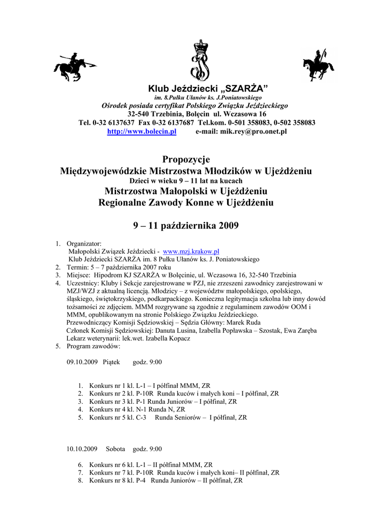 Bolęcin, ul. Wczasowa 32-540 Trzebinia tel/fax 0-32 6137637 http//: www.zamek.com.pl/konie e-mail: [email protected] Bolęcin, dnia 16.stycznia 2001 Klub Jeździecki „SZARŻA” im. 8.Pułku Ułanów ks. J.Poniatowskiego Ośrodek posiada certyfikat Polskiego Związku Jeździeckiego 32-540 Trzebinia, Bolęcin ul. Wczasowa 16 Tel. 0-32 6137637 Fax 0-32 6137687 Tel.kom. 0-501 358083, 0-502 358083 http://www.bolecin.pl e-mail: [email protected] Szanowni Państwo, Propozycje Międzywojewódzkie Mistrzostwa Młodzików w Ujeżdżeniu Dzieci w wieku 9 – 11 lat na kucach Mistrzostwa Małopolski w Ujeżdżeniu Regionalne Zawody Konne w Ujeżdżeniu 9 – 11 października 2009 1. Organizator: Małopolski Związek Jeździecki - www.mzj.krakow.pl Klub Jeździecki SZARŻA im. 8 Pułku Ułanów ks. J. Poniatowskiego 2. Termin: 5 – 7 października 2007 roku 3. Miejsce: Hipodrom KJ SZARŻA w Bolęcinie, ul. Wczasowa 16, 32-540 Trzebinia 4. Uczestnicy: Kluby i Sekcje zarejestrowane w PZJ, nie zrzeszeni zawodnicy zarejestrowani w MZJ/WZJ z aktualną licencją. Młodzicy – z województw małopolskiego, opolskiego, śląskiego, świętokrzyskiego, podkarpackiego. Konieczna legitymacja szkolna lub inny dowód tożsamości ze zdjęciem. MMM rozgrywane są zgodnie z regulaminem zawodów OOM i MMM, opublikowanym na stronie Polskiego Związku Jeździeckiego. Przewodniczący Komisji Sędziowskiej – Sędzia Główny: Marek Ruda Członek Komisji Sędziowskiej: Danuta Lusina, Izabella Popławska – Szostak, Ewa Zaręba Lekarz weterynarii: lek.wet. Izabella Kopacz 5. Program zawodów: 09.10.2009 Piątek 1. 2. 3. 4. 5. godz. 9:00 Konkurs nr 1 kl. L-1 – I półfinał MMM, ZR Konkurs nr 2 kl. P-10R Runda kuców i małych koni – I półfinał, ZR Konkurs nr 3 kl. P-1 Runda Juniorów – I półfinał, ZR Konkurs nr 4 kl. N-1 Runda N, ZR Konkurs nr 5 kl. C-3 Runda Seniorów – I półfinał, ZR 10.10.2009 Sobota godz. 9:00 6. Konkurs nr 6 kl. L-1 – II półfinał MMM, ZR 7. Konkurs nr 7 kl. P-10R Runda kuców i małych koni– II półfinał, ZR 8. Konkurs nr 8 kl. P-4 Runda Juniorów – II półfinał, ZR 9. Konkurs nr 9 kl. N-6 Runda N, ZR 10. Konkurs nr 10 kl. C-4 Runda Seniorów – II półfinał, ZR 11.10.2009 Niedziela godz. 9:00 11. 12. 13. 14. 15. Konkurs nr 3 kl. L-2 – finał MMM, ZR Konkurs nr 11 kl. P-8 Runda kuców i małych koni – Finał, ZR Konkurs nr 12 kl. P-5 (pr. dow. z muzyką) Runda Juniorów – Finał, ZR Konkurs nr 14 kl. N-4 (pr. dow. z muzyką) Runda N, ZR Konkurs nr 15 kl. C-6 (pr. dow. z muzyką) Runda Seniorów – Finał, ZR Konkursy Mistrzostw Małopolski Młodzików (dzieci 9–11 lat, na kucach) 1. Pierwszy półfinał – 2. Drugi półfinał – 3. Finał MMM – Konkurs nr 1 kl. L-1 Konkurs nr 2 kl. L-1 Konkurs nr 3 kl. L-2 Konkursy Mistrzostw Małopolski 1. Runda Kuców i małych koni - juniorzy do 18 lat –I półfinał P-10R, II półfinał P-10R, Finał P-8 2. Runda Juniorów (duże konie) - juniorzy do 18 lat – I półfinał P-1, II półfinał P-4, Finał P-5 3. Runda N (juniorzy i seniorzy)I półfinał N-1, II półfinał N-6, Finał N-4 4. Runda Seniorów – I półfinał C-3, II półfinał C-4, Finał C-6 Zawody Regionalne: L-1, L-2, P-10R (kuce), P-8 (kuce), P-1, P-4, P-5, N-1, N-6, N-4, C-3, C-4, C-6 . Konkursy maja charakter otwarty, maja w nich prawo startu konie duże i kuce. 6. Warunki techniczne: Czworobok konkursowy o wymiarach 20 x 40 i 20 x 60 m, podłoże piaskowe. Rozprężalnia otwarta 60 x 70 m (piasek) oraz hala 22 x 62 m 7. Boksy oraz stanowiska dla koni w stajniach KJ Szarża obok hali (liczba miejsc ograniczona, decyduje kolejność zgłoszeń). 8. Opłaty: opłata organizacyjna 90 zł od konia za Mistrzostwa , 30 zł od konia/dzień za Zawody Regionalne, boks (całe zawody) – 180 zł 9. Podłączenie do prądu (koniowóz, przyczepa kempingowa) – 50 zł/zawody 10. Organizator zapewnia pierwszą ściółkę. Paszę (siano i pasze treściwą) należy przywieźć ze sobą. 11. Noclegi i wyżywienie na terenie Ośrodka Klubu Jeździeckiego SZARŻA Nocleg – 30 zł, śniadanie 5 zł, obiad 15 zł, kolacja 5 zł. Należy zabrać śpiwory! Na terenie zawodów czynny będzie bufet z napojami i przekąskami. Ponadto możliwość rezerwacji noclegów w Hotelu MOKSiR w Chrzanowie (ok. 6 km) , telefon 0-32 623-35-66 lub Motel „LECH” w Młoszowej (ok. 10 km) tel. 0 – 32 6278108. Rezerwacja we własnym zakresie! 12. Uczestnikami Mistrzostw mogą być zawodnicy zarejestrowani w Małopolskim Związku Jeździeckim, zrzeszeni w klubach zarejestrowanych w MZJ lub bez przynależności klubowej. Zawodnicy nie zarejestrowani w MZJ będą klasyfikowani w konkursach i otrzymają nagrody rzeczowe lecz nie będą uwzględnieni w klasyfikacji medalowej. 13. Koń, aby startować w zawodach regionalnych musi mieć opłaconą roczną opłatę rejestracyjną wg cennika swojego WZJ. Licencja roczna szczebla centralnego konia nie upoważnia do startu w zawodach regionalnych. 14. Organizator zapewnia floots dla zwycięskich koni, a dla zawodników dyplomy i nagrody – upominki. Dla uczestników Mistrzostw medale i puchary 15. Zgłoszenia do dnia 30.09.2009 należy nadsyłać listownie, faksem lub pocztą elektroniczną do Klubu Jeździeckiego SZARŻA w Bolęcinie (dane teleadresowe w nagłówku) 16. Obowiązuje aktualna dokumentacja zgodna z przepisami PZJ/MZJ i weterynaryjnymi, dla kuców obowiązuje aktualny certyfikat wzrostu wystawiony przez uprawnionego lekarza wet. 17. Przyjazd Ekip we czwartek 8.10.2009 do godziny 17:00 18. Zebranie techniczne oraz losowanie kolejności startu o godzinie 20:00 w dniu 8.10.2009 19. W rundzie N maja prawo startu zawodnicy posiadający III licencję A wszystkich grup wiekowych (z wyjątkiem młodzików), przyznane zostaną nagrody, medale i tytuły Mistrza i Wicemistrzów Małopolski w klasie N. 20. Organizator zastrzega sobie prawo do zmian w programie zawodów dot. godzin rozpoczęcia poszczególnych konkursów. 