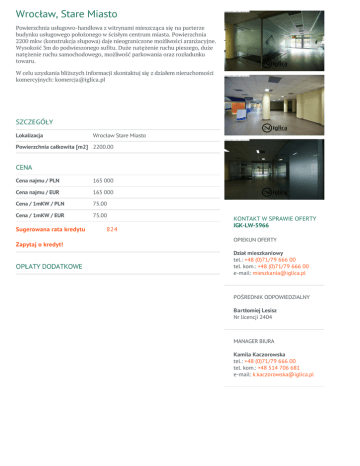 Wrocław, Stare Miasto Powierzchnia usługowo-handlowa z witrynami mieszcząca się na parterze budynku usługowego położonego w ścisłym centrum miasta. Powierzchnia 2200 mkw (konstrukcja słupowa) daje nieograniczone możliwości aranżacyjne. Wysokość 3m do podwieszonego sufitu. Duże natężenie ruchu pieszego, duże natężenie ruchu samochodowego, możliwość parkowania oraz rozładunku towaru. W celu uzyskania bliższych informacji skontaktuj się z działem nieruchomości komercyjnych: [email protected] SZCZEGÓŁY Lokalizacja Wrocław Stare Miasto Powierzchnia całkowita [m2] 2200.00 CENA Cena najmu / PLN 165 000 Cena najmu / EUR 165 000 Cena / 1mKW / PLN 75.00 Cena / 1mKW / EUR 75.00 Sugerowana rata kredytu Zapytaj o kredyt! OPŁATY DODATKOWE 824 KONTAKT W SPRAWIE OFERTY IGK-LW-5966 OPIEKUN OFERTY Dział mieszkaniowy tel.: +48 (0)71/79 666 00 tel. kom.: +48 (0)71/79 666 00 e-mail: [email protected] POŚREDNIK ODPOWIEDZIALNY Bartłomiej Lesisz Nr licencji 2404 MANAGER BIURA Kamila Kaczorowska tel.: +48 (0)71/79 666 00 tel. kom.: +48 514 706 681 e-mail: [email protected]