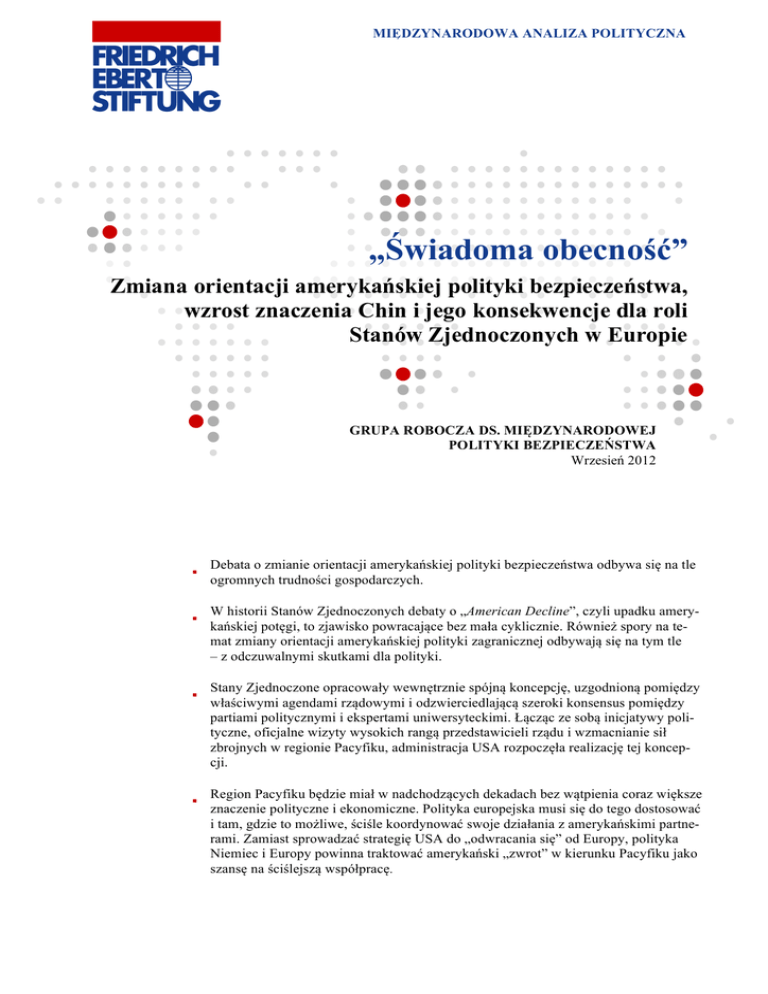 MIĘDZYNARODOWA ANALIZA POLITYCZNA „Świadoma obecność” Zmiana orientacji amerykańskiej polityki bezpieczeństwa, wzrost znaczenia Chin i jego konsekwencje dla roli Stanów Zjednoczonych w Europie GRUPA ROBOCZA DS. MIĘDZYNARODOWEJ POLITYKI BEZPIECZEŃSTWA Wrzesień 2012 Debata o zmianie orientacji amerykańskiej polityki bezpieczeństwa odbywa się na tle ogromnych trudności gospodarczych. W historii Stanów Zjednoczonych debaty o „American Decline”, czyli upadku amerykańskiej potęgi, to zjawisko powracające bez mała cyklicznie. Również spory na temat zmiany orientacji amerykańskiej polityki zagranicznej odbywają się na tym tle – z odczuwalnymi skutkami dla polityki. Stany Zjednoczone opracowały wewnętrznie spójną koncepcję, uzgodnioną pomiędzy właściwymi agendami rządowymi i odzwierciedlającą szeroki konsensus pomiędzy partiami politycznymi i ekspertami uniwersyteckimi. Łącząc ze sobą inicjatywy polityczne, oficjalne wizyty wysokich rangą przedstawicieli rządu i wzmacnianie sił zbrojnych w regionie Pacyfiku, administracja USA rozpoczęła realizację tej koncepcji. Region Pacyfiku będzie miał w nadchodzących dekadach bez wątpienia coraz większe znaczenie polityczne i ekonomiczne. Polityka europejska musi się do tego dostosować i tam, gdzie to możliwe, ściśle koordynować swoje działania z amerykańskimi partnerami. Zamiast sprowadzać strategię USA do „odwracania się” od Europy, polityka Niemiec i Europy powinna traktować amerykański „zwrot” w kierunku Pacyfiku jako szansę na ściślejszą współpracę. GRUPA ROBOCZA DS. MIĘDZYNARODOWEJ POLITYKI BEZPIECZEŃSTWA | „ŚWIADOMA OBECNOŚĆ” 1. Wstęp obciążeń w łonie NATO, na porządek dzienny wysuwa się w ten sposób również zasadnicze zagadnienie przyszłego charakteru stosunków transatlantyckich. Nie po raz pierwszy Berlin sceptycznie spogląda na amerykańską politykę wobec regionu Pacyfiku. Już w 1968 roku ówczesny kandydat na kanclerza Willy Brandt podczas wizyty w Waszyngtonie nie ukrywał, że z nieufnością śledzi przesuwanie się interesów Stanów Zjednoczonych z Europy do Azji i że obawia się ograniczenia amerykańskiego zaangażowania w Europie (Judith 2010, s. 282). Przemyślenia dotyczące polityki zagranicznej, które nie dawały spokoju Willy’emu Brandtowi, wydają się dziś zadziwiająco aktualne, amerykańska polityka bezpieczeństwa znajduje się bowiem w fazie przełomu. Wzrost znaczenia krajów o gospodarkach wschodzących, takich jak Chiny, kryzys w Europie oraz utrzymujące się ograniczenia finansowe zmuszają Stany Zjednoczone do zmiany kierunku ich polityki i bardziej precyzyjnej alokacji kurczących się środków. Wykazując rzadką zgodność, think tanki zarówno republikańskiej jak i demokratycznej proweniencji zalecają przeorientowanie amerykańskiej polityki zagranicznej w kierunku Azji. Przedstawione w styczniu 2012 roku przez prezydenta Baracka Obamę nowe wytyczne w zakresie polityki obronnej podchwytują wiele impulsów wychodzących z debaty akademickiej – odnawiają bowiem amerykańskie mocarstwowe aspiracje w regionie i potwierdzają wierność wobec azjatyckich sojuszników Ameryki. Ponadto, za sprawą budzącego rozgłos przemówienia w Canberze, prezydent USA także symbolicznie podkreślił polityczne znaczenie swojej nowej strategii. W niniejszej analizie na wstępie szkicujemy pokrótce najważniejsze elementy nowej amerykańskiej polityki i oceniamy je w kontekście sytuacji wewnątrzpolitycznej w Stanach Zjednoczonych, silnie naznaczonej przez utrzymujący się kryzys gospodarczy. Aby móc odpowiednio uporządkować debatę, w krótkiej retrospektywie historycznej przedstawimy polityczną i wojskową rolę Stanów Zjednoczonych w regionie Pacyfiku. Tematem części końcowej są rekomendacje dla polityki niemieckiej. Czy USA rzeczywiście odwracają się od Europy? Jak duża jest ich zdolność strategiczna? Jakie punkty zaczepienia istnieją dla kooperacji transatlantyckiej? Czy Europa pragnie być aktorem, czy tez może komentującym widzem? Czy w regionie Pacyfiku istnieją oczekiwania wobec Europy? Jaką rolę w osiąganiu celów polityki bezpieczeństwa odgrywa czynnik militarny? 2. Tło polityczne W dziejach Stanów Zjednoczonych debaty na temat „American Decline”, czyli kurczenia się amerykańskiej potęgi, to już zjawisko cykliczne. Również spory o zmianę kierunku amerykańskiej polityki zagranicznej toczą się właśnie na tym tle – z poważnymi konsekwencjami dla polityki. Najbardziej znanym przykładem dominującego obecnie „dyskursu o upadku” jest najnowsza książka Toma Friedmana, autora stałej rubryki w „New York Times” i Michaela Mandelbauma, profesora Uniwersytetu Johna Hopkinsa (Friedman i Mandelbaum 2011). Ich analiza przyczyn kryzysu – takich jak brak inwestycji, niepohamowane zużycie energii, niekontrolowany deficyt budżetowy i sparaliżowane struktury polityczne w Waszyngtonie – dostała się na listy bestsellerów. Mimo tej miażdżącej krytyki obecnej sytuacji autorzy uważają, że dominująca pozycja Ameryki w świecie może zostać utrzymana, jeśli Waszyngton znajdzie siłę na głębokie reformy. Robert Kagan z Brookings Institution, który zdążył już awansować do rangi doradcy Mitta Romneya, zdecydowanie zaprzecza w swojej najnowszej książce (Kagan 2012) tezie o upadku i kreśli mroczny scenariusz na wypadek, gdy Stany Zjednoczone jako „dobrotliwy” hegemon zejdą ze światowej sceny. Już w samej debacie o upadku Ameryki Kagan widzi fatalny sygnał słabości. Za istotny powód konieczności rezygnacji z dominującej pozycji Ameryki Kagan nie potrafi uznać ani rosnącego znaczenia Chin, ani obciążenia Nowa polityka Ameryki wywołała w Europie mieszane reakcje. Pojawiająca się nieustannie powierzchowna interpretacja amerykańskiej strategii – jakoby Ameryka odwracała się od Europy – przy dokładniejszej analizie nie da 