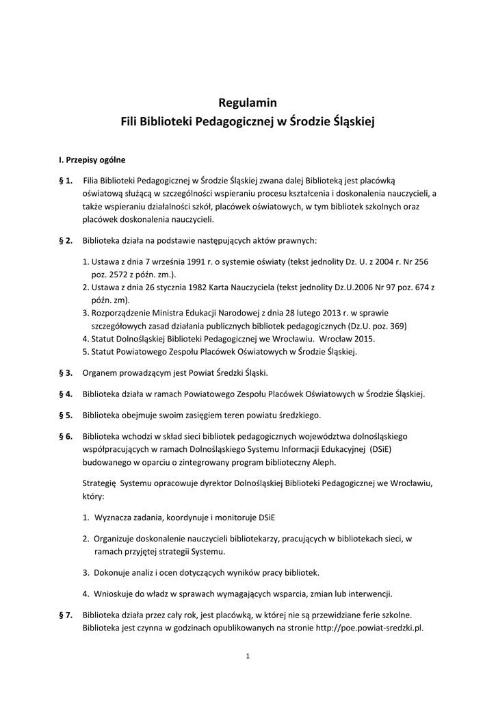 Regulamin Fili Biblioteki Pedagogicznej w Środzie Śląskiej